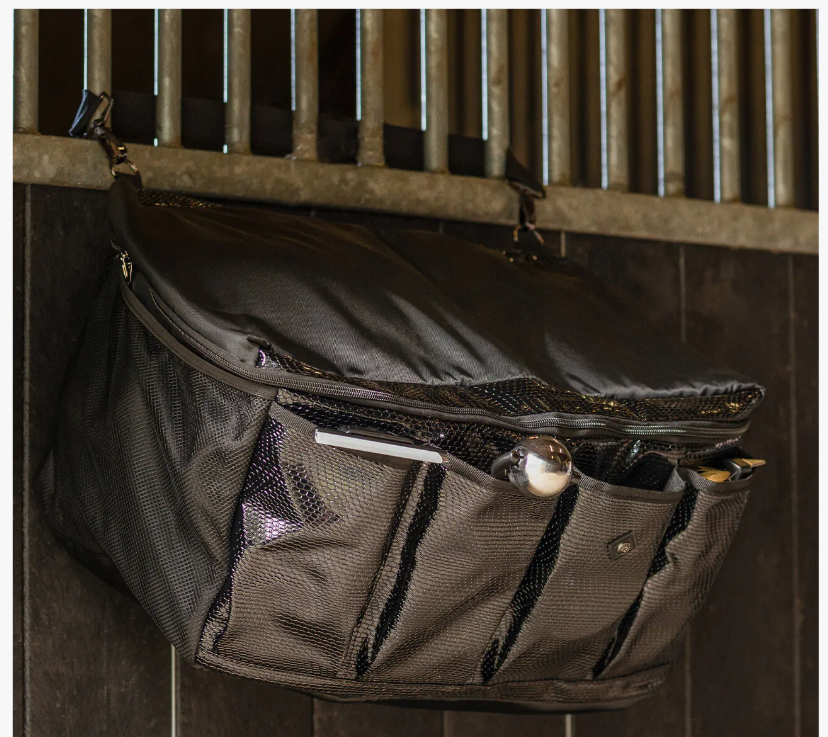 TrĂšs pratique Ă lâĂ©curie, il peut ĂȘtre suspendu facilement grĂące Ă sa sangle de suspension incluse, permettant un accĂšs rapide sans encombrer le sol. Les poches en filet latĂ©rales offrent un rangement supplĂ©mentaire, tandis que la poche frontale zippĂ©e, dĂ©corĂ©e dâun badge QHP en silicone, permet de sĂ©curiser les petits objets.