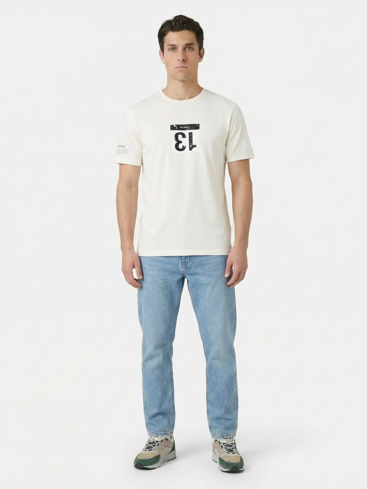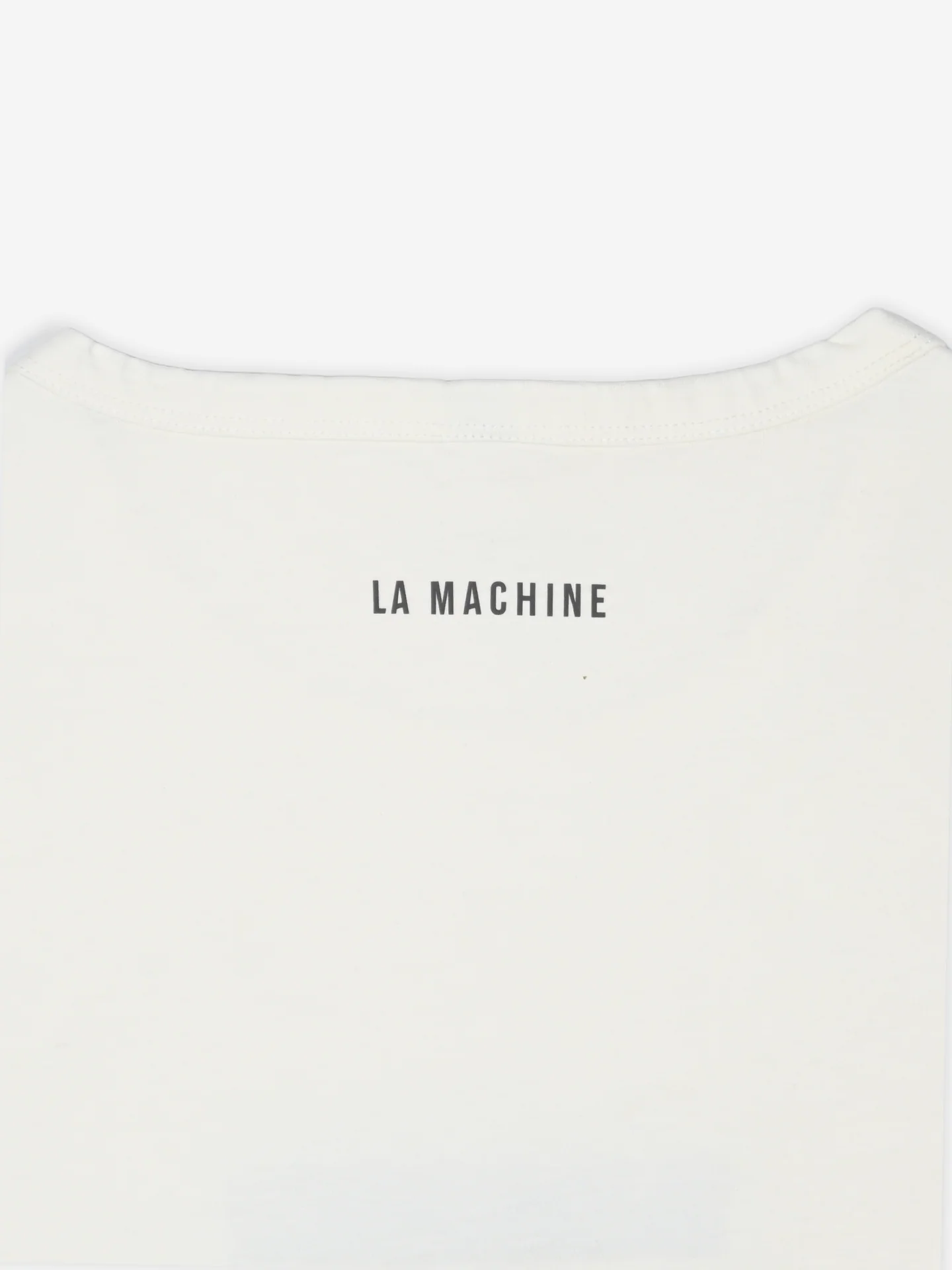 There’s something about an off-white tee — like the calm before the storm. But look closer and you’ll spot a rebel detail: Bib number 13, pinned upside down. A nod to the oldest superstition in the peloton.
