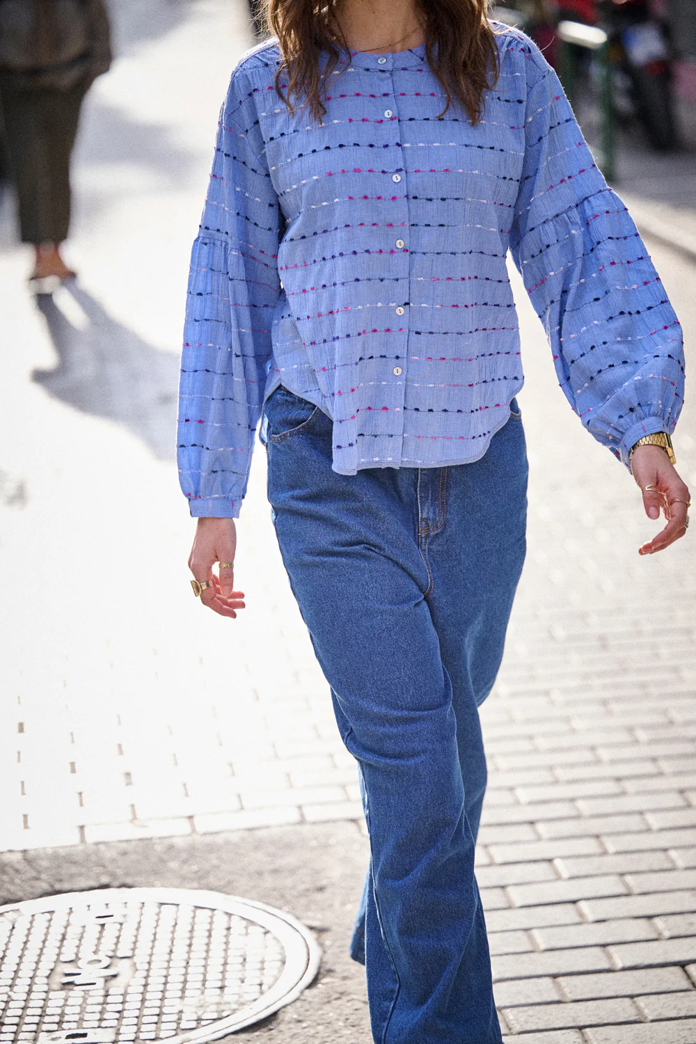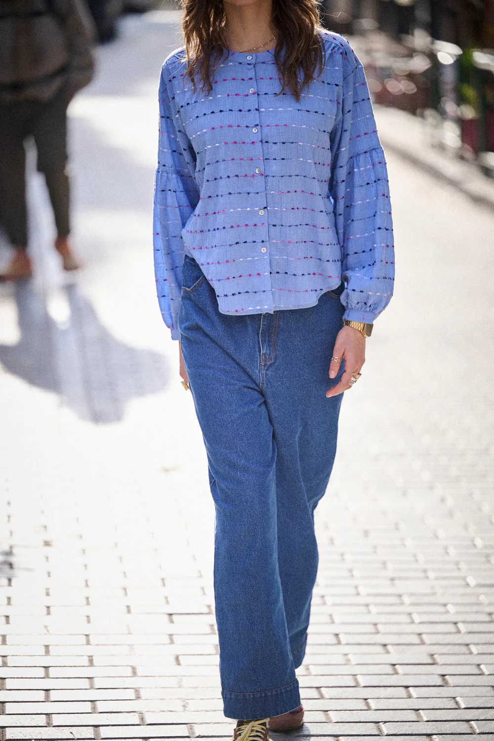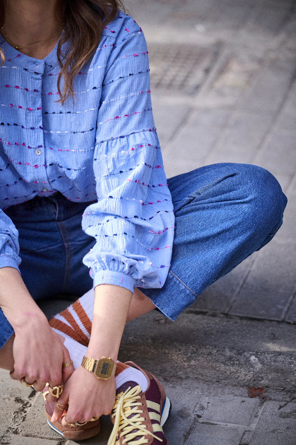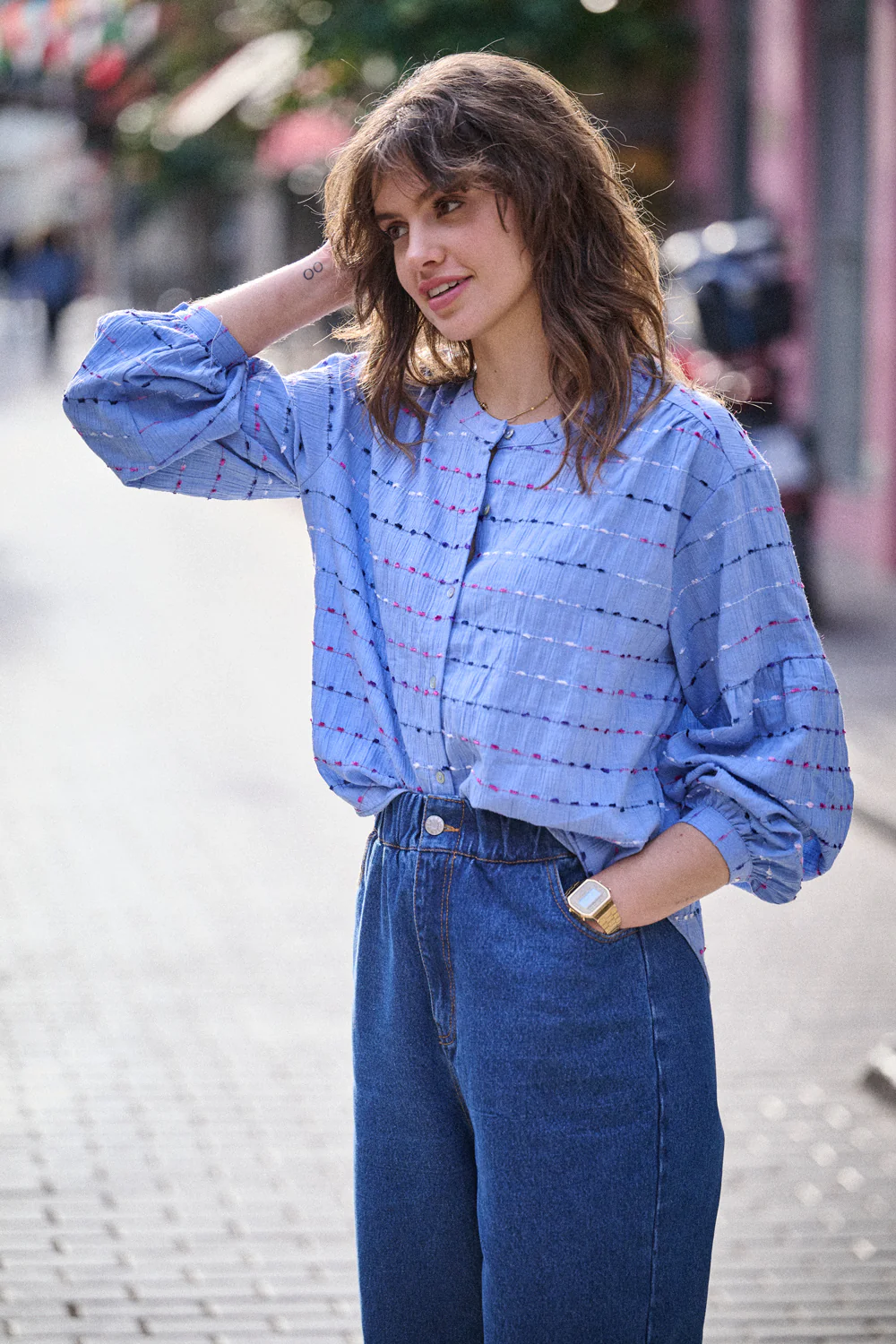Son coton léger et texturé apporte une vraie tenue, sans raideur. Elle est traversée de petites lignes brodées multicolores comme tracées à la main. C’est simple, c’est doux, et ça a du style.