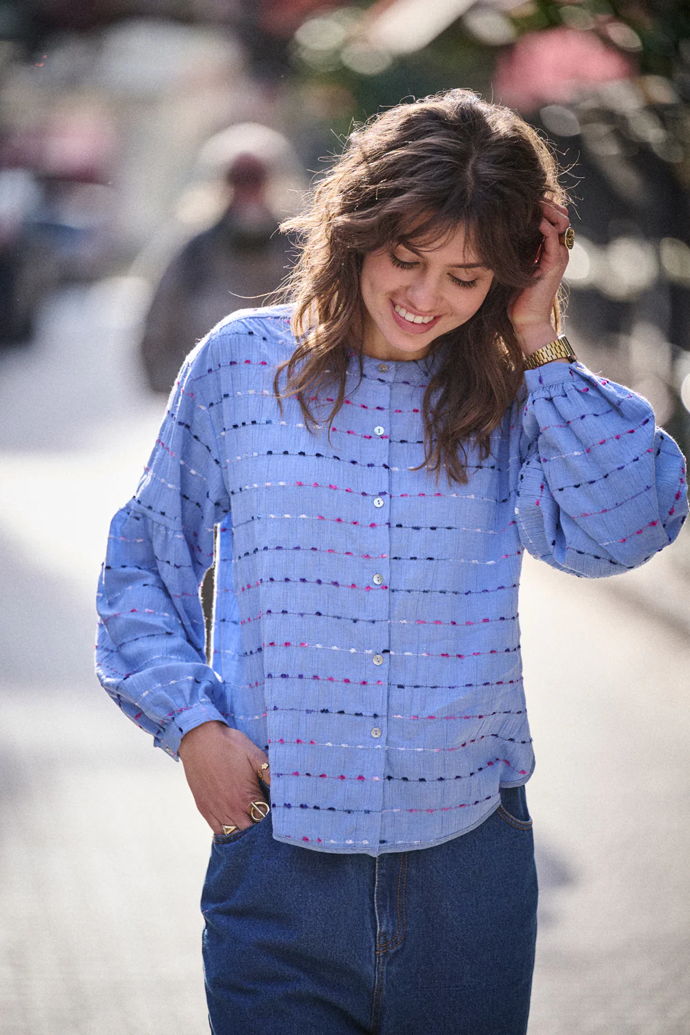 Blouse Bamba bleuePièce originale, imaginée et développée à Paris par Laure, Lulu et Nora. Découvrez notre Studio de Création. Volume souple, matière gaufrée, détails brodés, cette chemise coche toutes les bonnes cases.Son coton léger et texturé apporte une vraie tenue, sans raideur. Elle est traversée de petites lignes brodées multicolores comme tracées à la main. […]