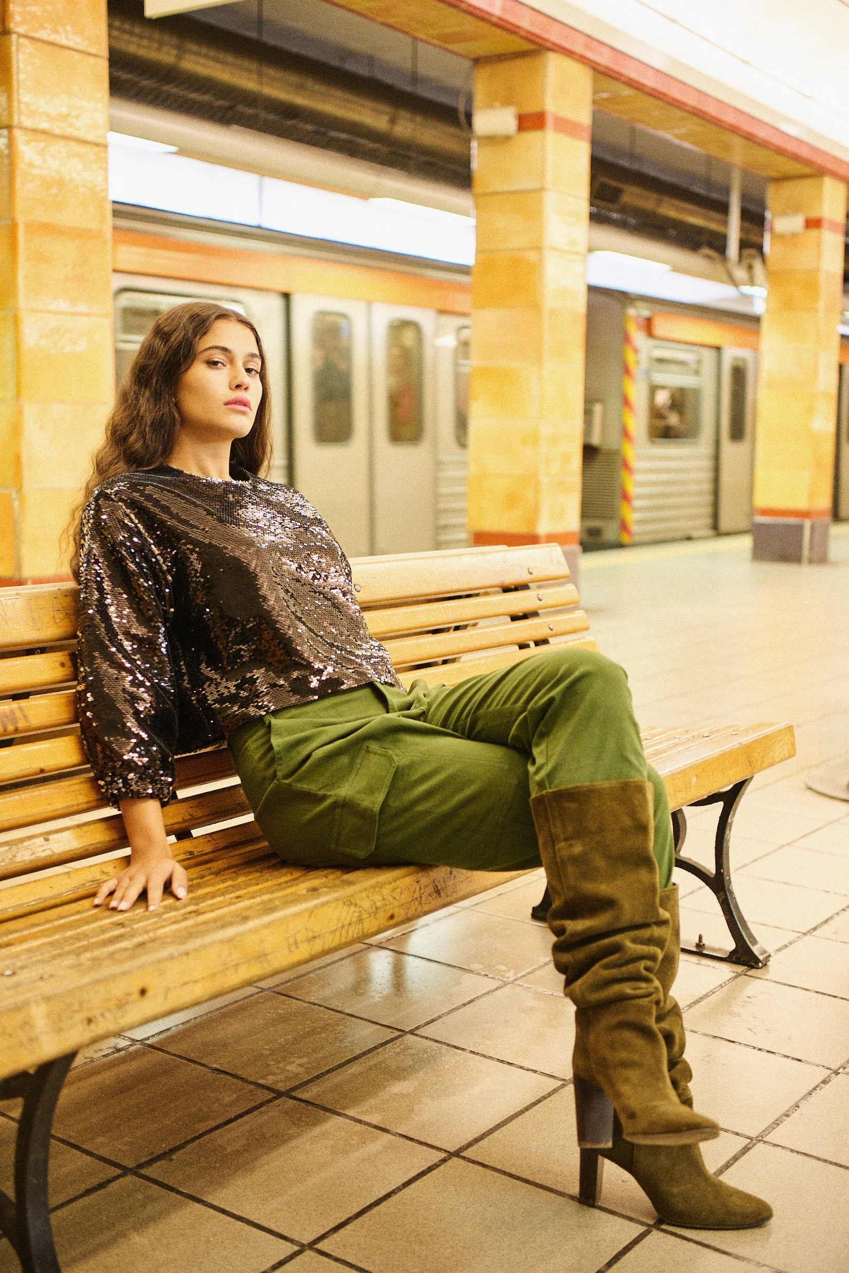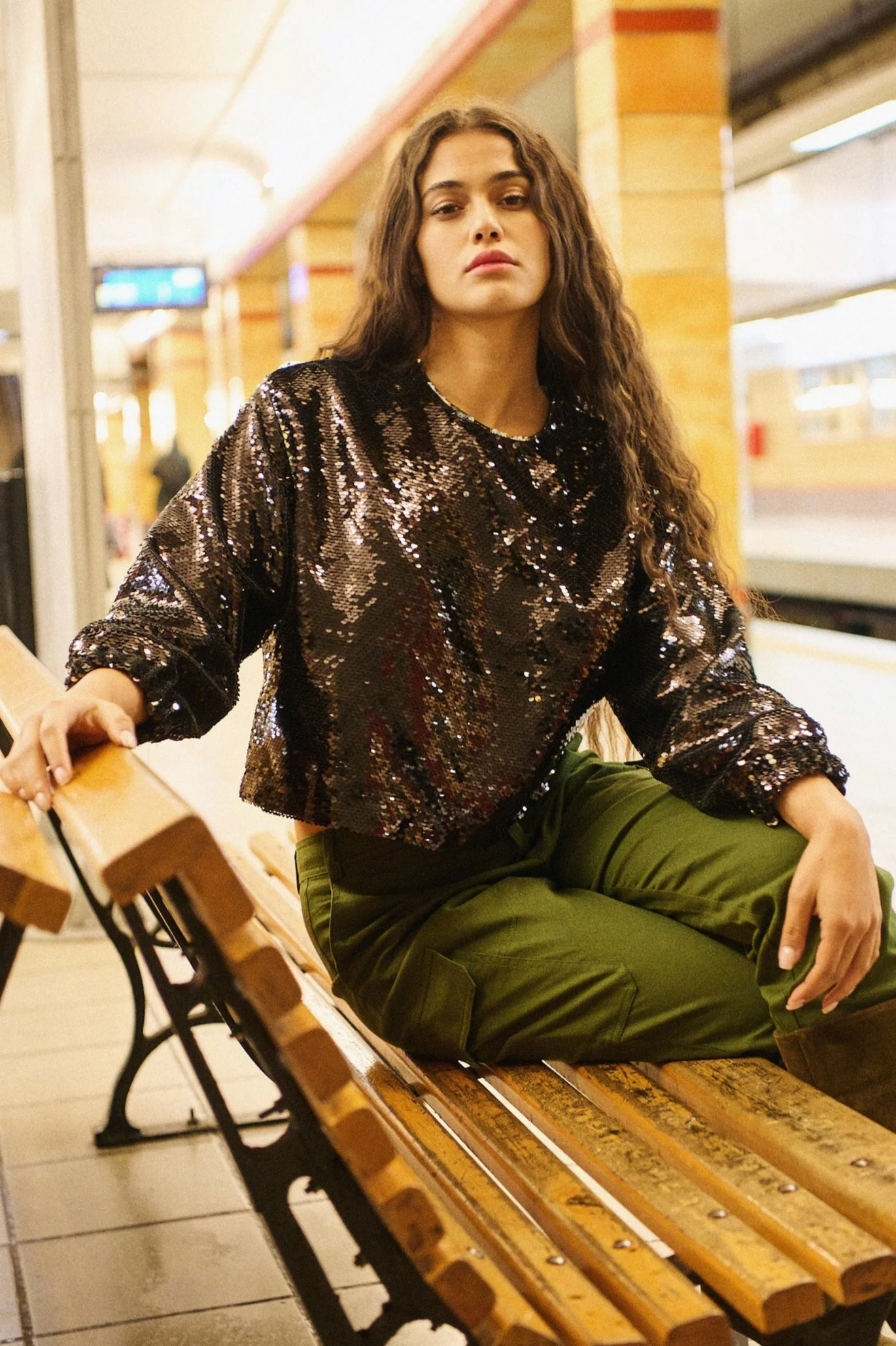 Elle porte la blouse Basile à sequins avec le pantalon Piero kaki.