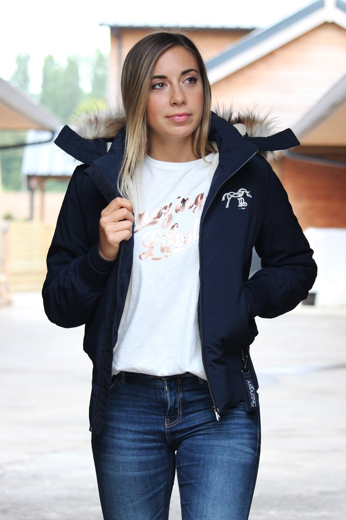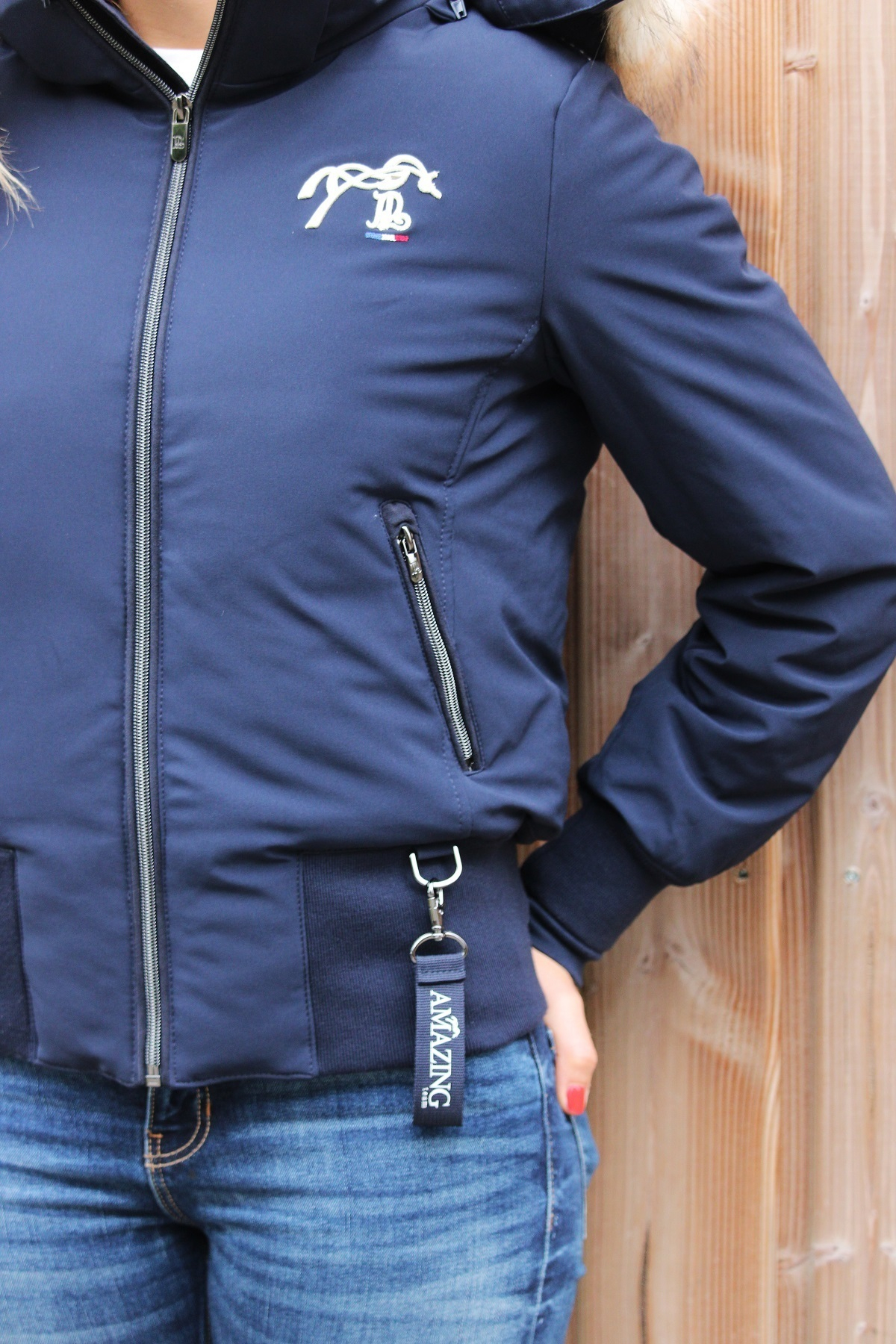 Le blouson Step bleu marine Pénélope est idéal pour les cavalières qui veulent protection contre le froid et look élégant, que ce soit aux écuries ou en ville.