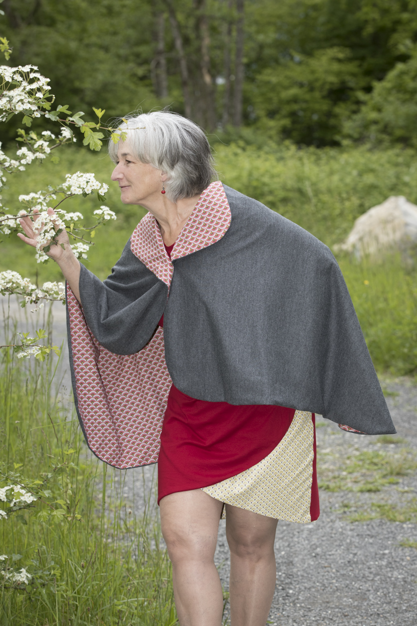 Cette cape est parfaite pour ajouter une couche supplémentaire à votre tenue, couvrir vos épaules pour éviter des courants d’air ou apporter la chaleur qui vous manque avec son lainage et sa doublure aux couleurs de vos préférences. Jouez avec les revers du col qui se forment lorsque vous la fermez, pour rajouter plus ou moins de la couleur, en laissant apercevoir la belle étoffe aux écailles stylisées, ou ouverte comme un grand châle.