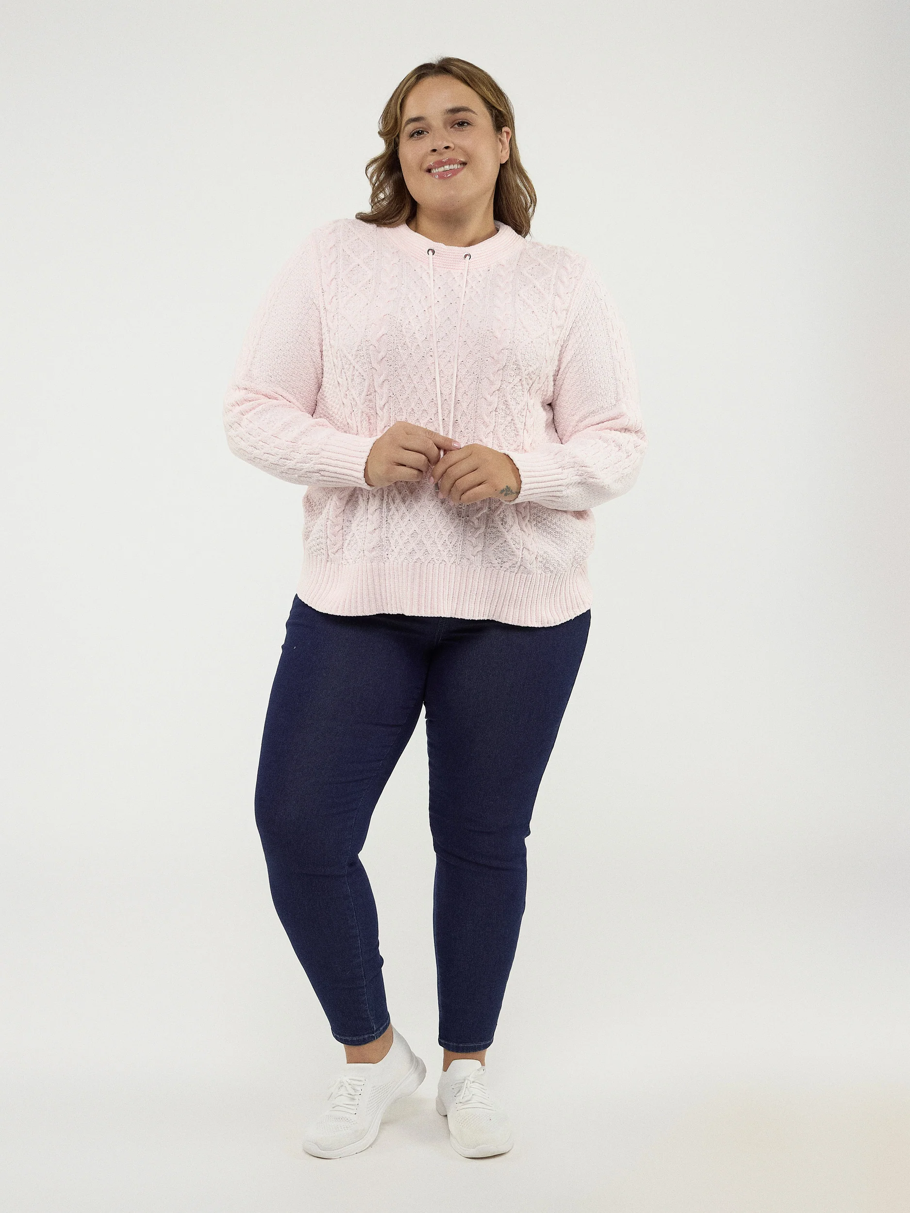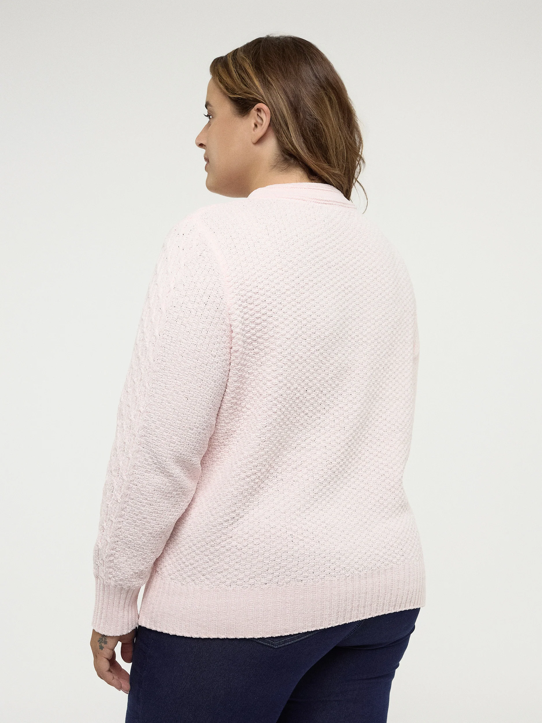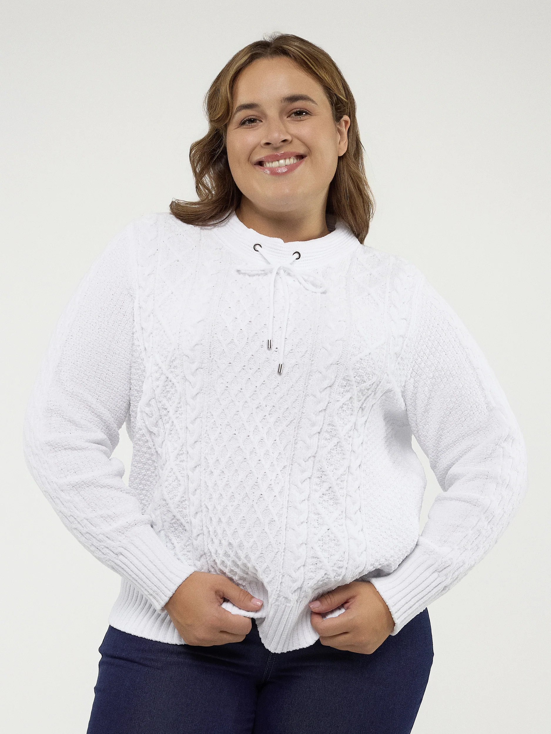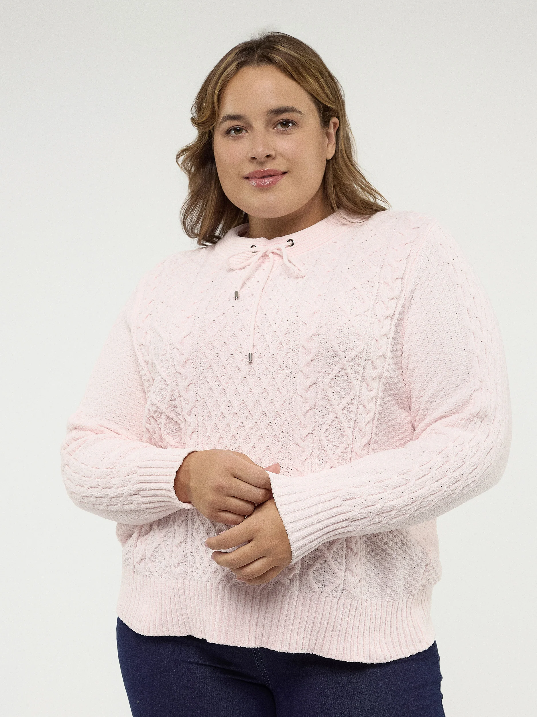 Ce pull taille plus à torsades et col à cordon réinvente le style chaleureux avec une touche moderne. Disponible en blanc lumineux ou rose délicat, il allie douceur et confort pour un hiver tout en élégance.