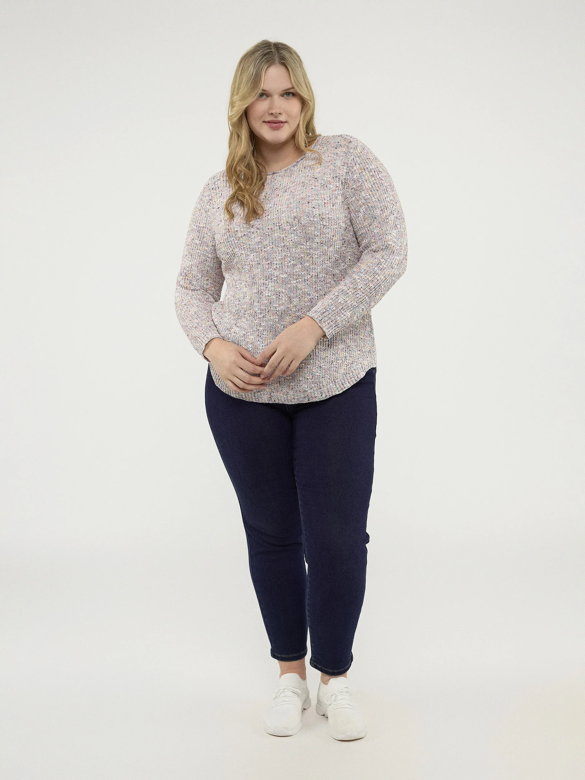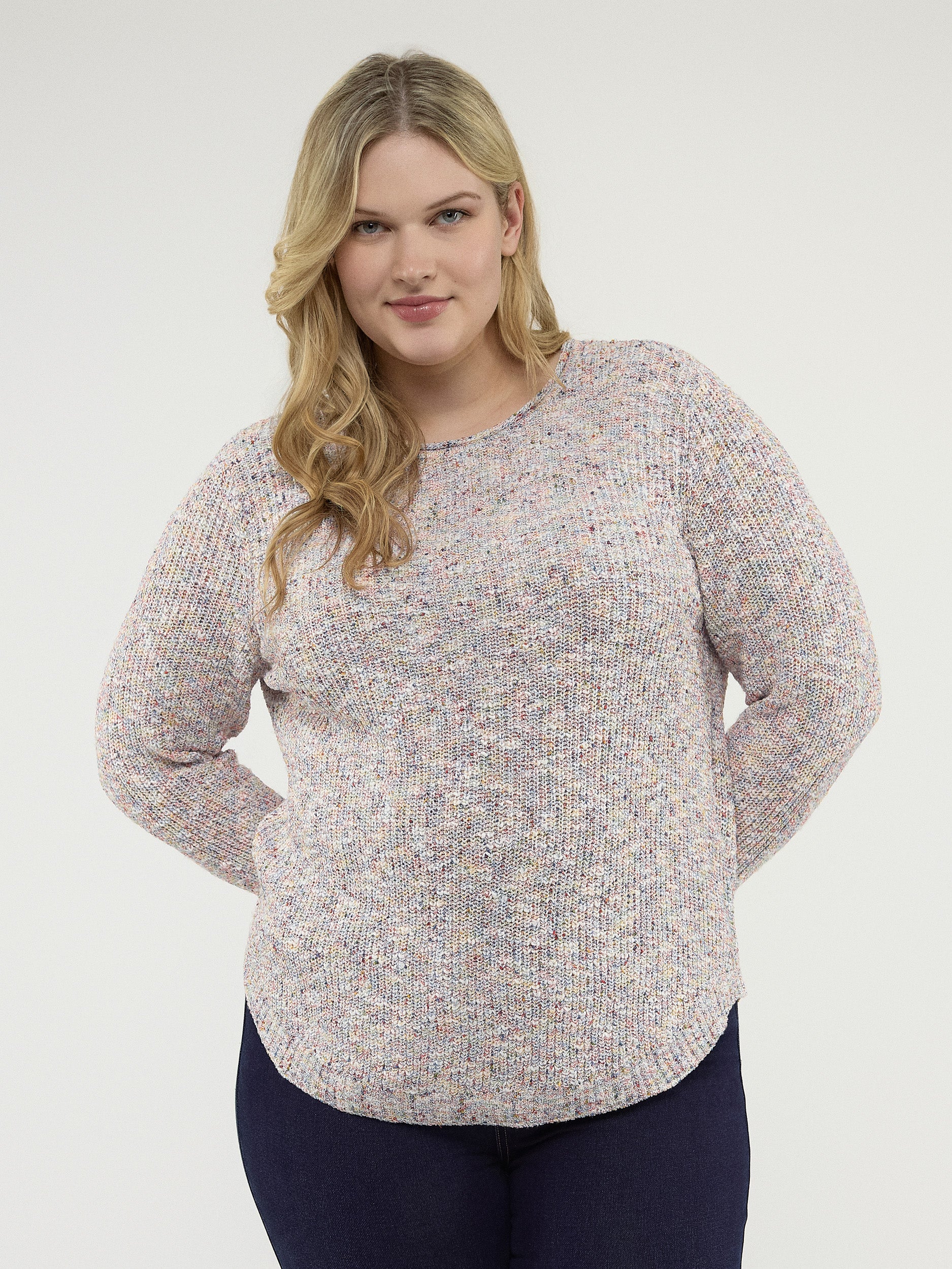 Ce pull taille plus, avec ses nuances pastel subtilement chinées, est un véritable cocon de douceur. Sa coupe fluide met en valeur les courbes avec élégance, tout en vous gardant bien au chaud. Parfait pour égayer vos tenues!