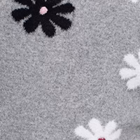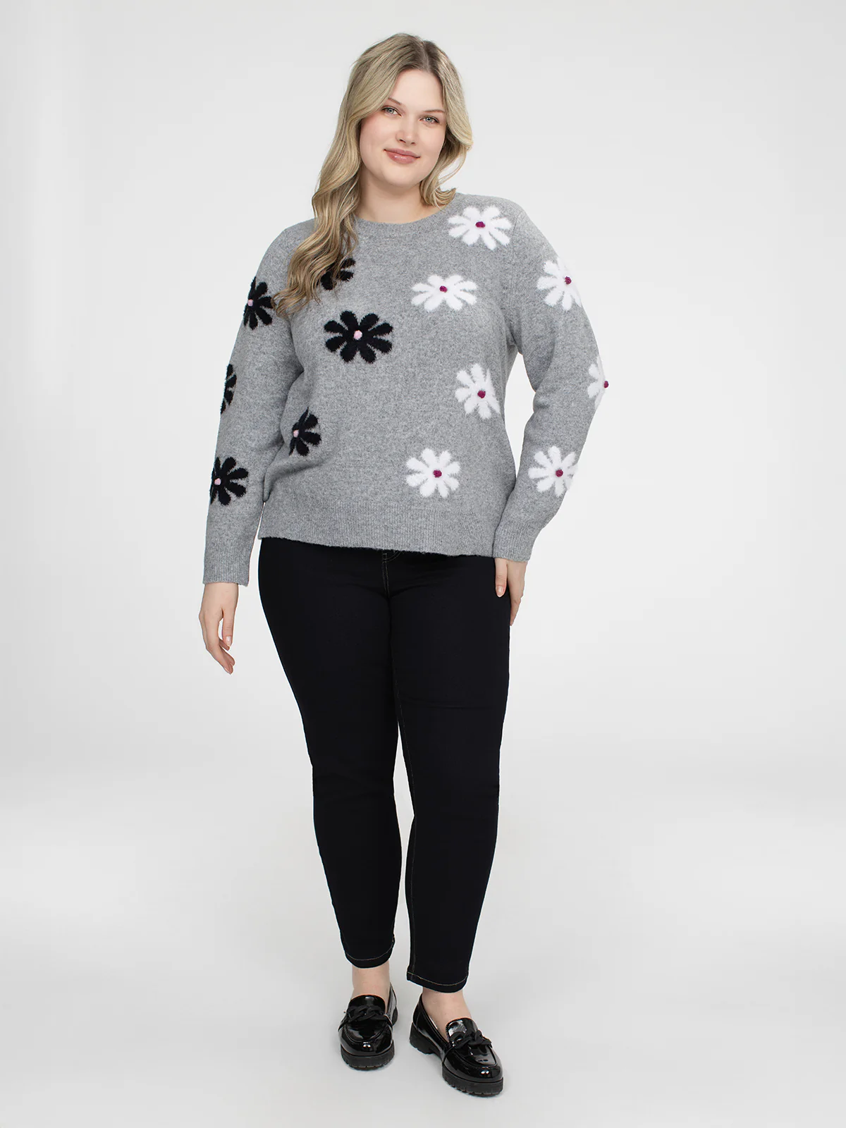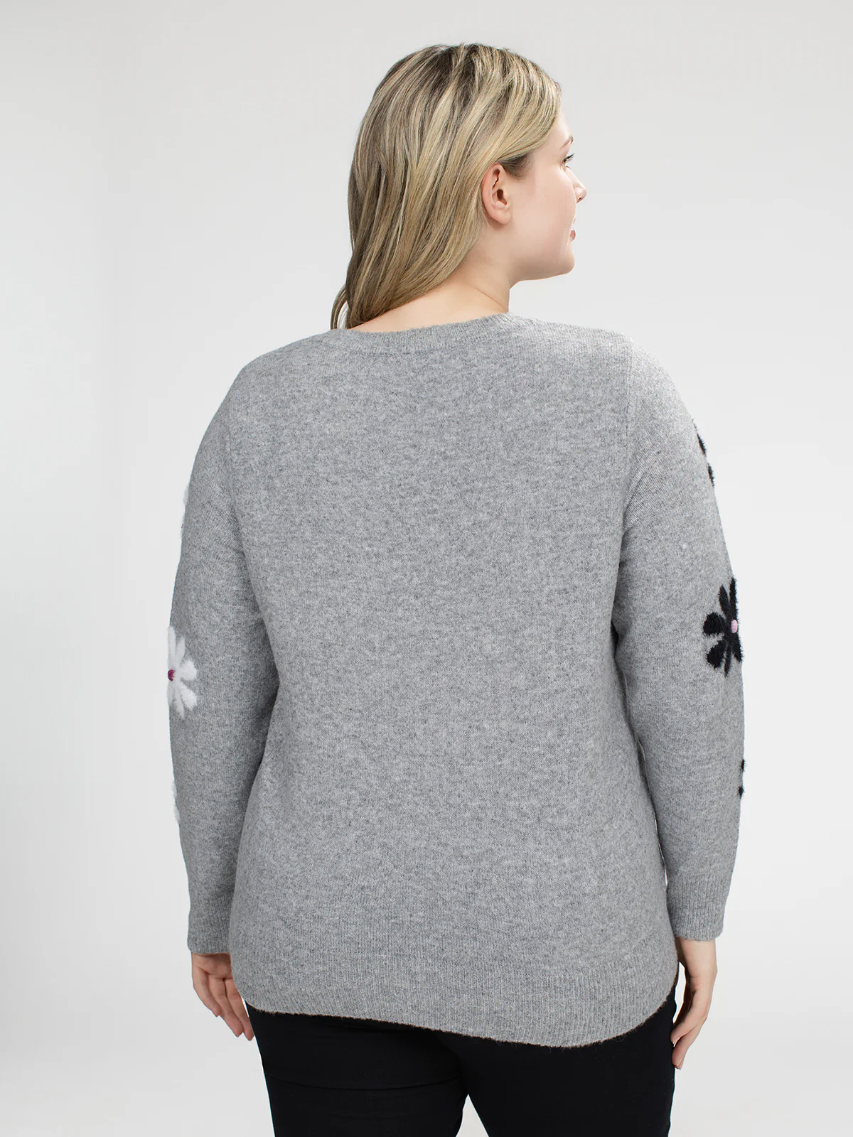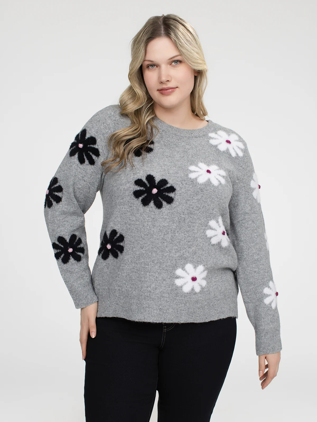 Chandail taille plus à coupe semi-ajustée, col rond et manches longues montées. Le tricot gris est orné de motifs floraux contrastants répartis à l’avant et sur les manches.