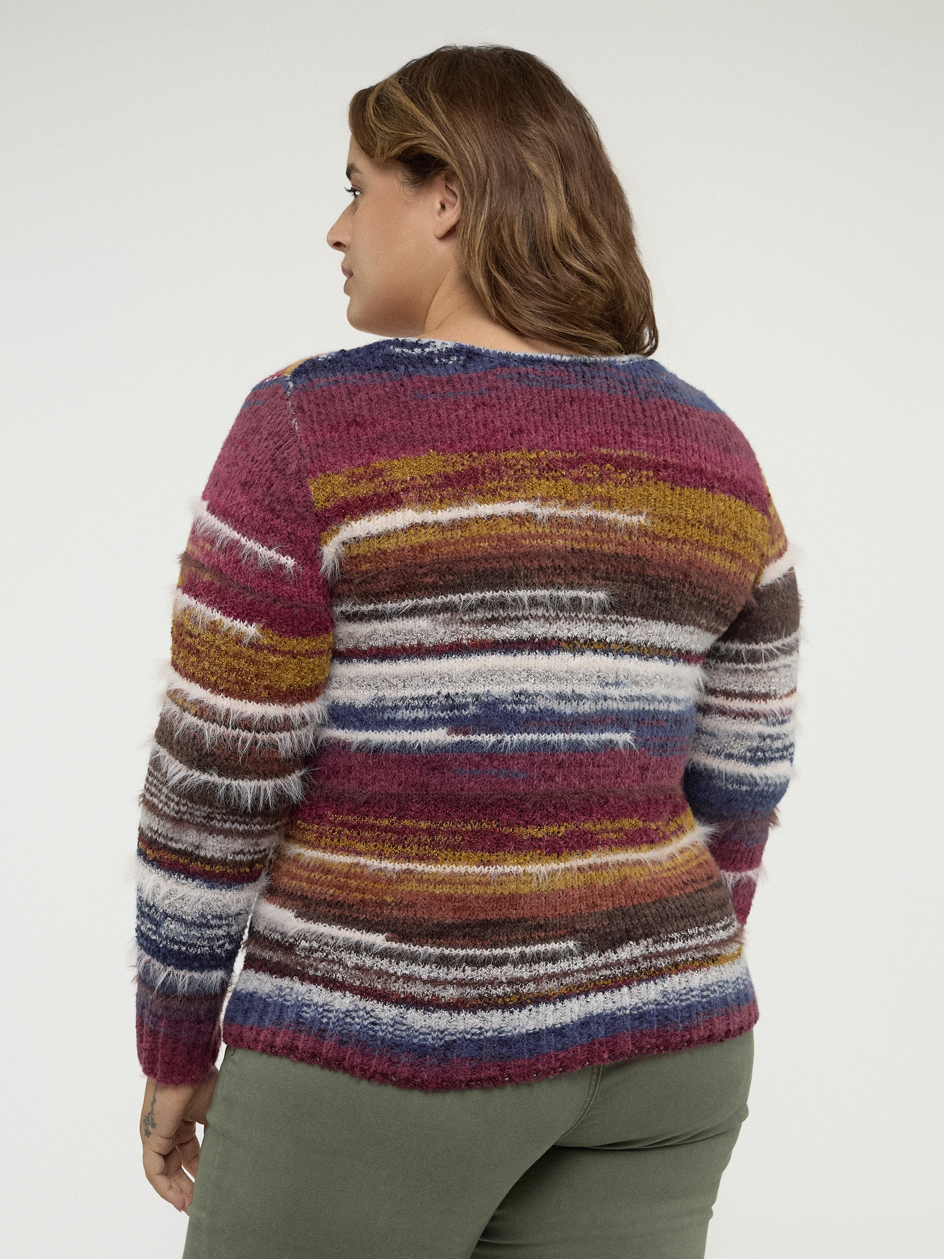 Ce pull à col rond en taille plus se démarque par son mélange vibrant de couleurs automnales, allant du bordeaux au bleu, parfait pour égayer les journées froides. Sa matière douce et texturée apporte une touche chaleureuse et réconfortante. Avec son design rayé, il flatte la silhouette tout en offrant une allure moderne.