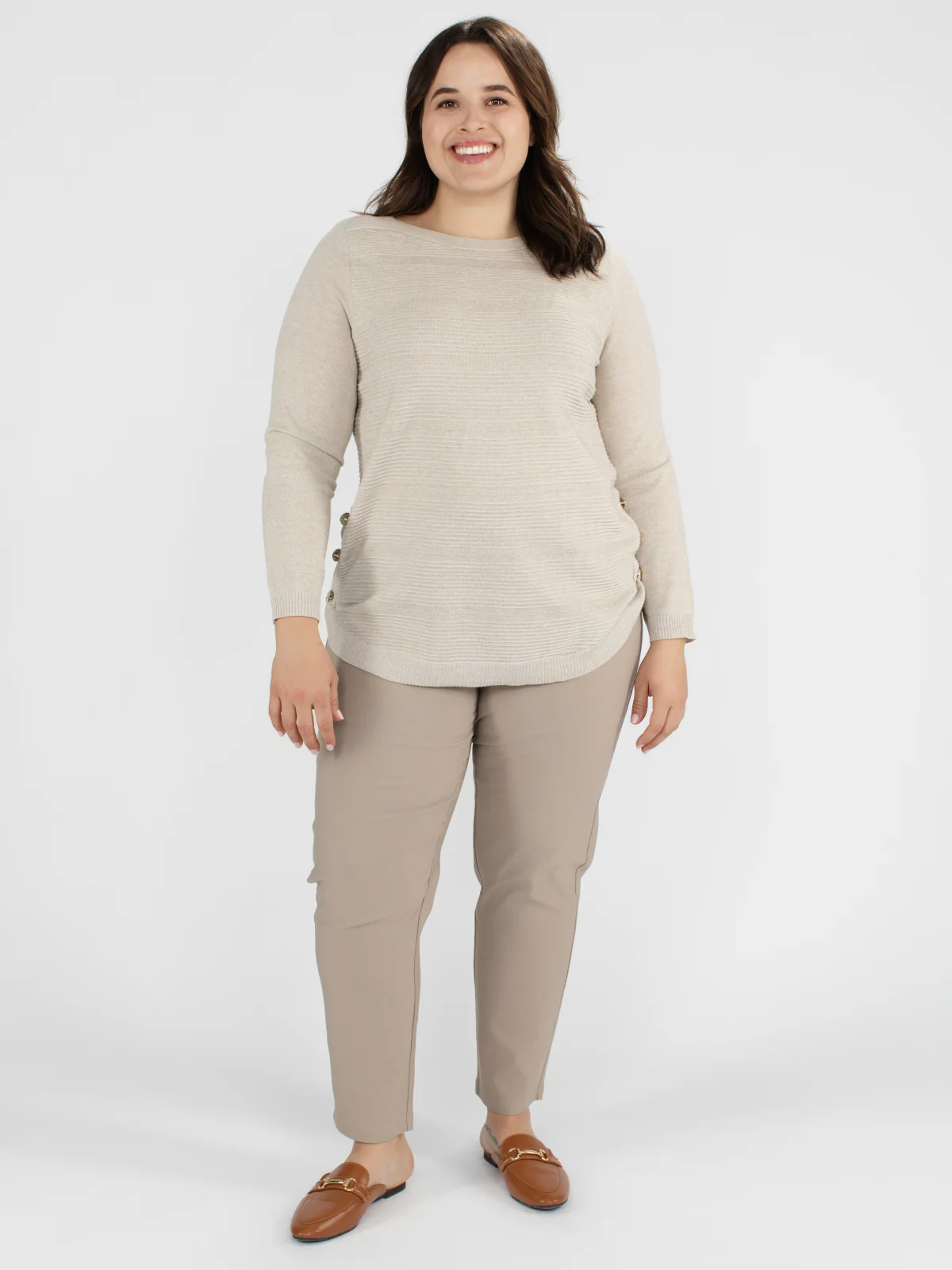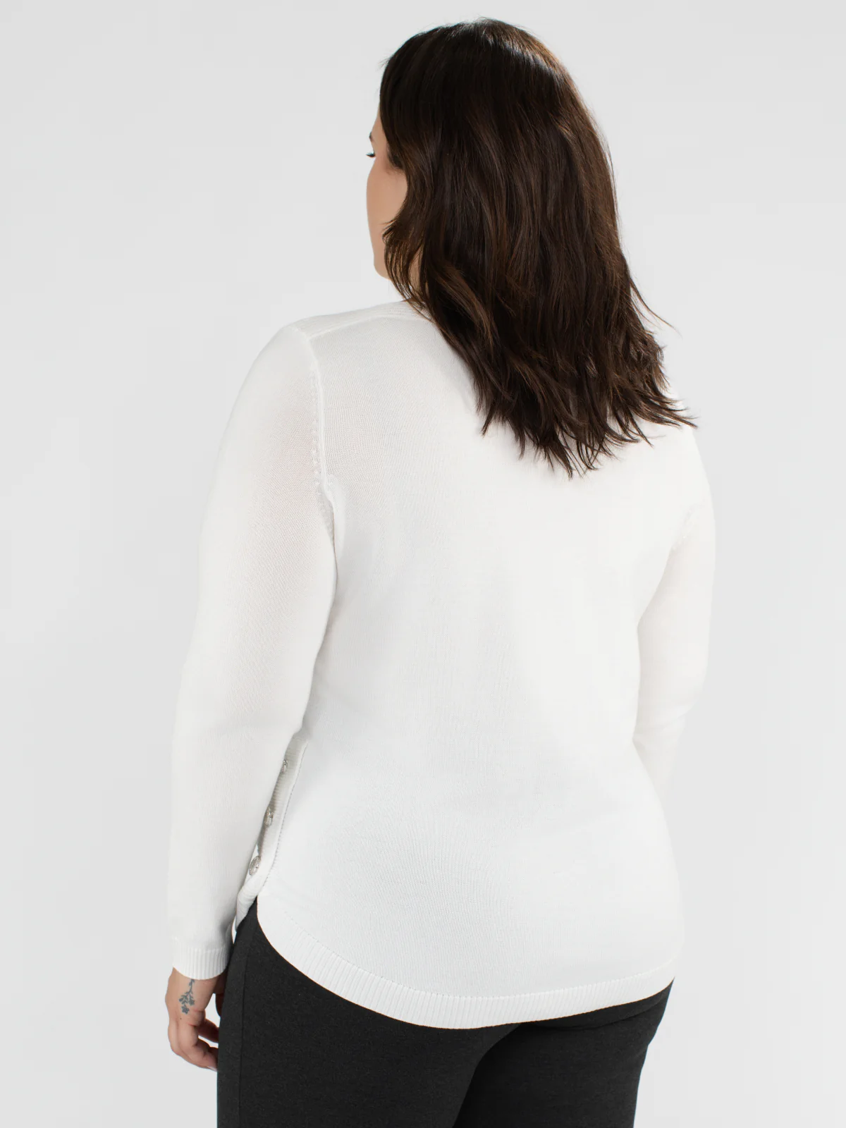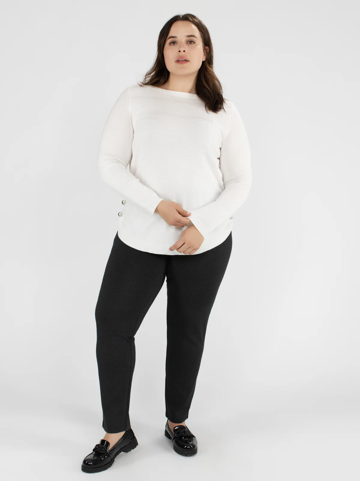 Chandail taille plus à encolure ronde et base arrondie, confectionné dans une maille texturée à fines rayures horizontales. Fermeture décorative par trois boutons métalliques sur chaque côté.