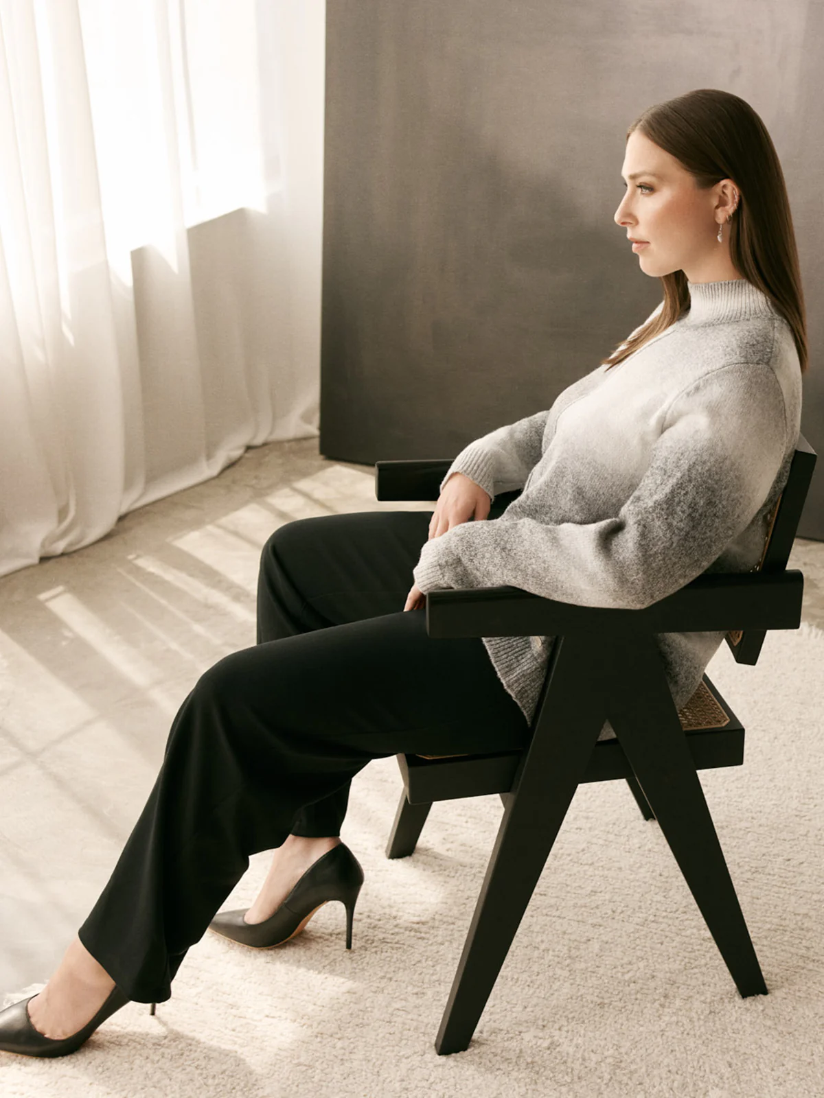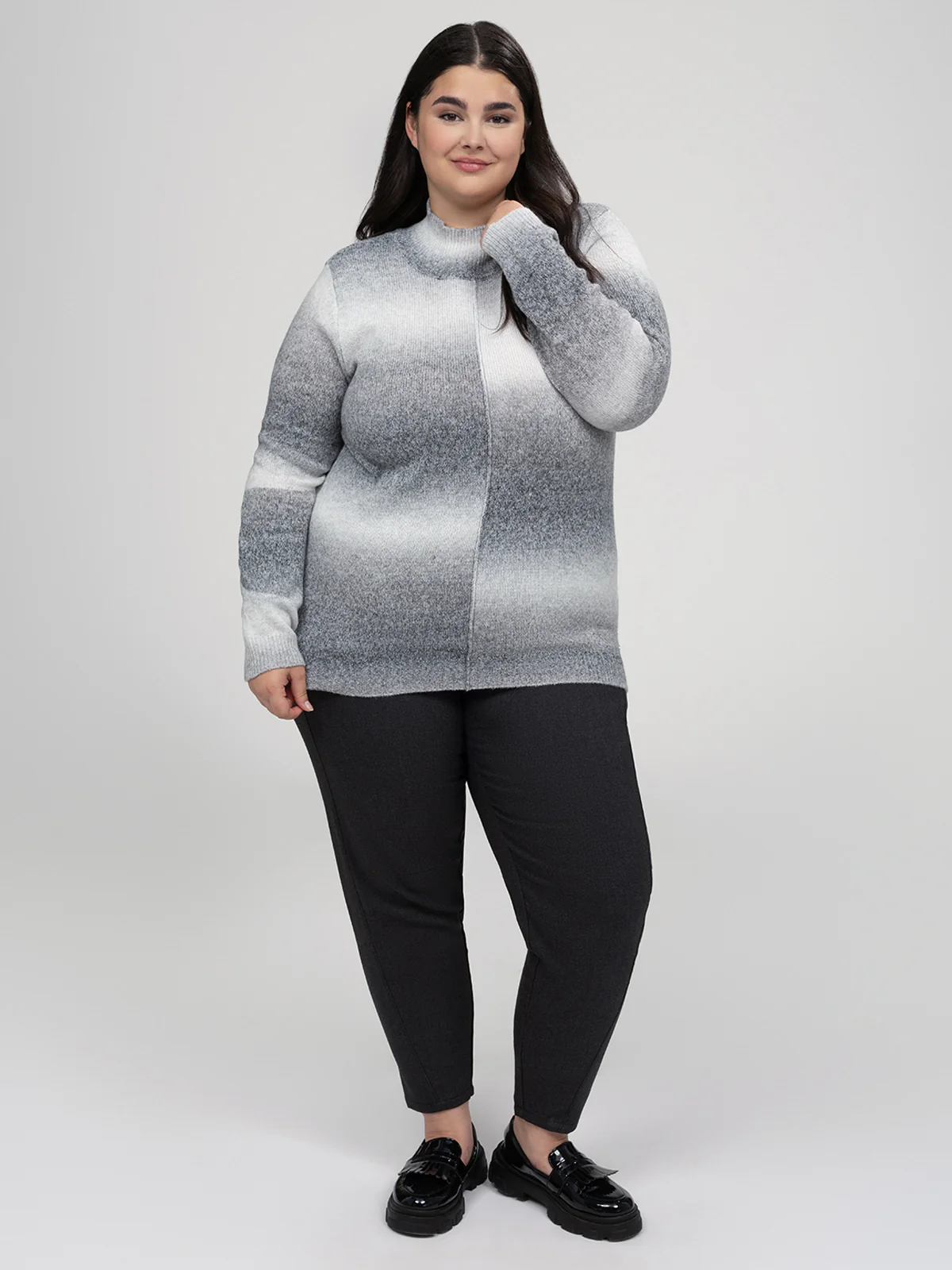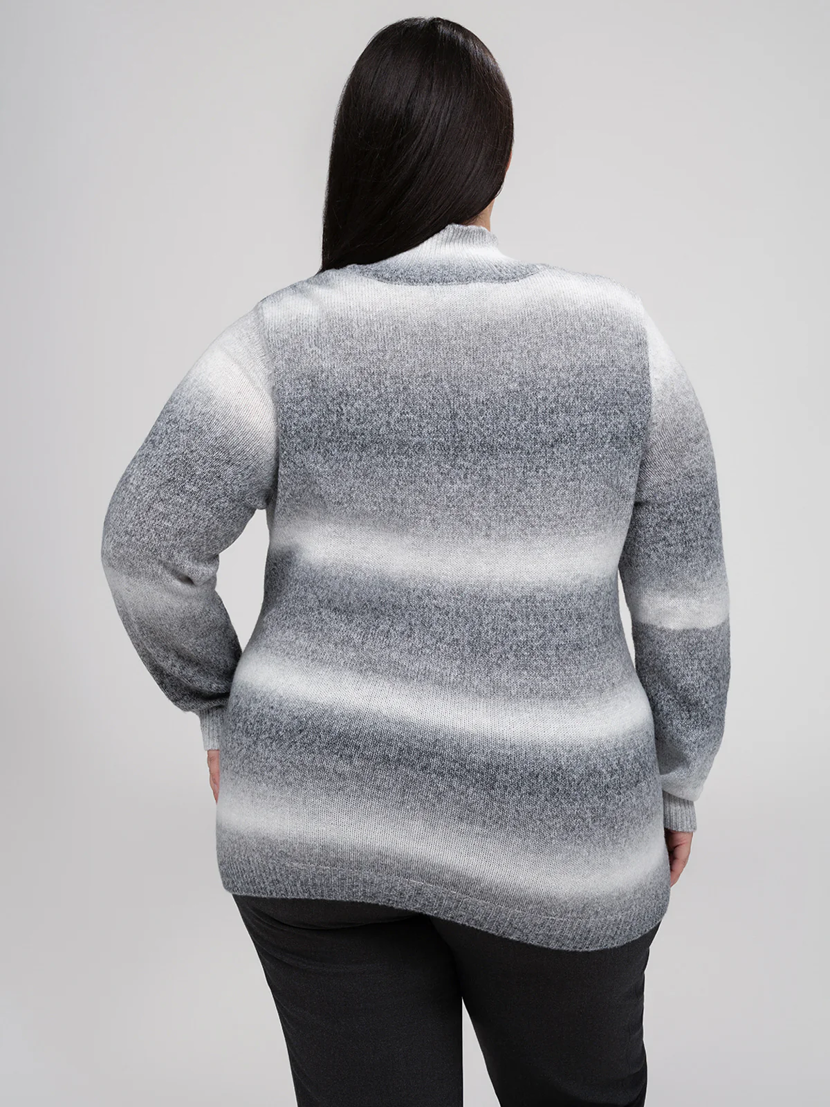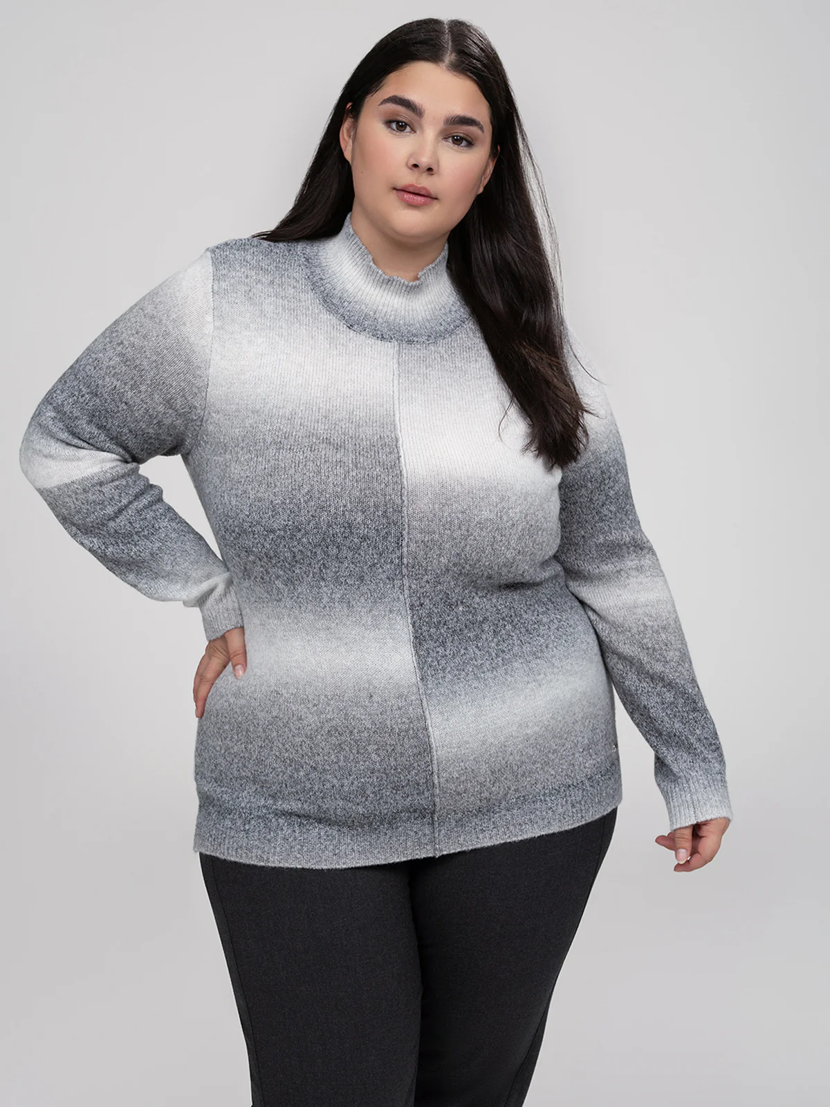 Chandail à manches longues taille plus avec silhouette droite, col montant et texture tricotée uniforme. Le design intègre un effet dégradé horizontal ainsi qu’une ligne de couture frontale.