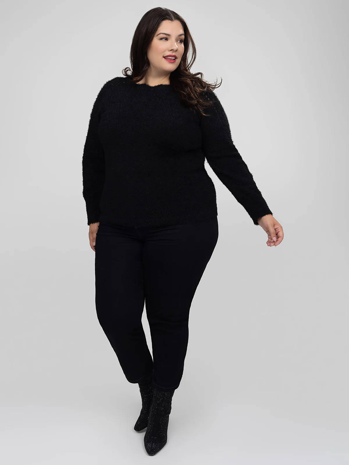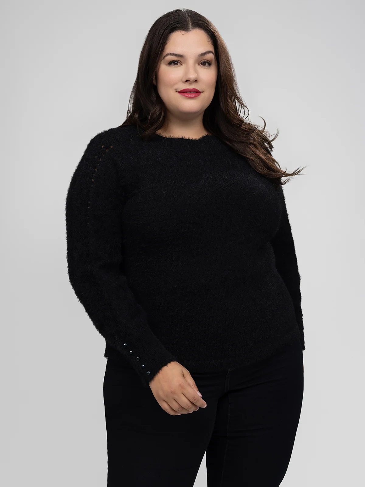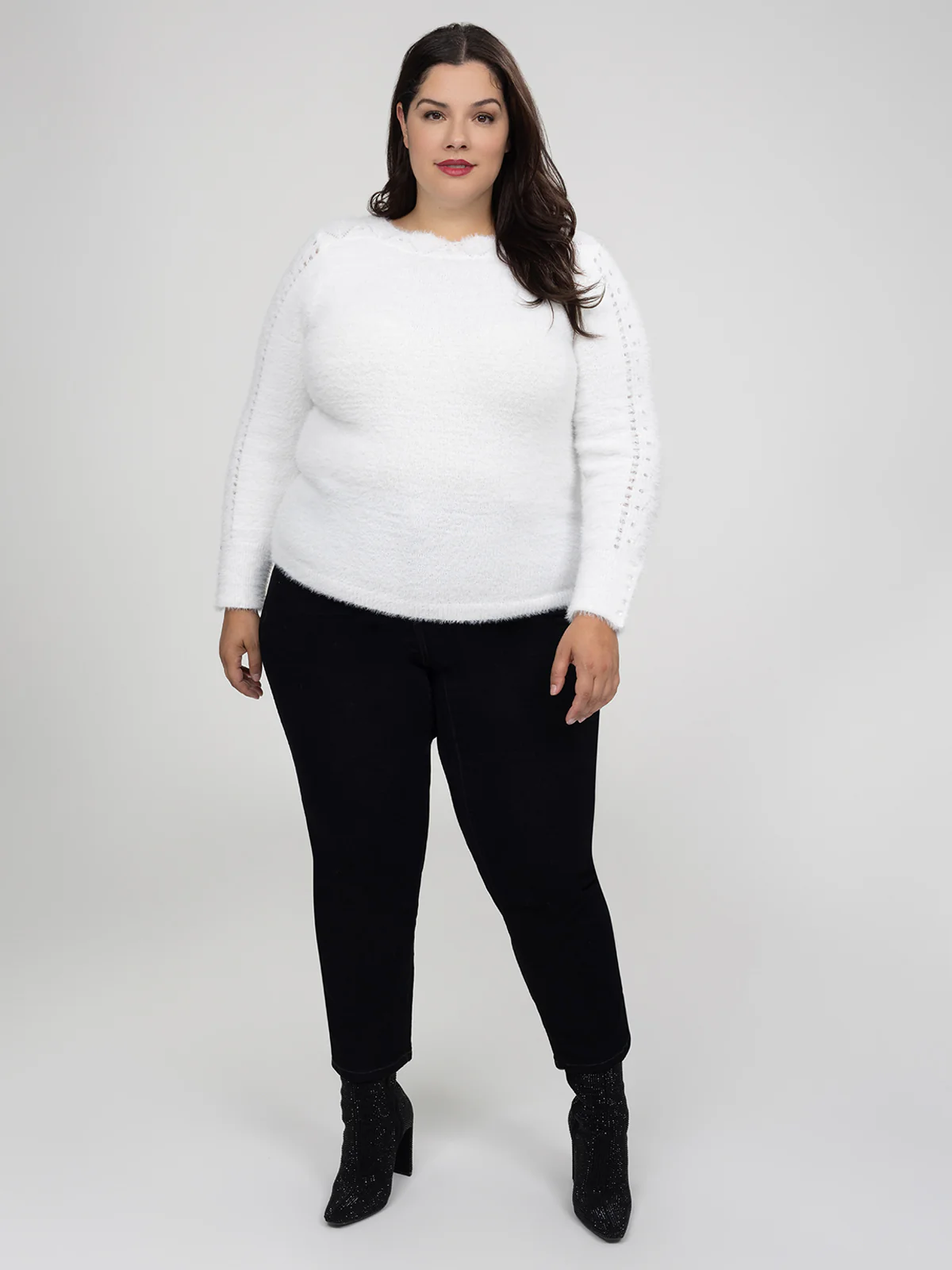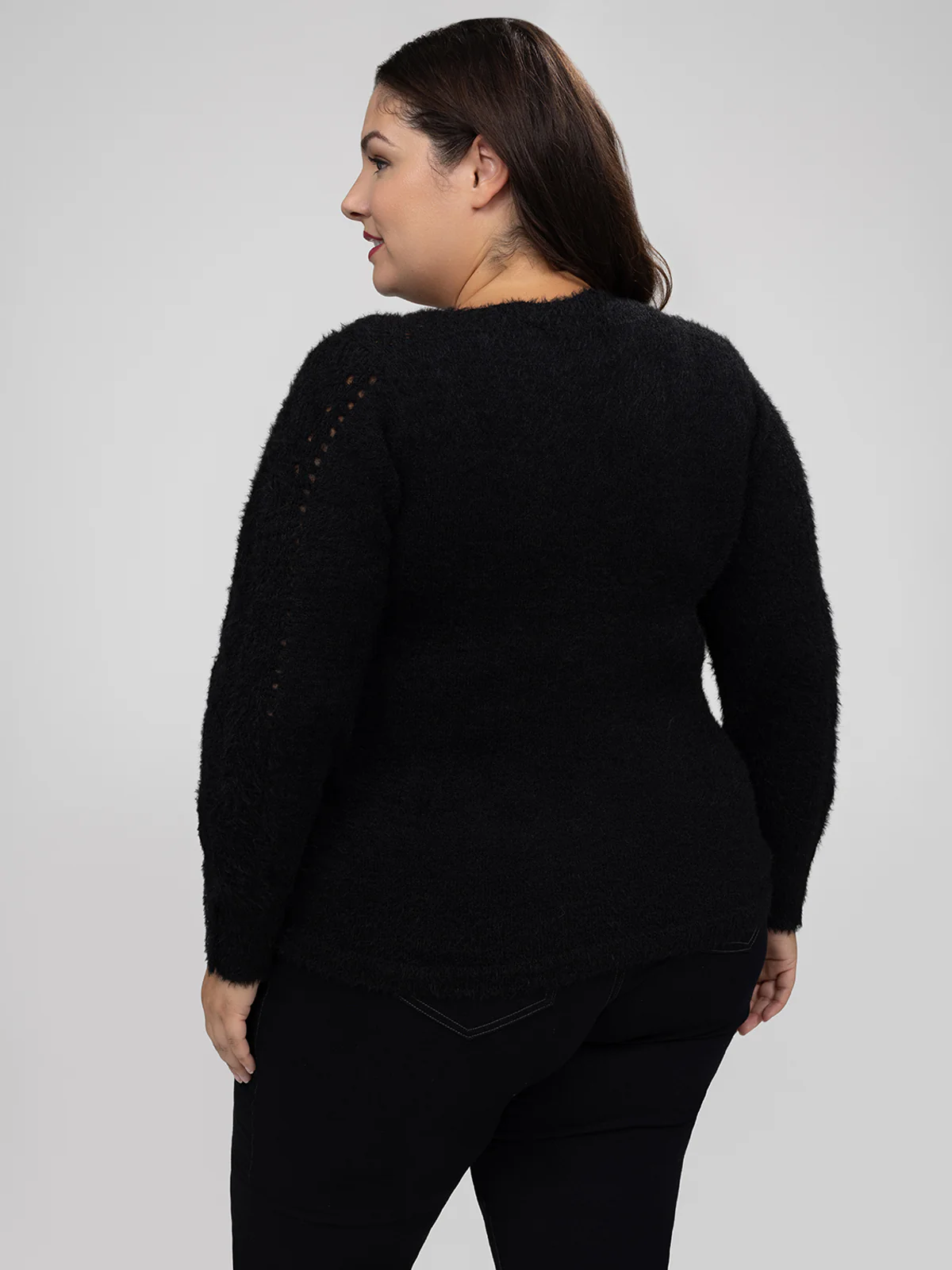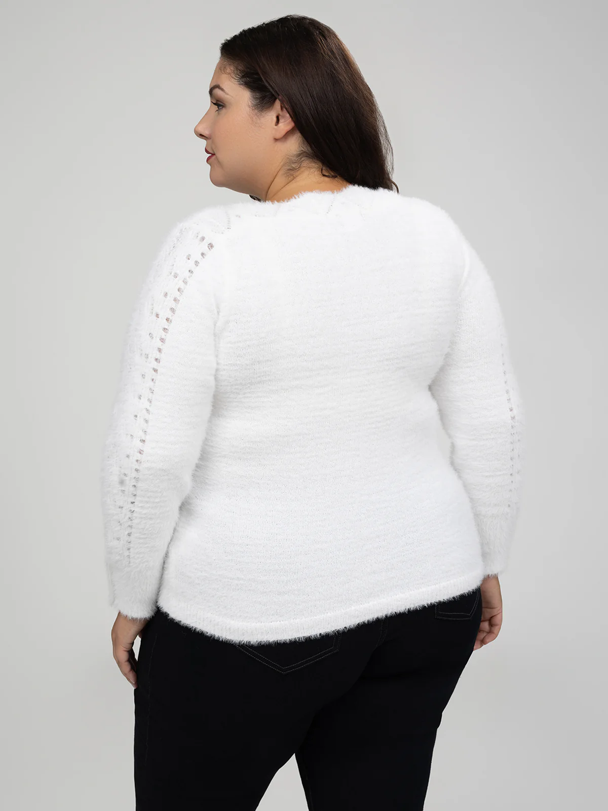 Le pull est conçu en tissu tricoté duveteux avec un col rond. Les manches longues présentent des panneaux ajourés formant un motif régulier sur toute la longueur.