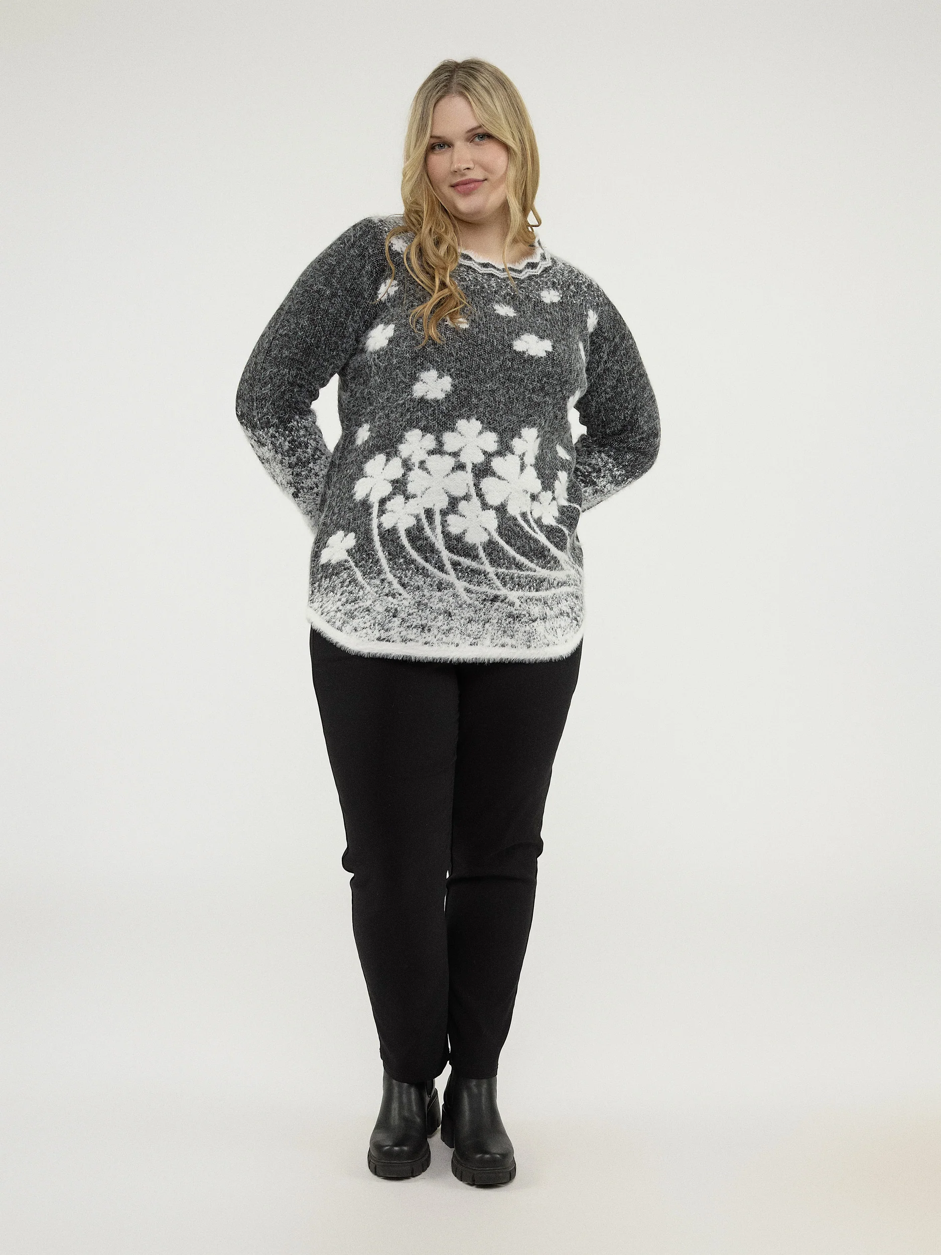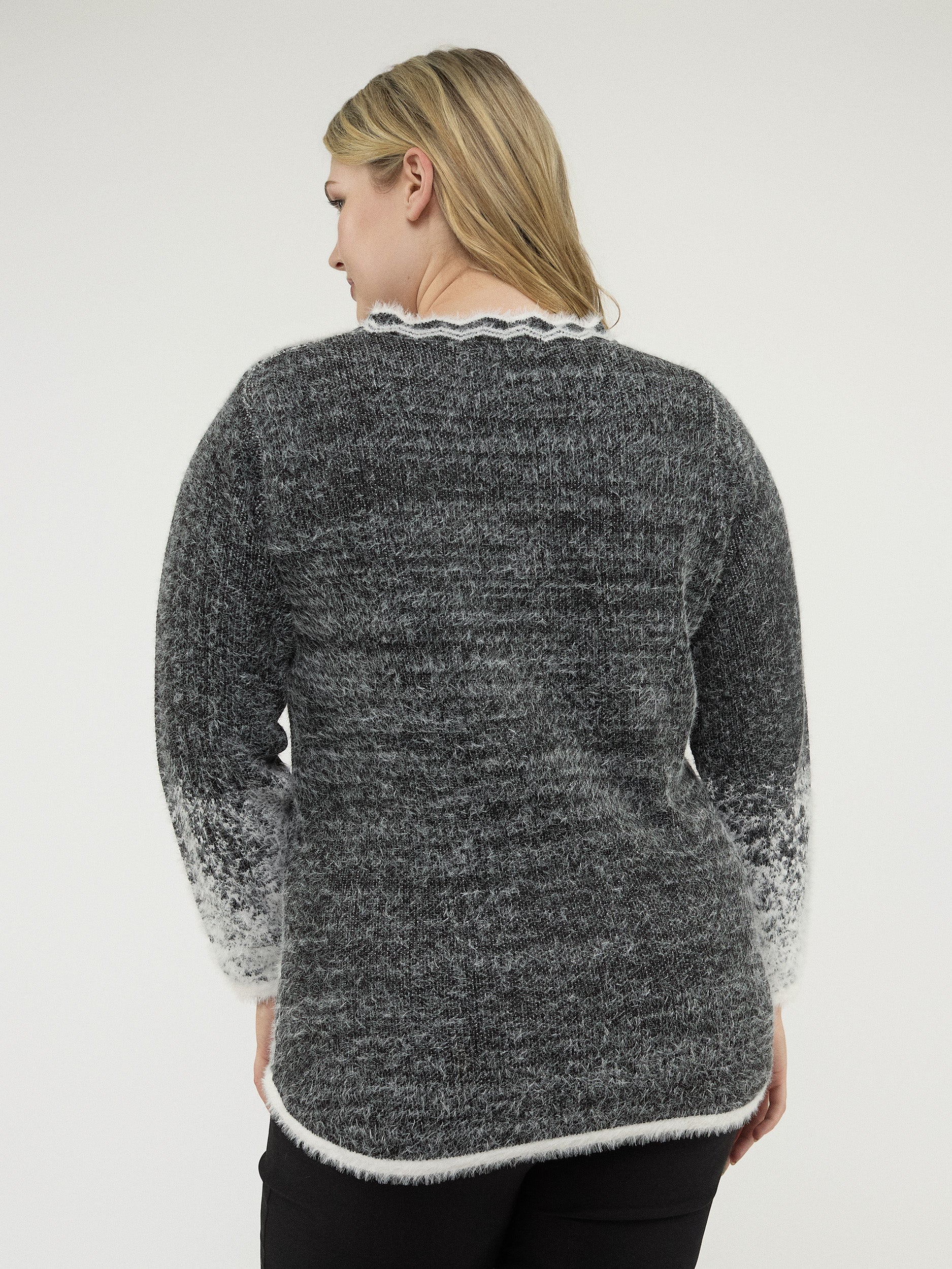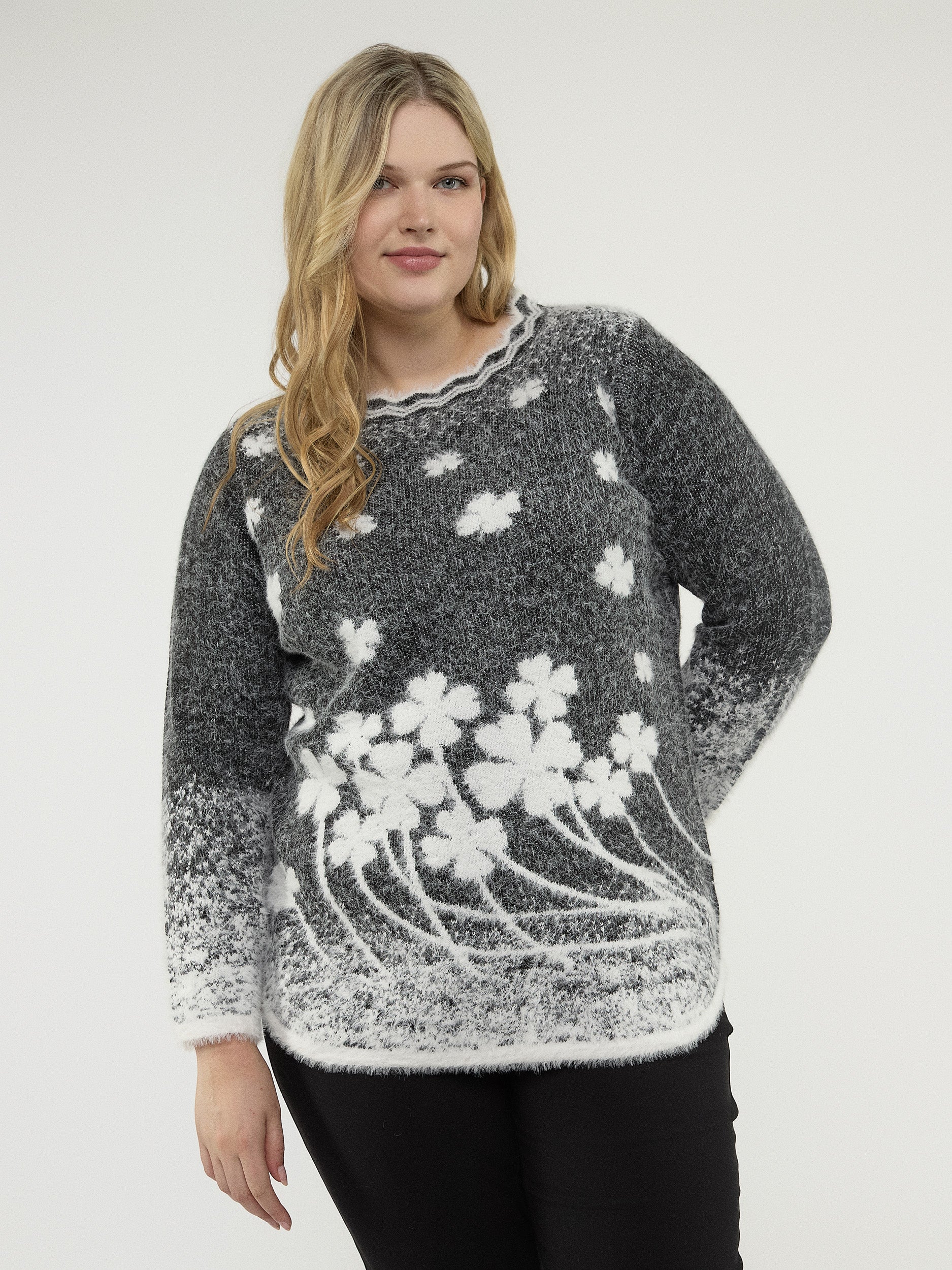 Ce pull taille plus se distingue par son motif floral en dégradé, apportant une touche de douceur à l’ensemble. Sa texture duveteuse assure chaleur et confort tout en conservant une allure élégante.
