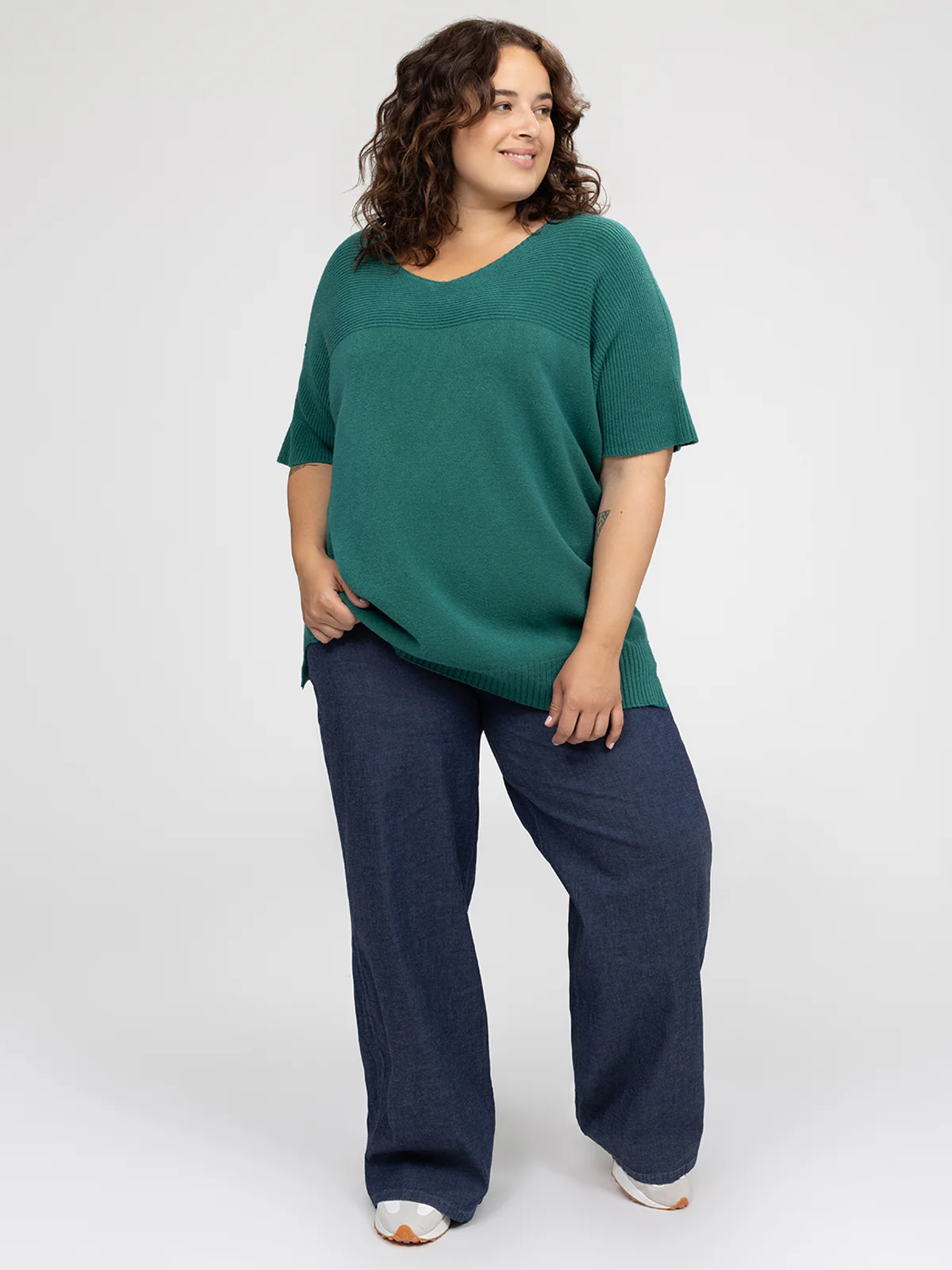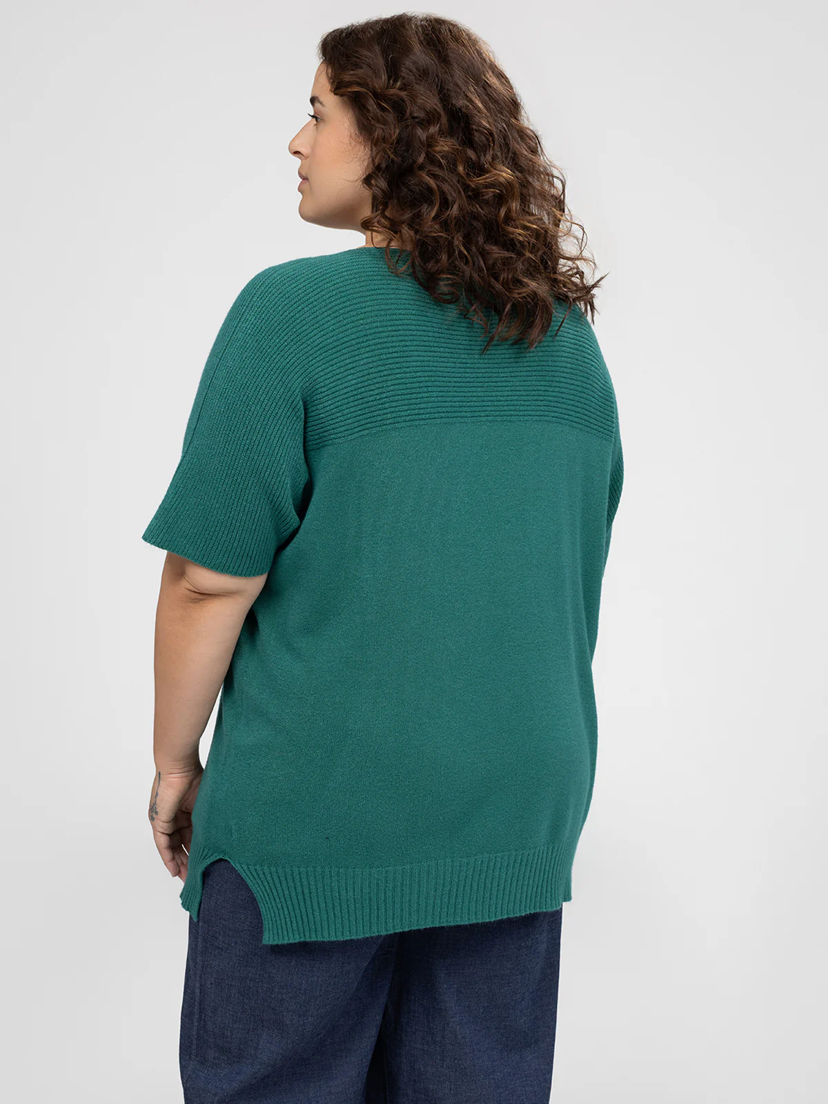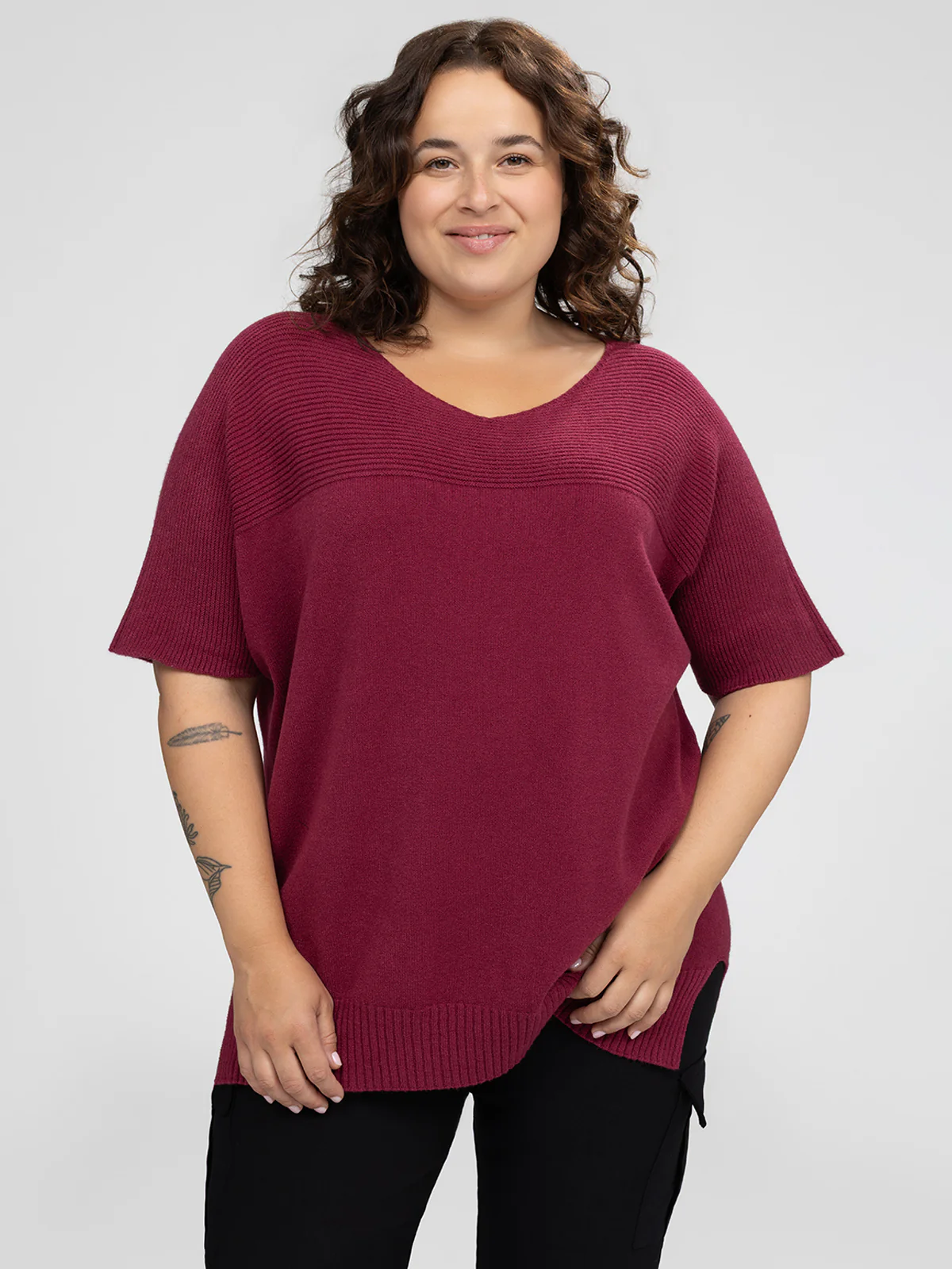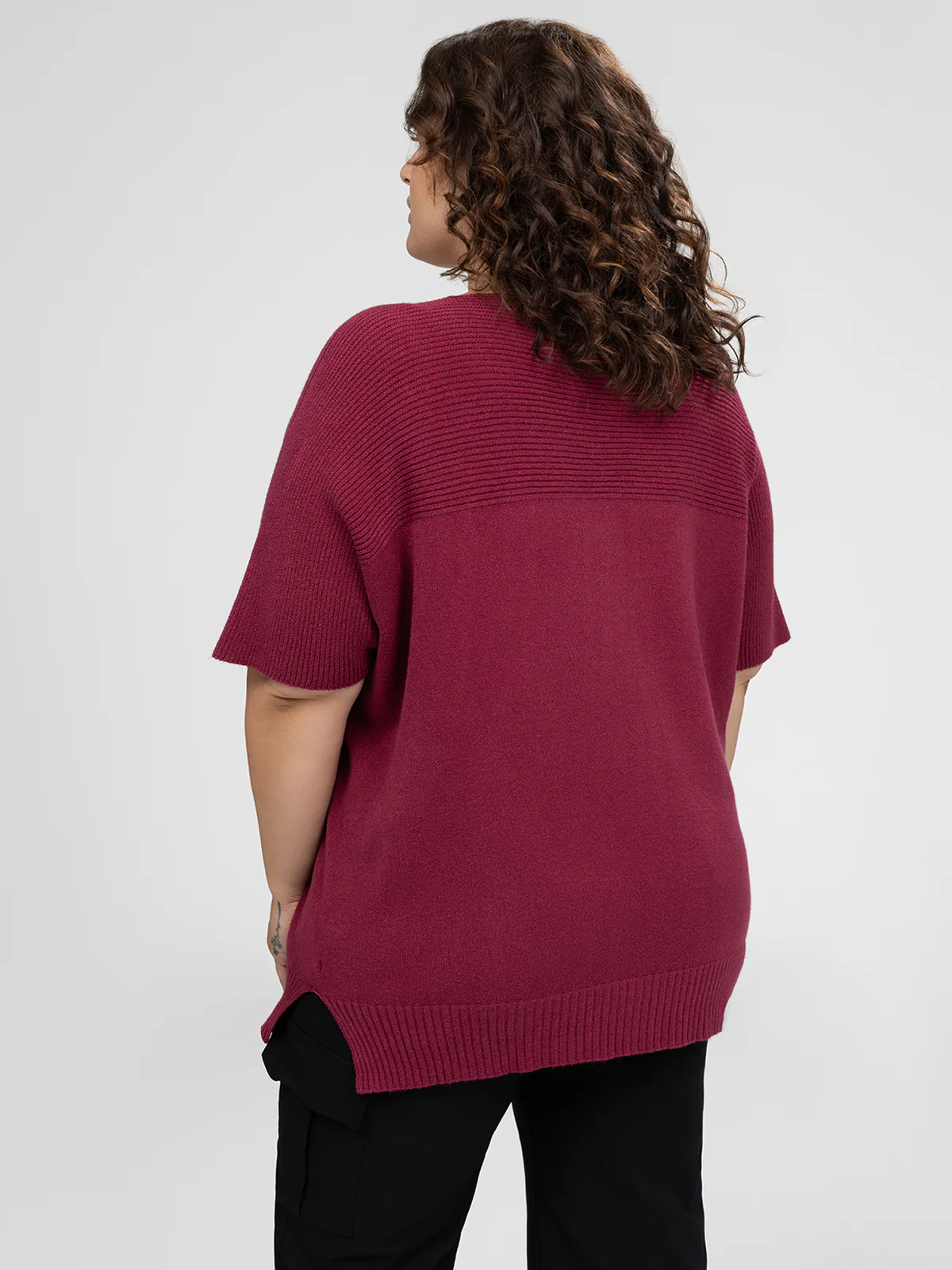 Chandail taille plus à coupe droite, manches courtes, encolure en V et base arrondie fendue sur les côtés. Le tricot présente une texture côtelée au niveau du haut du buste, des manches et de l’ourlet.