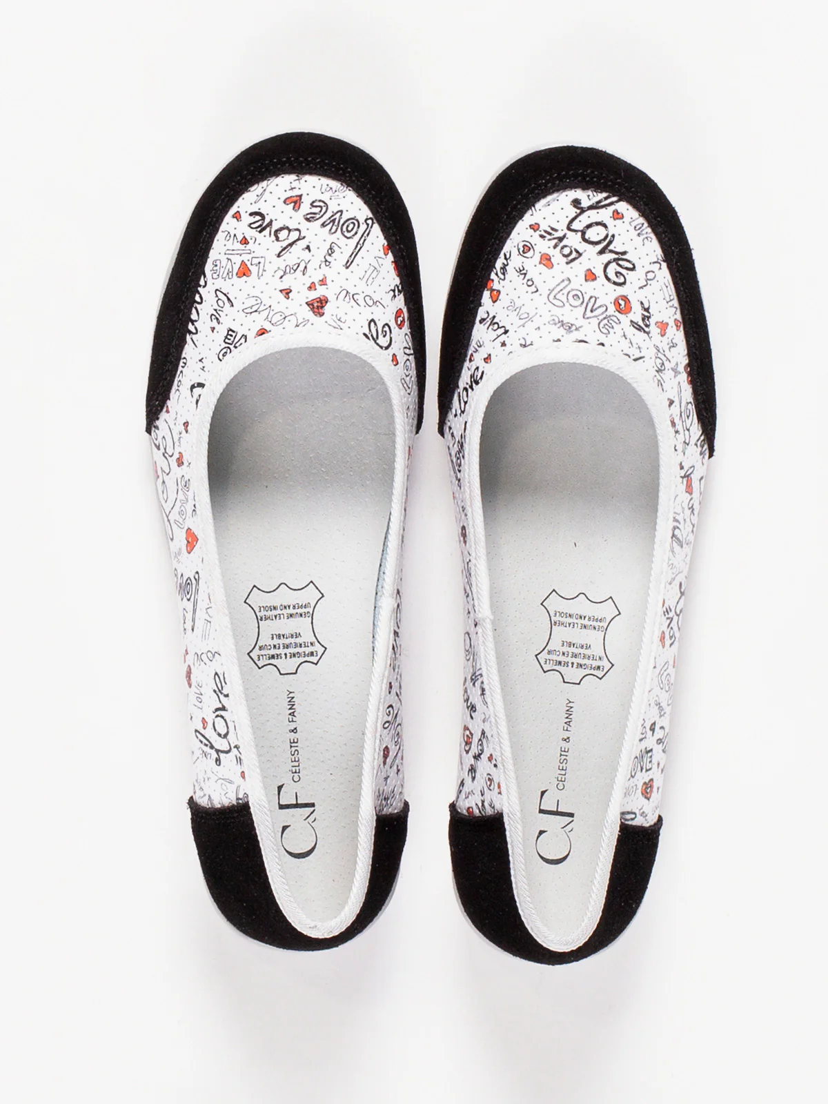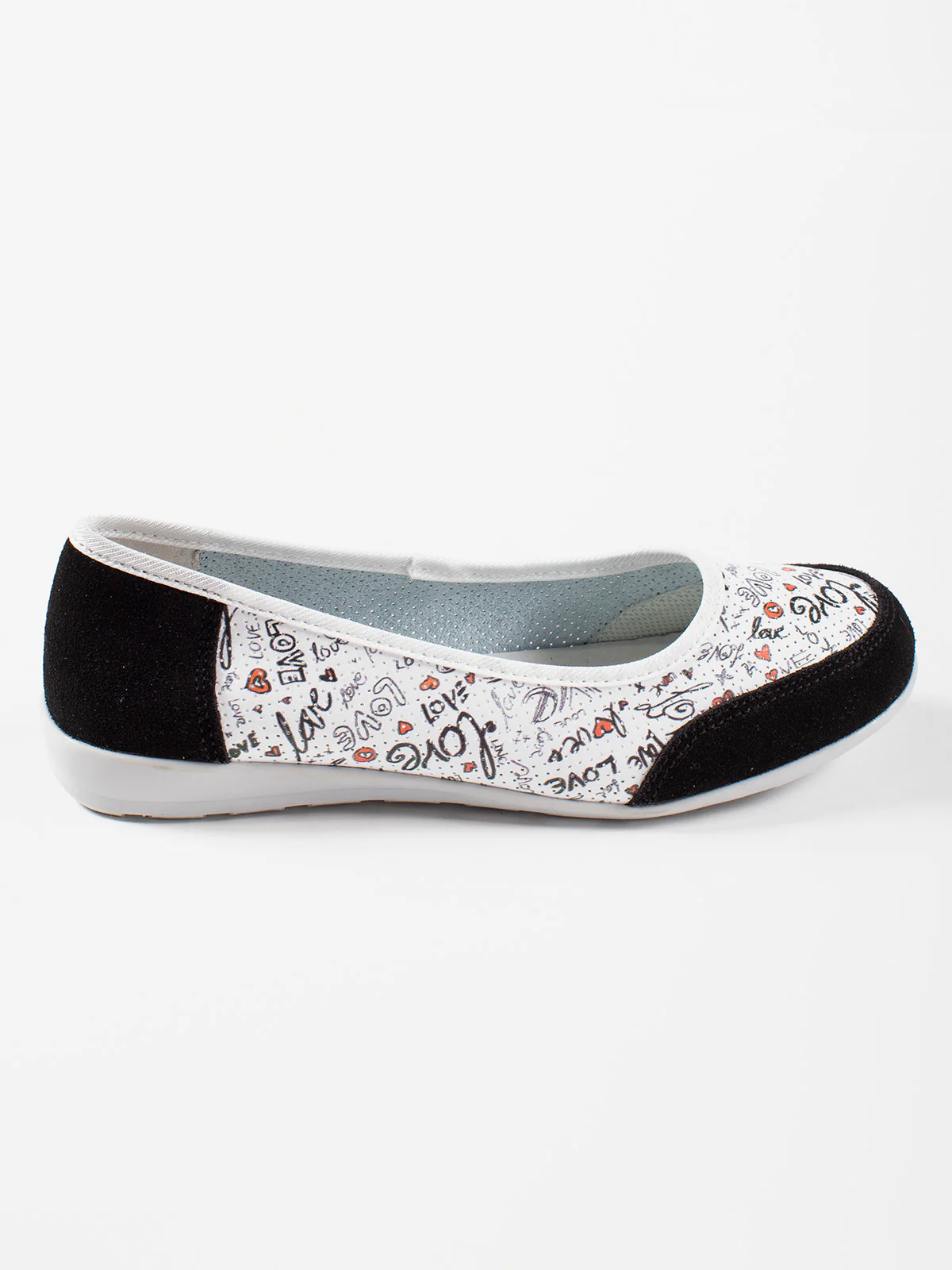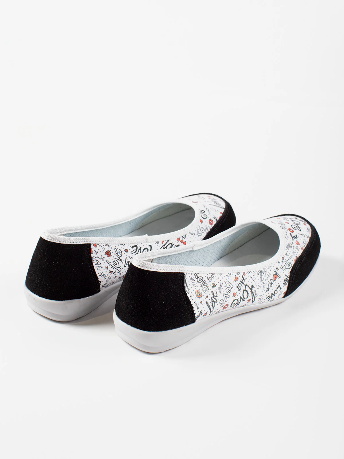 Tige souple imprimée de motifs manuscrits sur fond clair, associée à un contrefort en suédine noire. Bordure légèrement élastiquée pour un meilleur maintien du pied.