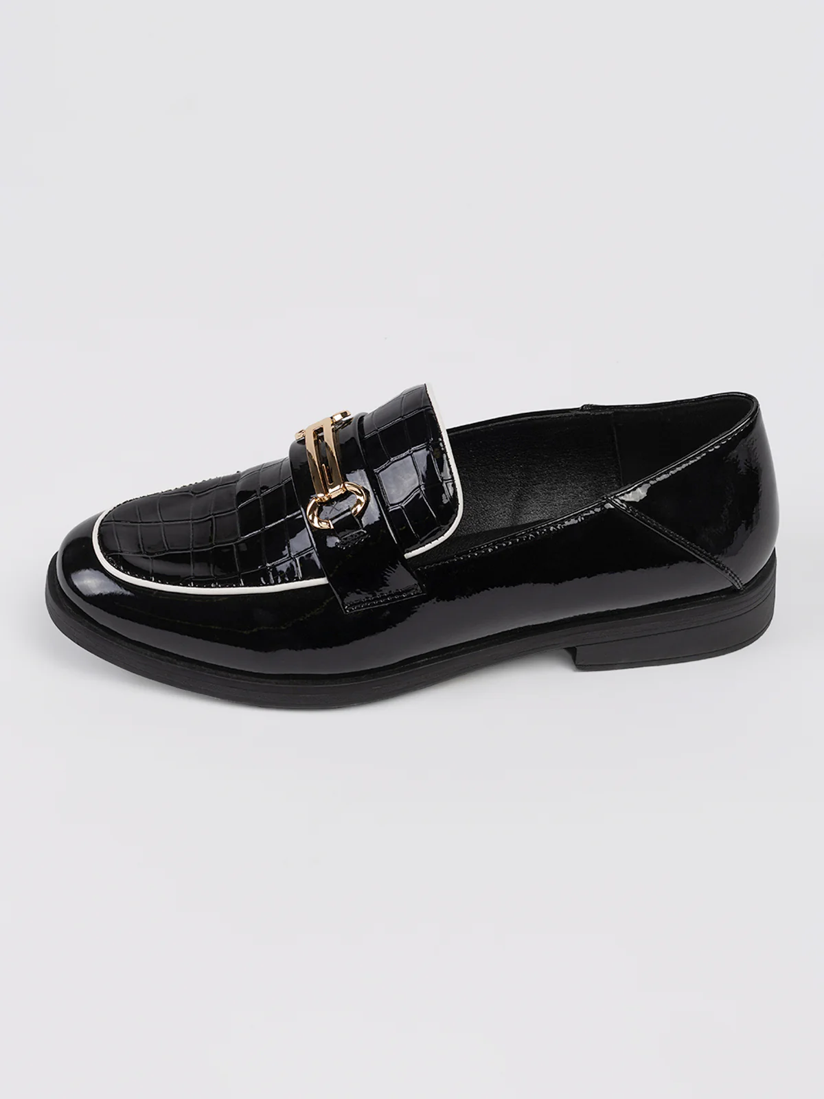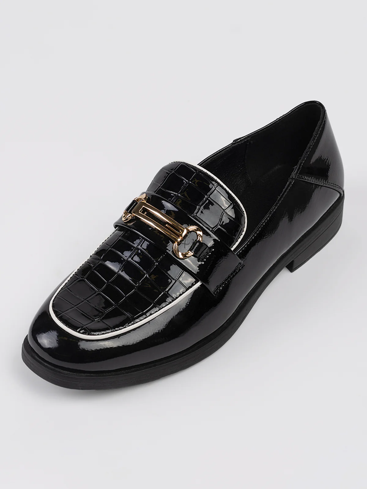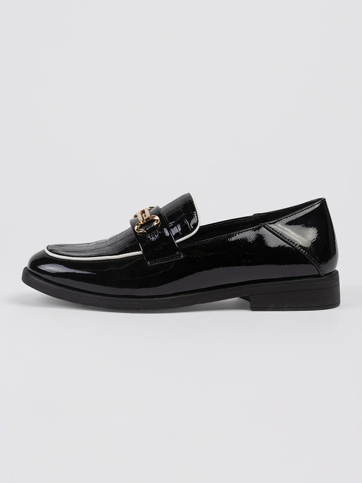 Chaussures à talon plat vernie avec embossage sur l’empeigne. Un élément métallique doré est fixé sur la bande frontale.