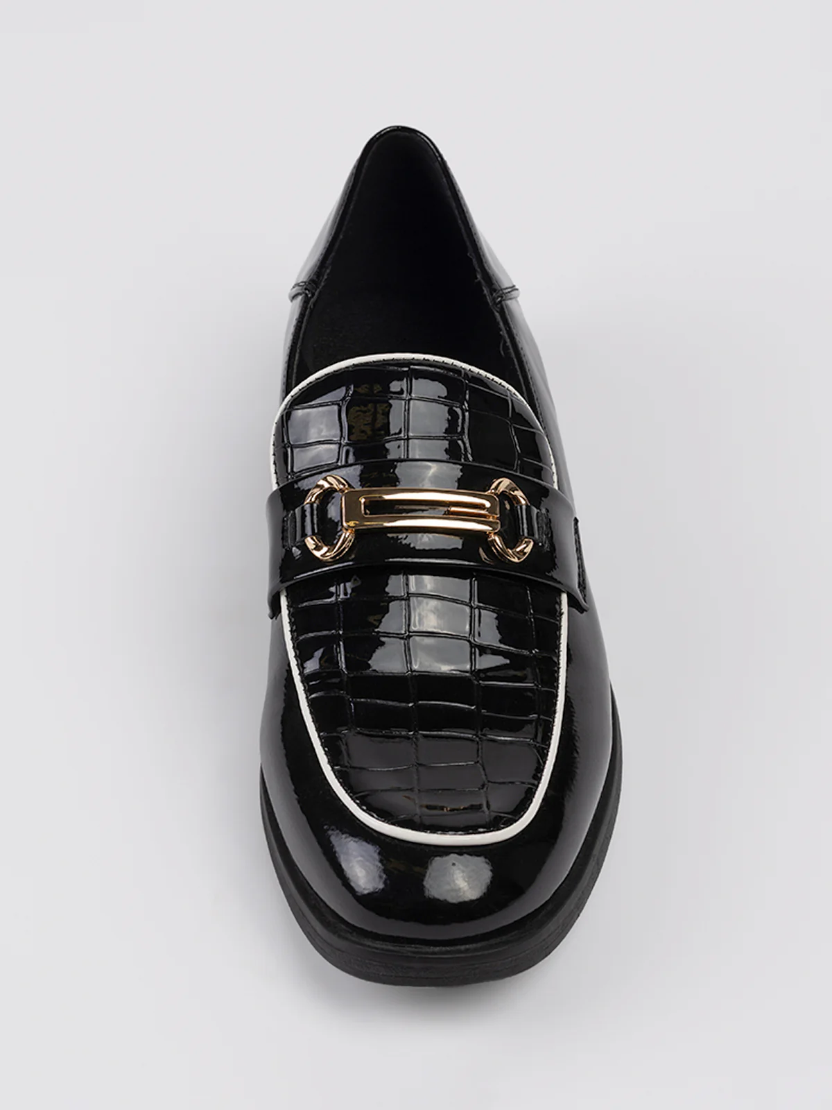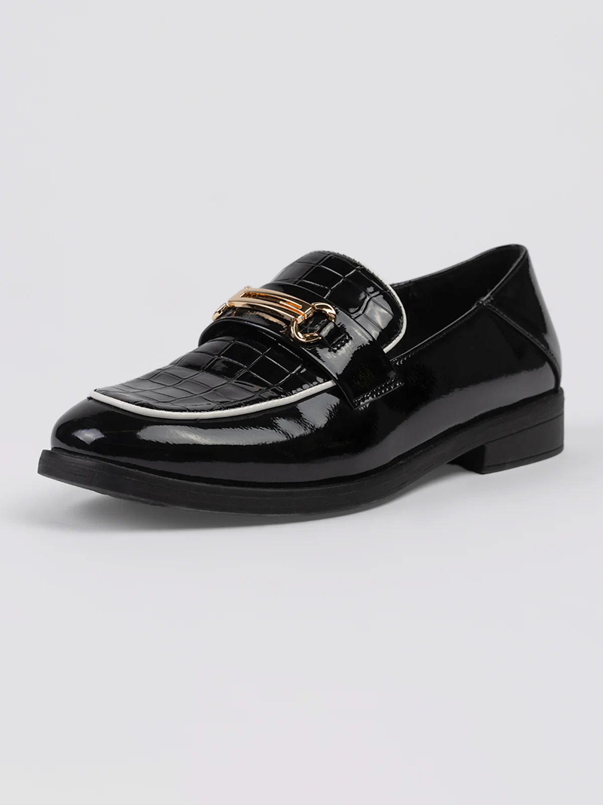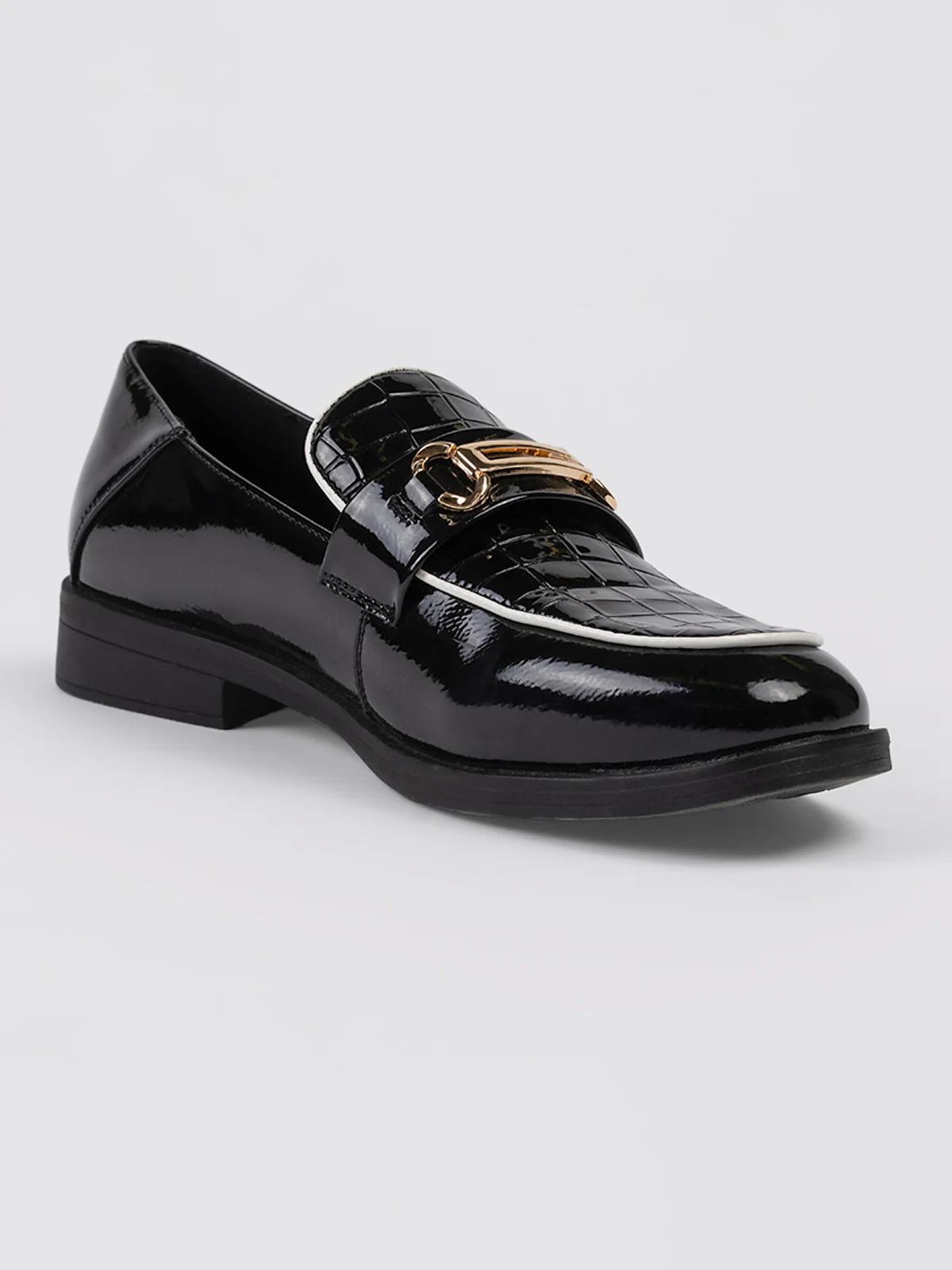 Chaussures à talon plat vernie avec embossage sur l’empeigne. Un élément métallique doré est fixé sur la bande frontale.