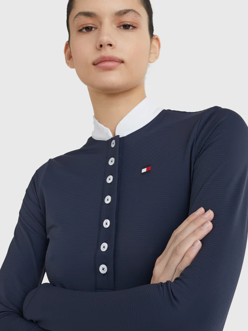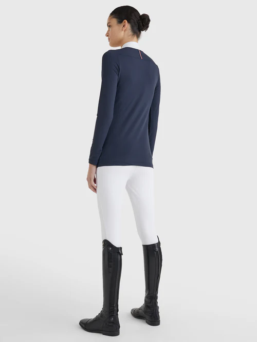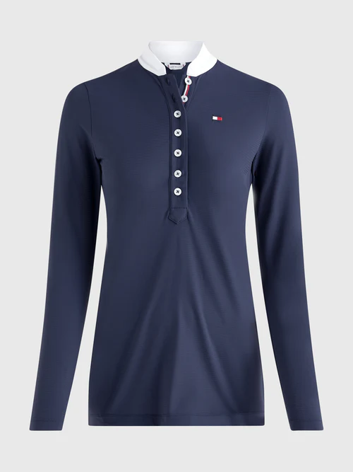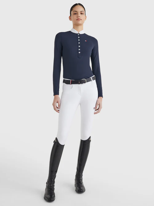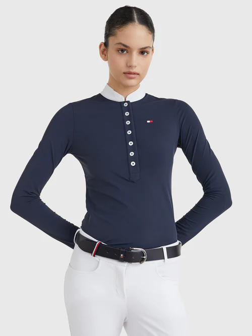 Avec son design subtilement rayé et son col Mao, cette chemise apporte une touche raffinée à votre tenue. La longue patte de boutonnage cache une bande rayée TH Global, ajoutant une signature élégante et discrète. Son logo brodé sur le haut du corps gauche et ses dimensions conformes aux normes FEI en font un choix idéal pour vos compétitions officielles.
