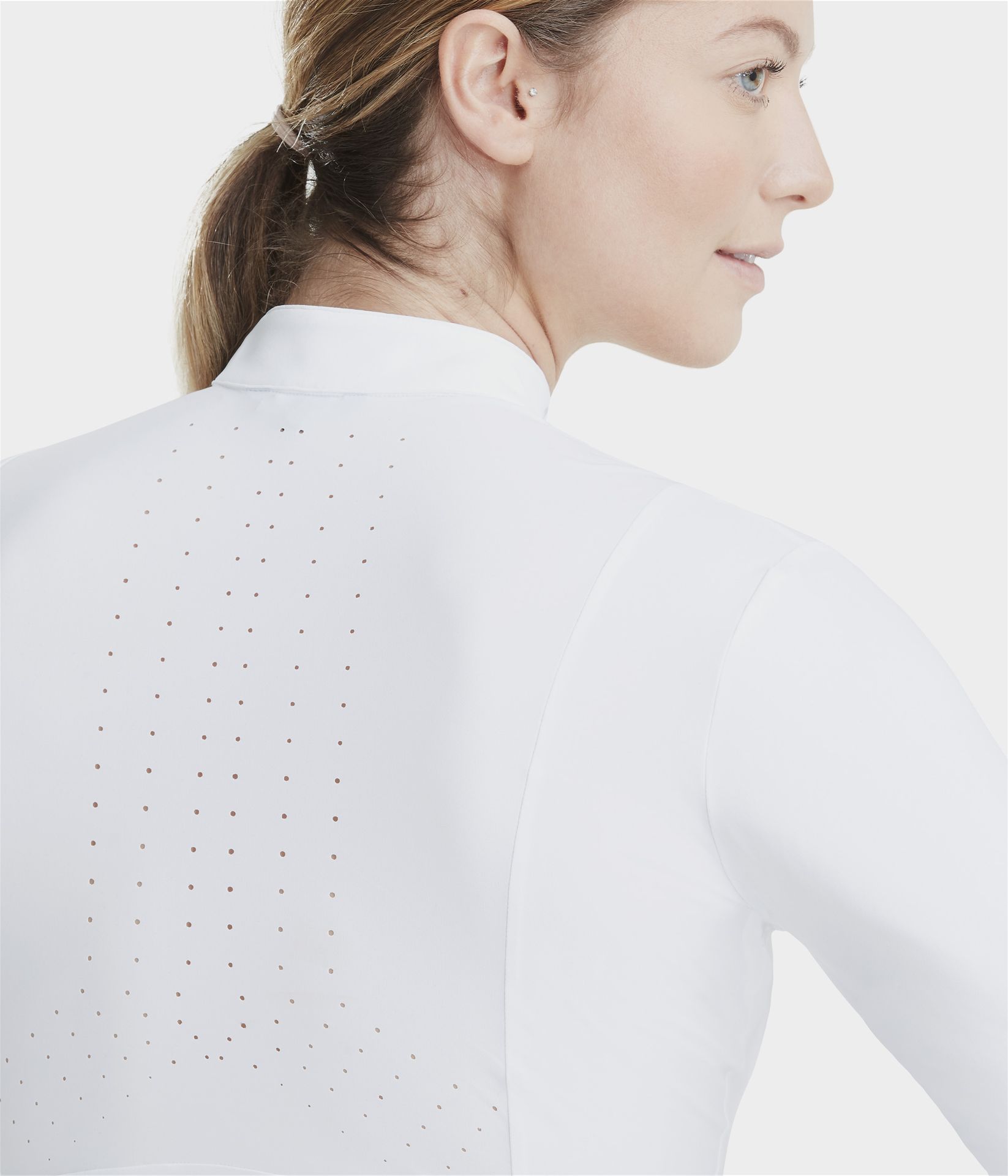 La chemise pensée comme vêtement de sport : Le design a été spécialement pensé pour amener plus de confort. Avec ses découpes ergonomiques, la chemise s’adapte parfaitement aux mouvements du corps. La forme des bas de manche et du col a été étudiée pour libérer les gestes du cavalier en concours. Toujours conçue dans une matière bi-stretch et dotée de notre technologie UV-Block, la chemise offre confort et protection. Très respirante, sa zone micro-perforée positionnée dans le dos évacue efficacement la chaleur pendant les efforts intenses.