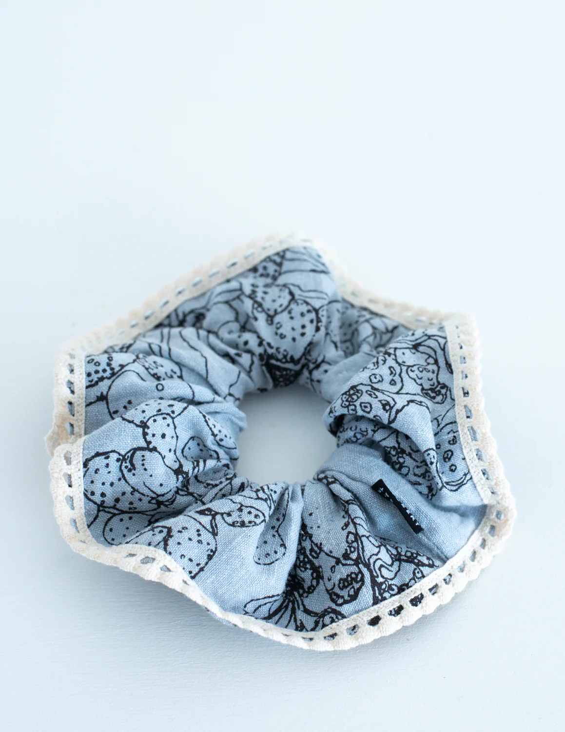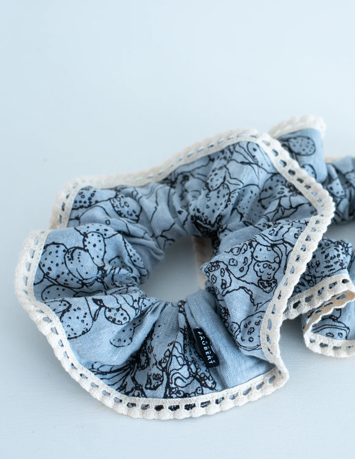 Chouchou à frange imprimé à la main en sérigraphie dans notre atelier de Rimouski. Le motif marée basse rappelle les promenades sur les rives du Saint-Laurent et les jolis fucus que l’on peut y trouver à marée basse.