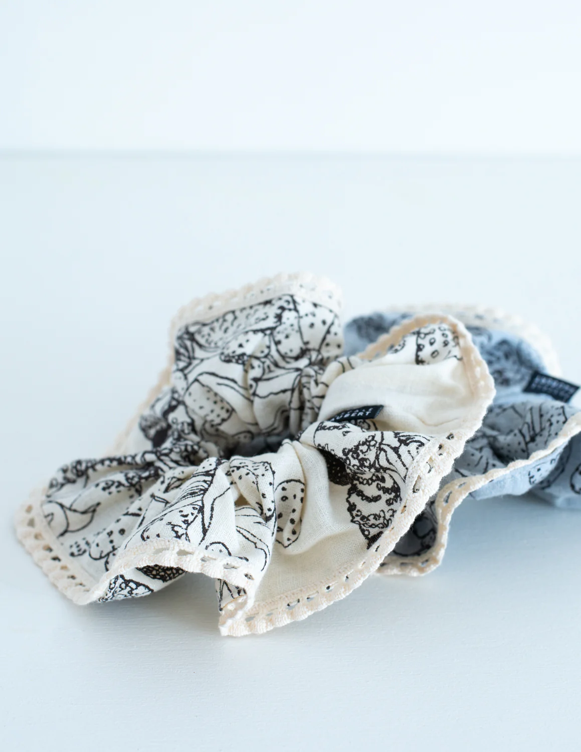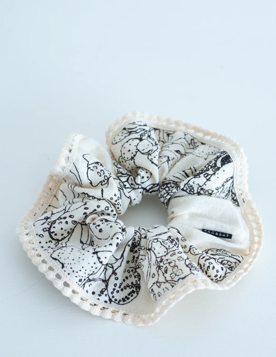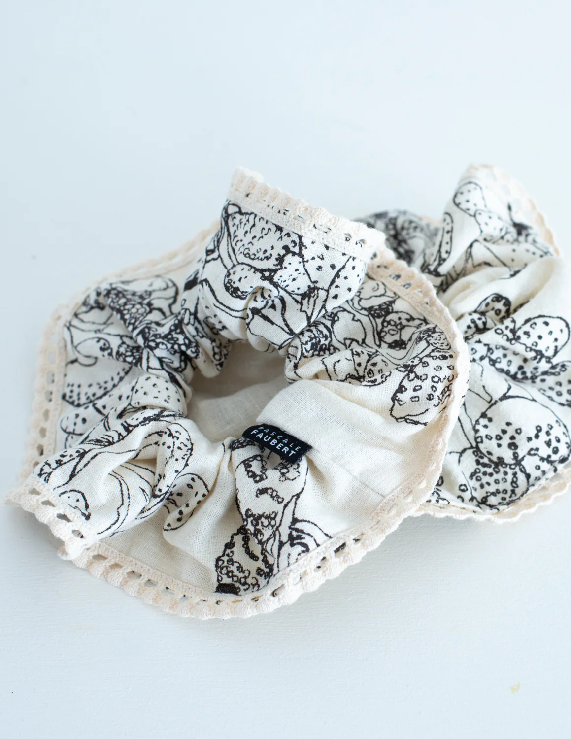 Chouchou à frange imprimé à la main en sérigraphie dans notre atelier de Rimouski. Le motif marée basse rappelle les promenades sur les rives du Saint-Laurent et les jolis fucus que l’on peut y trouver à marée basse.