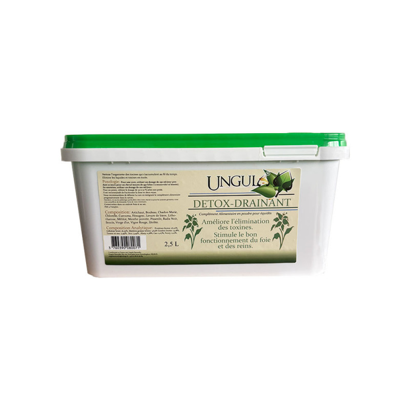 Le complément alimentaire Détox Drainant Ungula Naturalis est un allié idéal pour aider votre cheval à nettoyer son organisme des toxines accumulées. Formulé à base de plantes aux propriétés purifiantes, il stimule le foie et les reins, favorisant ainsi une meilleure élimination des toxines par les urines. Son action contribue également à optimiser l’assimilation des vitamines et minéraux, rendant ce produit particulièrement recommandé avant une cure de compléments alimentaires pour une absorption optimale.