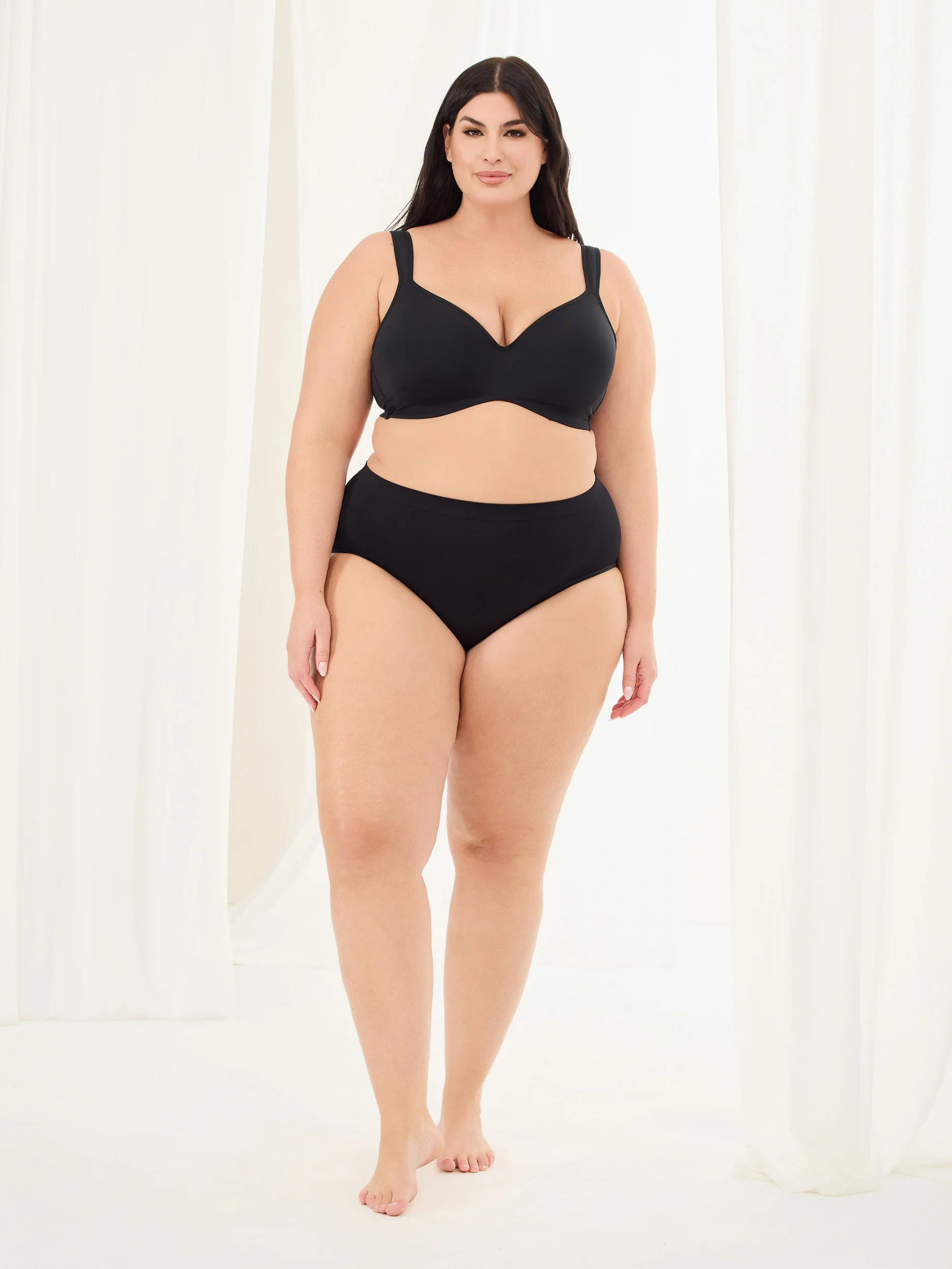Culotte taille plus à coupe classique, taille haute et finition sans coutures. Le modèle uni présente une couvrance arrière intégrale et une longueur standard.