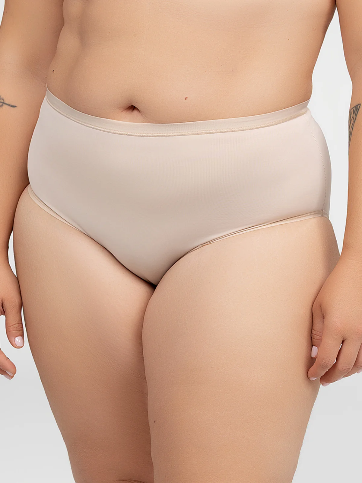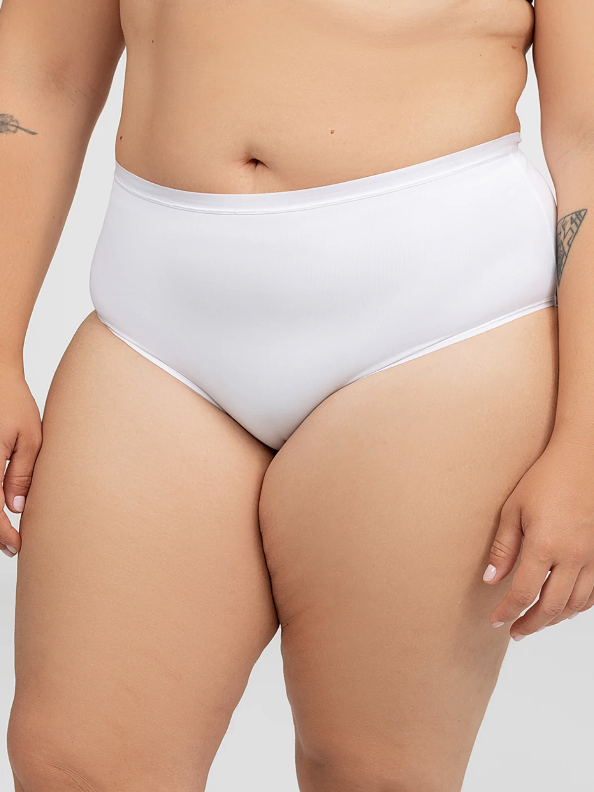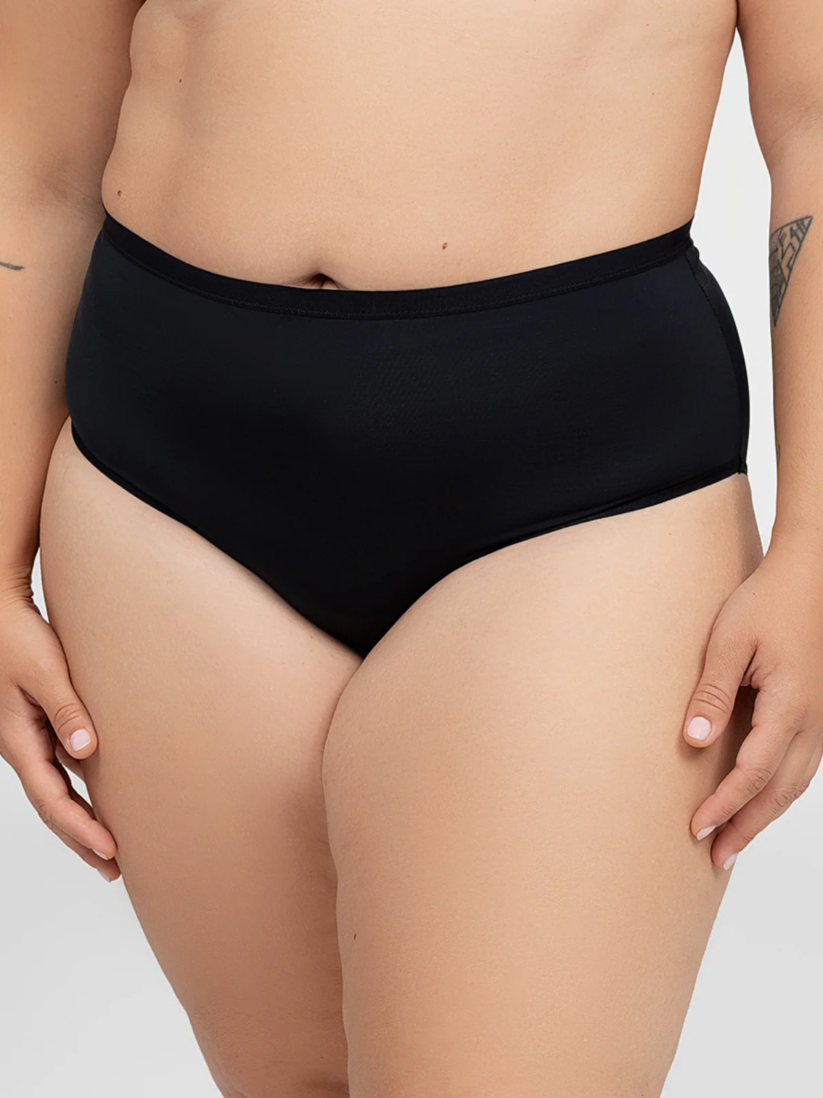 Culotte taille plus à coupe haute, finitions élastiquées et bords plats. Le modèle uni est de longueur moyenne avec une couvrance arrière ajustée.