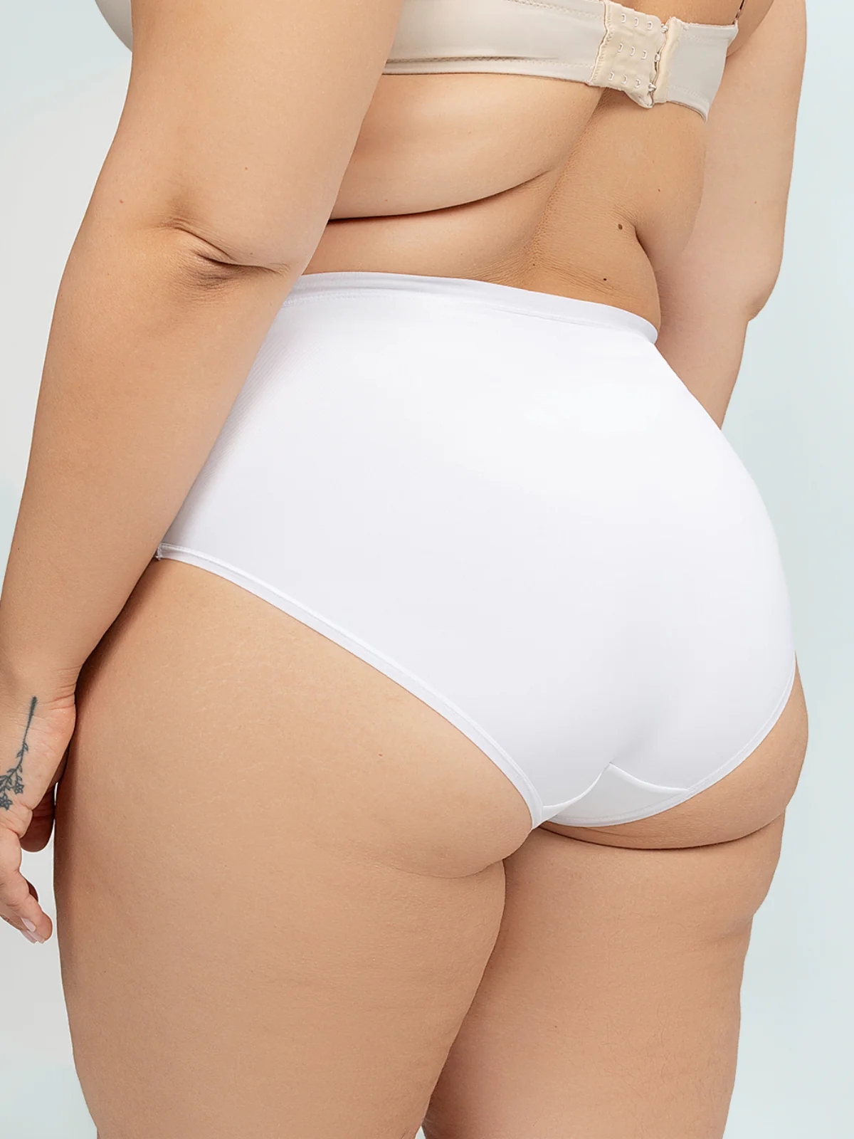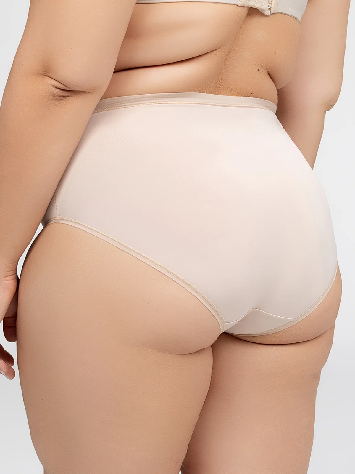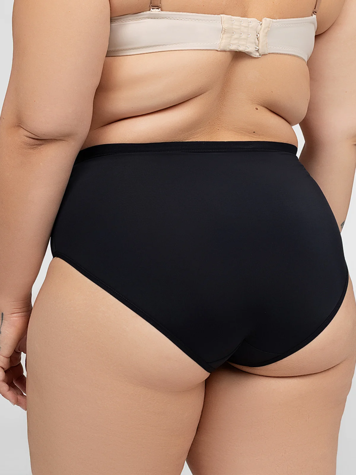 Culotte taille plus à coupe haute, finitions élastiquées et bords plats. Le modèle uni est de longueur moyenne avec une couvrance arrière ajustée.