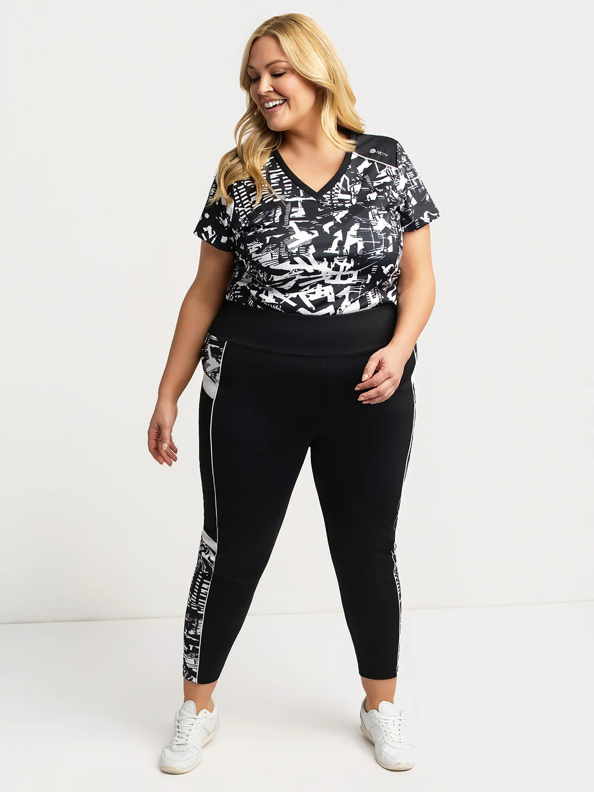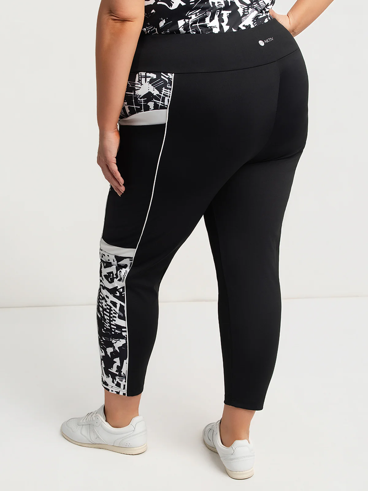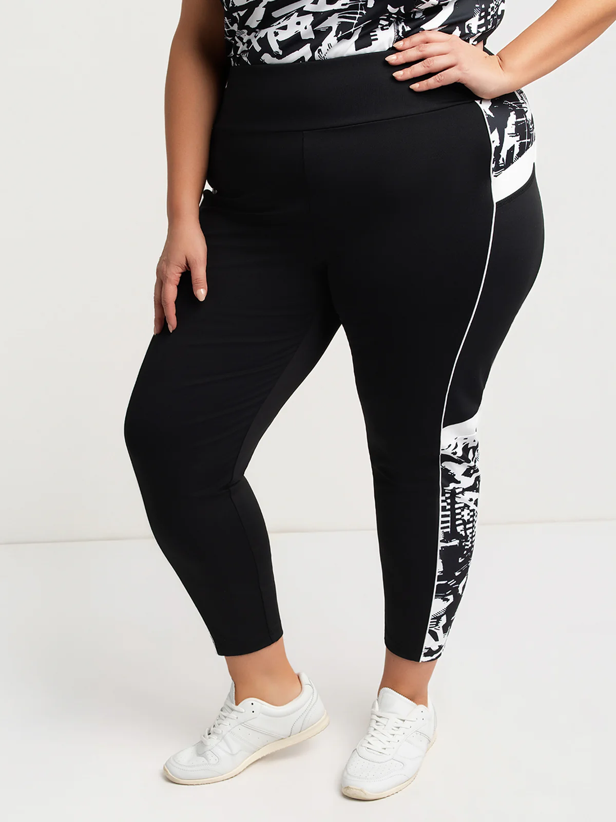 Pantalon de yoga en textile extensible avec taille haute. Il présente des empiècements latéraux contrastés avec motif imprimé et des coutures verticales de structuration.