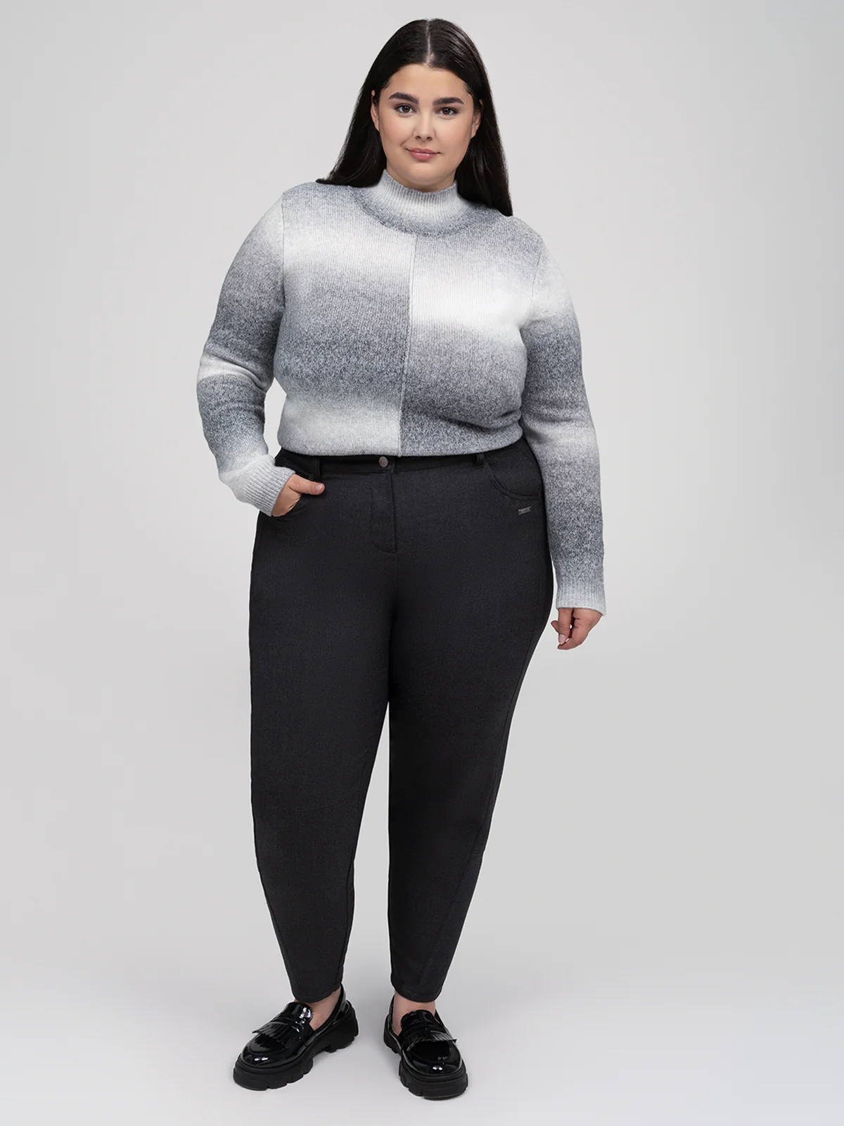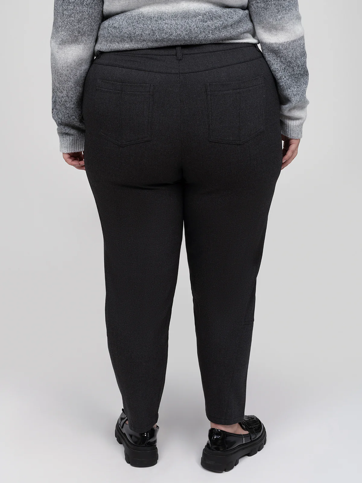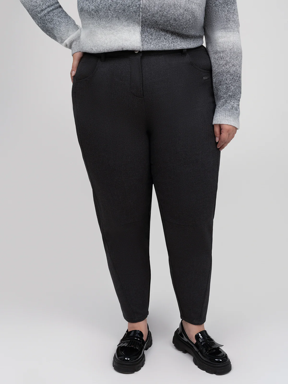 Pantalon décontracté taille plus à coupe droite légèrement ajustée aux chevilles, confectionné dans un textile extensible à surface lisse. Le modèle présente une taille à passants, deux poches avant plaquées et deux poches arrière appliquées.