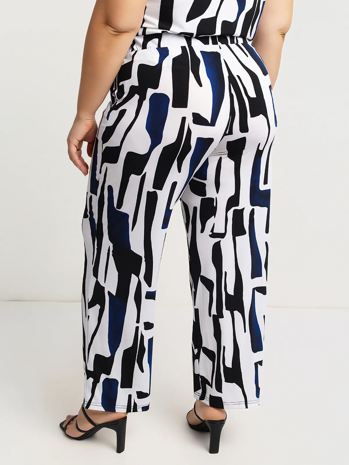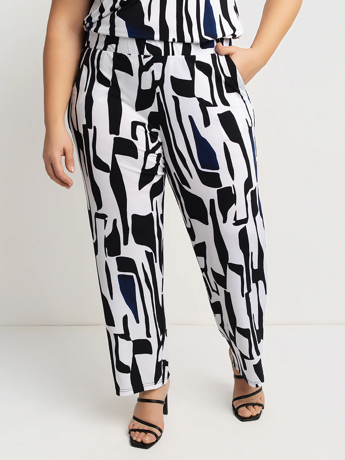 Pantalon en textile imprimé avec taille élastiquée et coupe droite. Il présente des poches latérales insérées, une longueur cheville et un motif graphique contrasté sur l’ensemble.