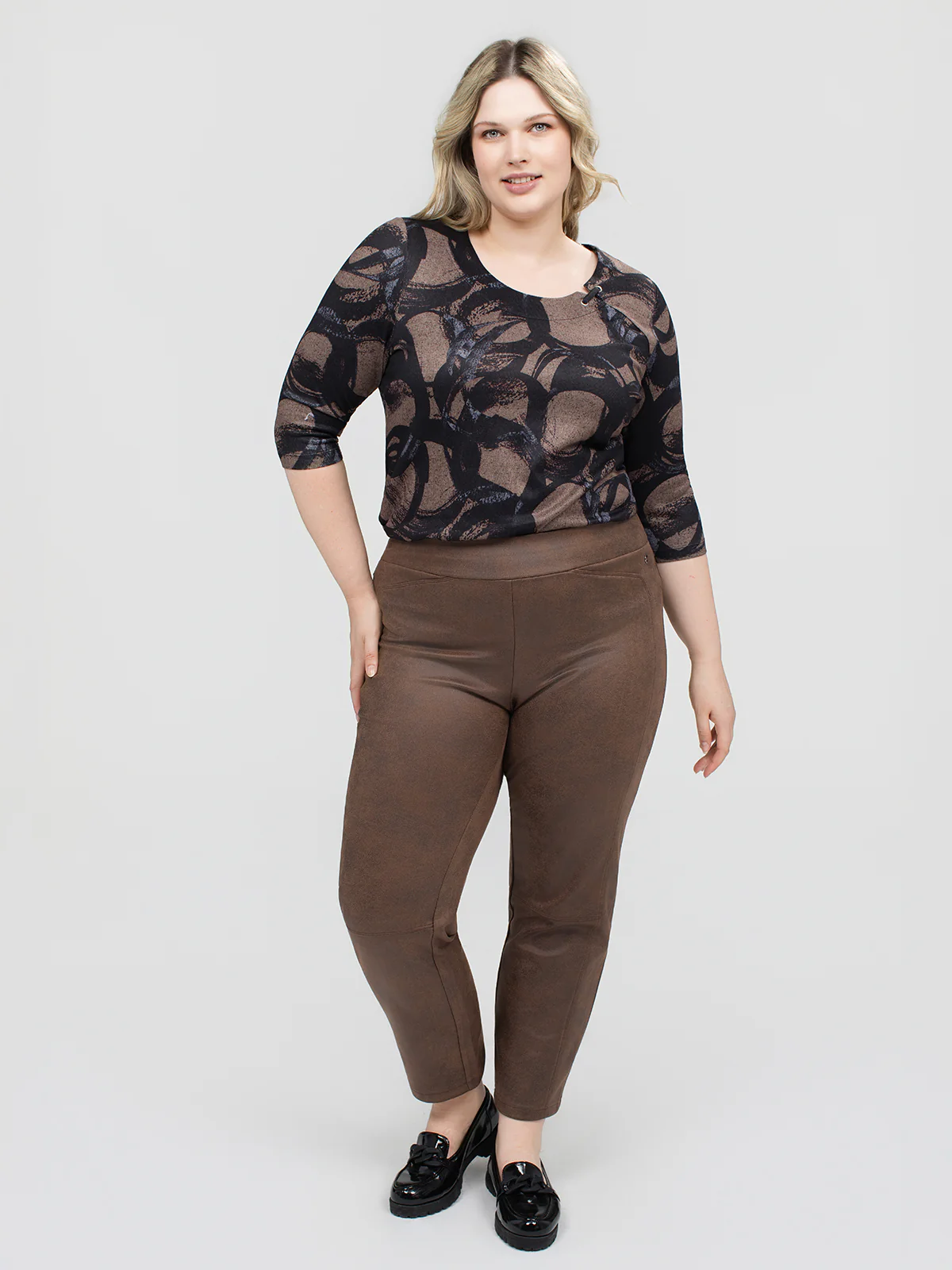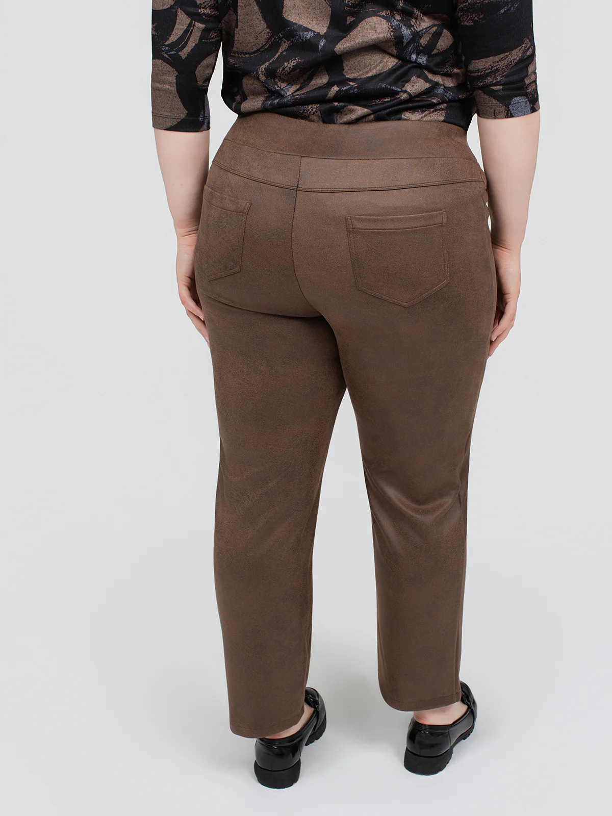 Pantalon taille plus coupe étroite à taille mi-haute avec ceinture extensible. Le dos présente deux poches appliquées et la longueur arrive aux chevilles.