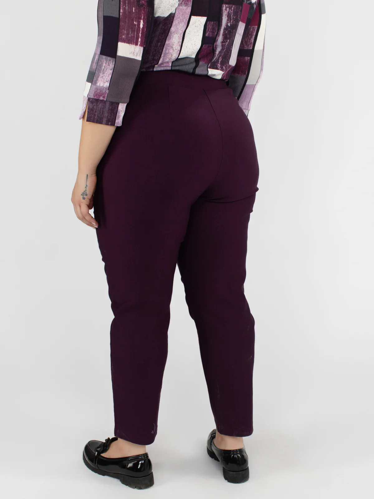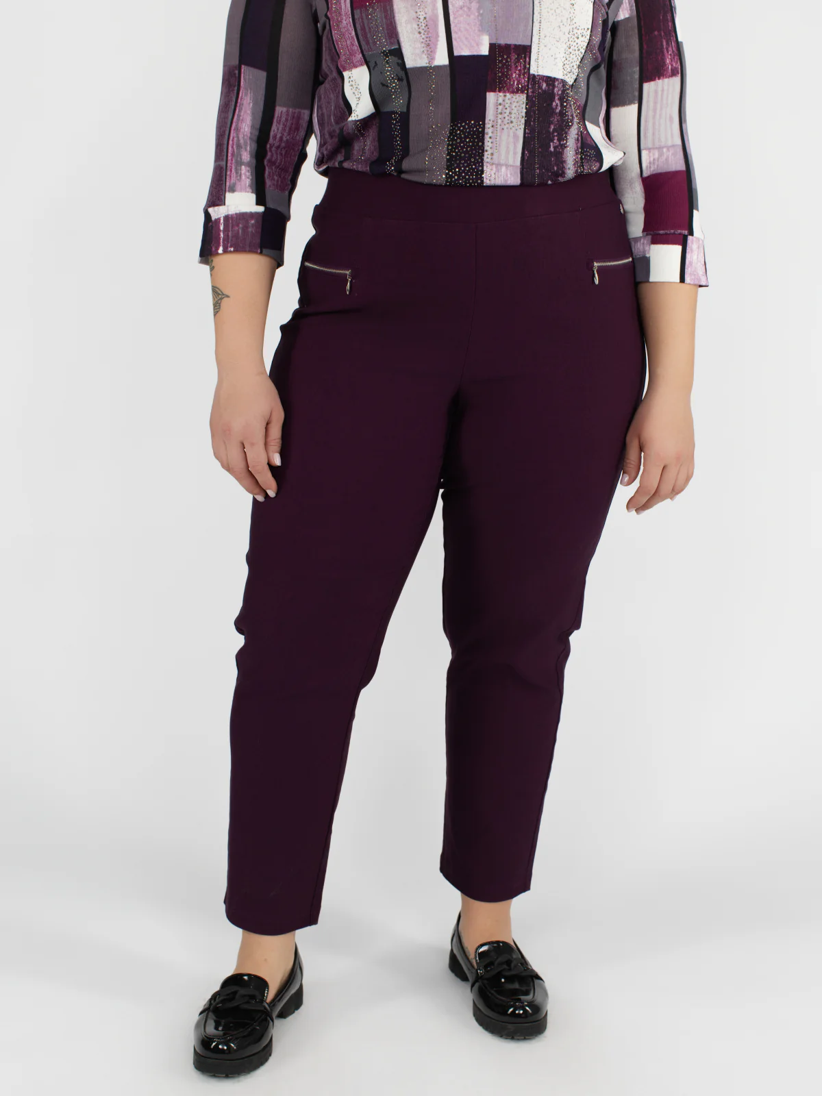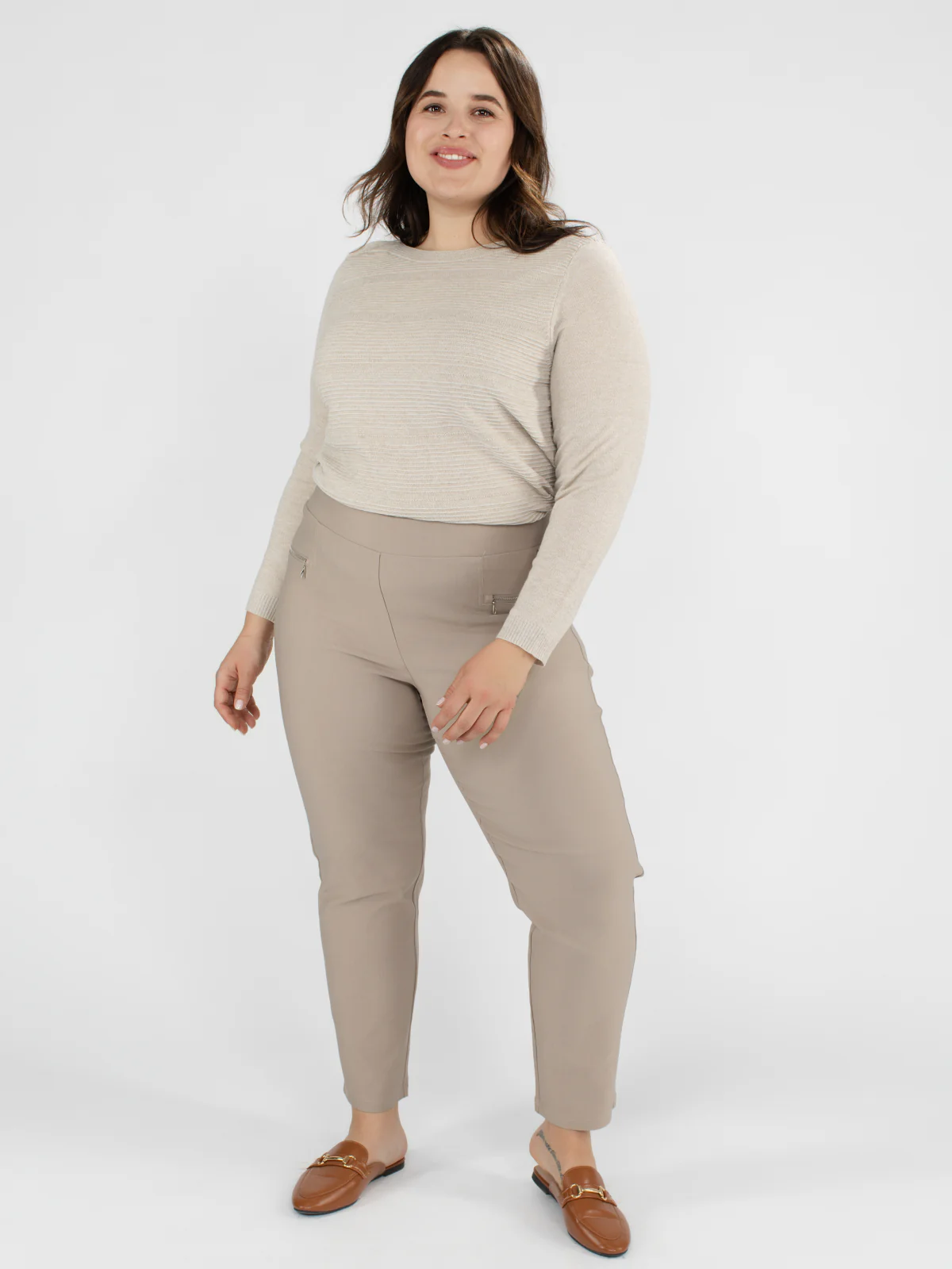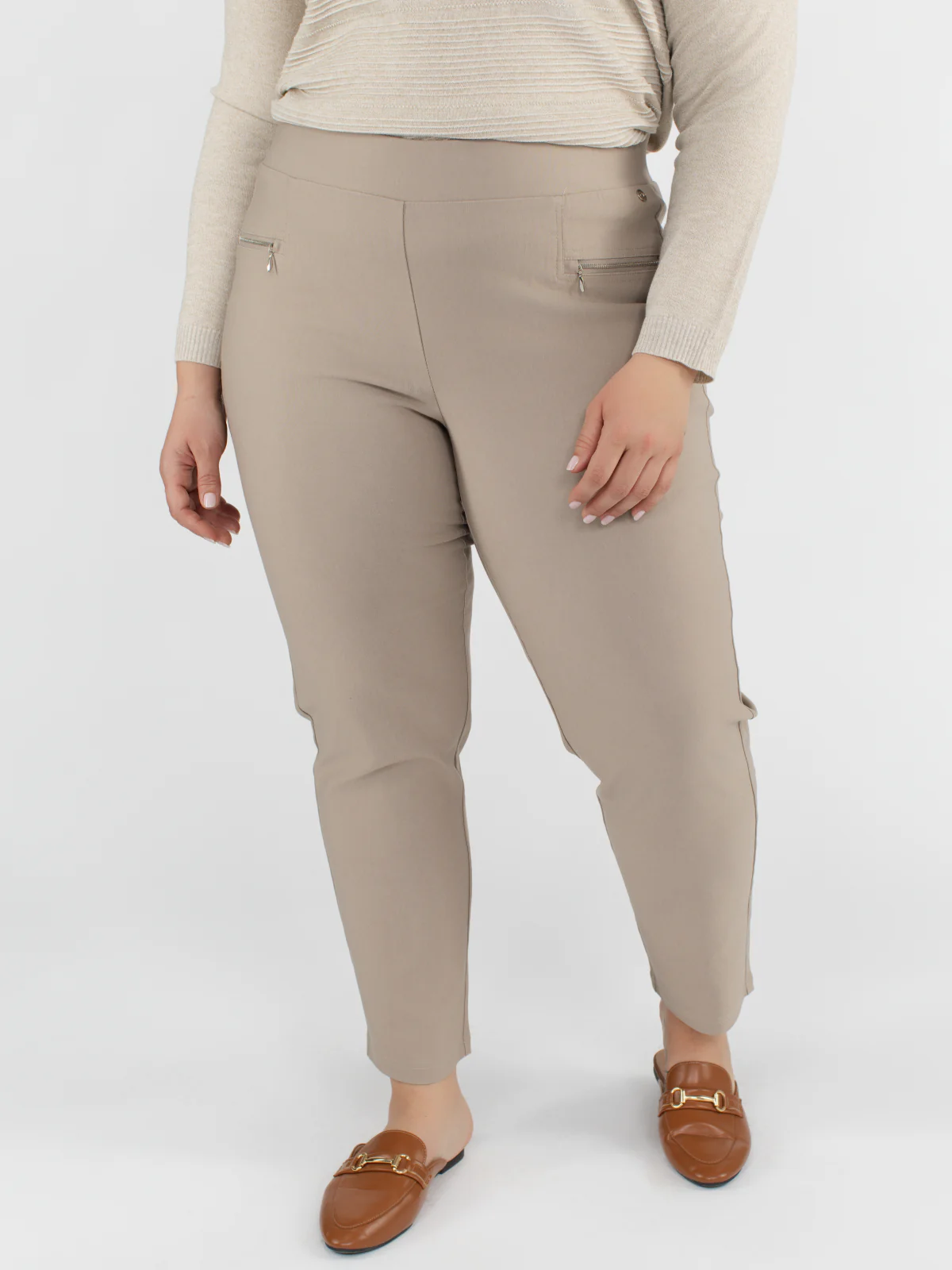 Pantalon taille plus fuselé à taille haute avec deux poches zippées à l’avant. Coupe près du corps jusqu’aux chevilles, sans fermeture visible.