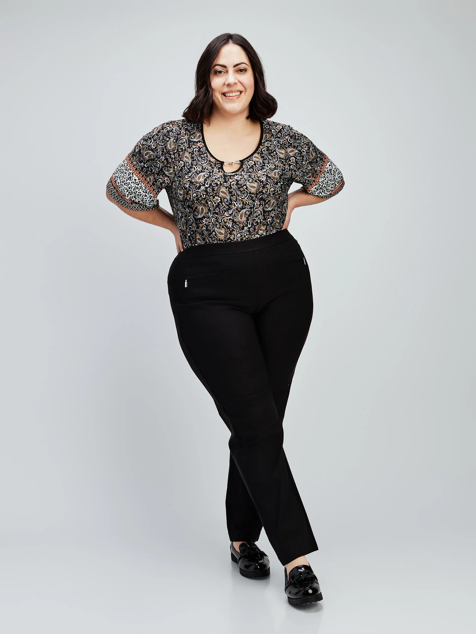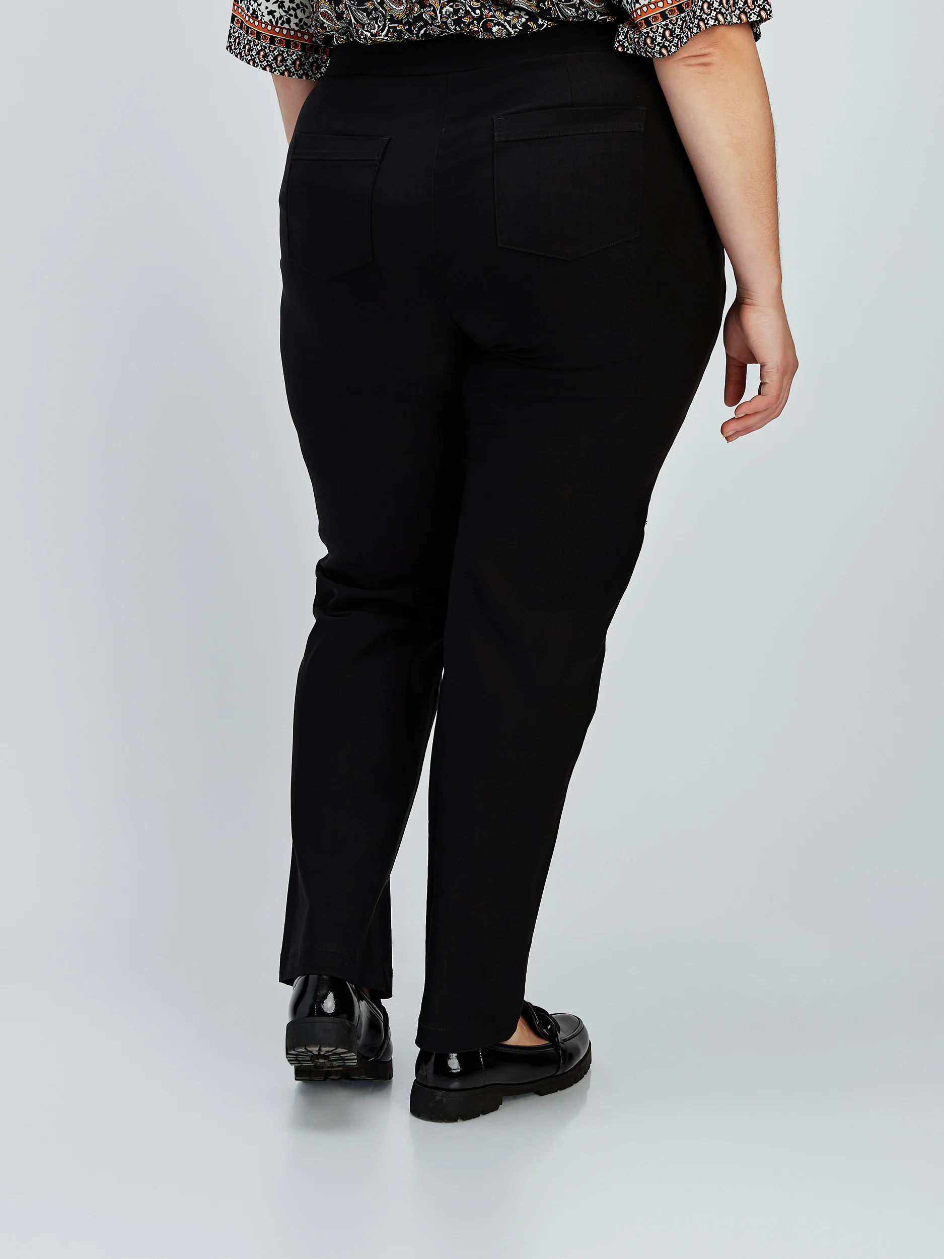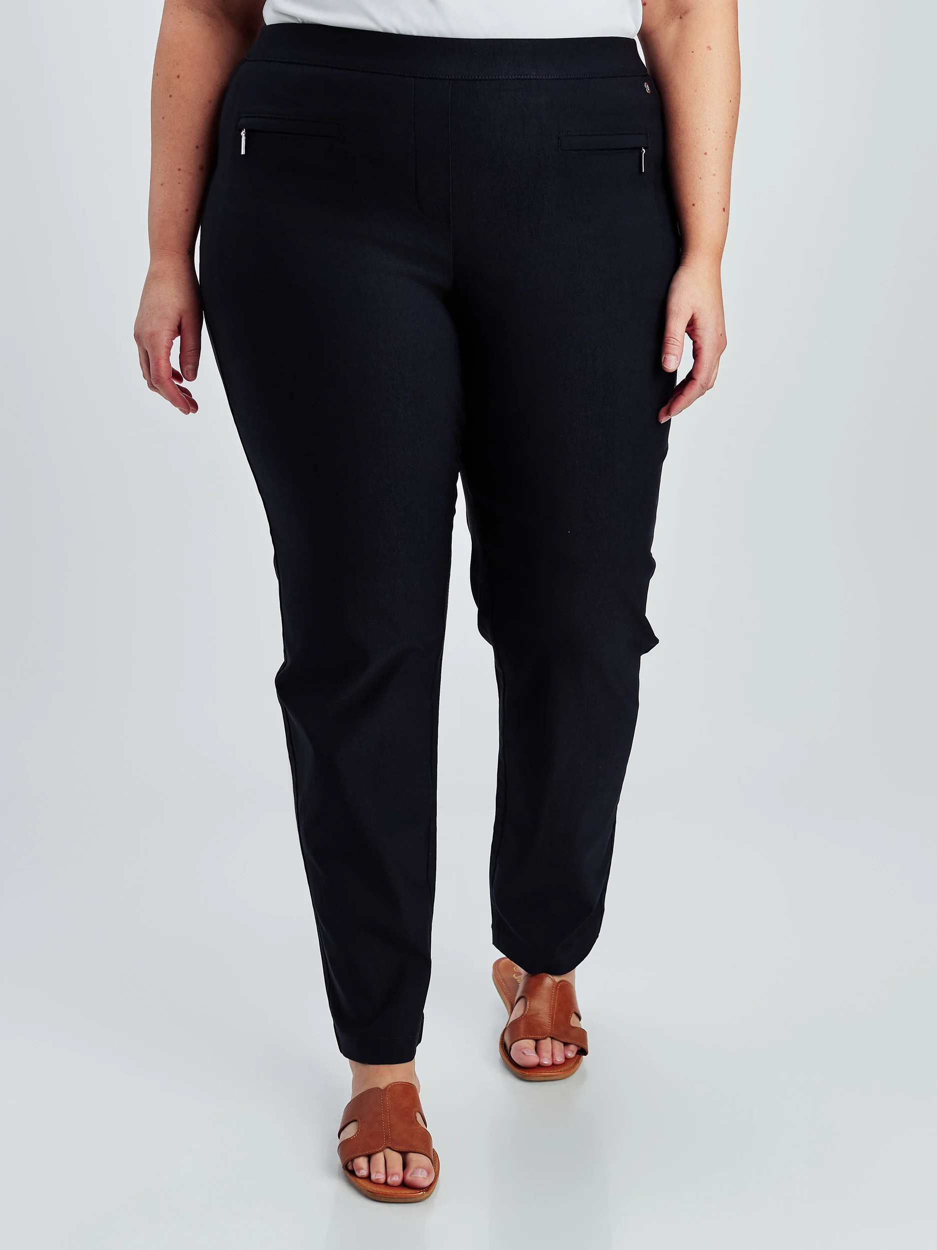 Ce pantalon à enfiler comporte deux poches avant zippées et des poches arrière pour la femme moderne en déplacement.