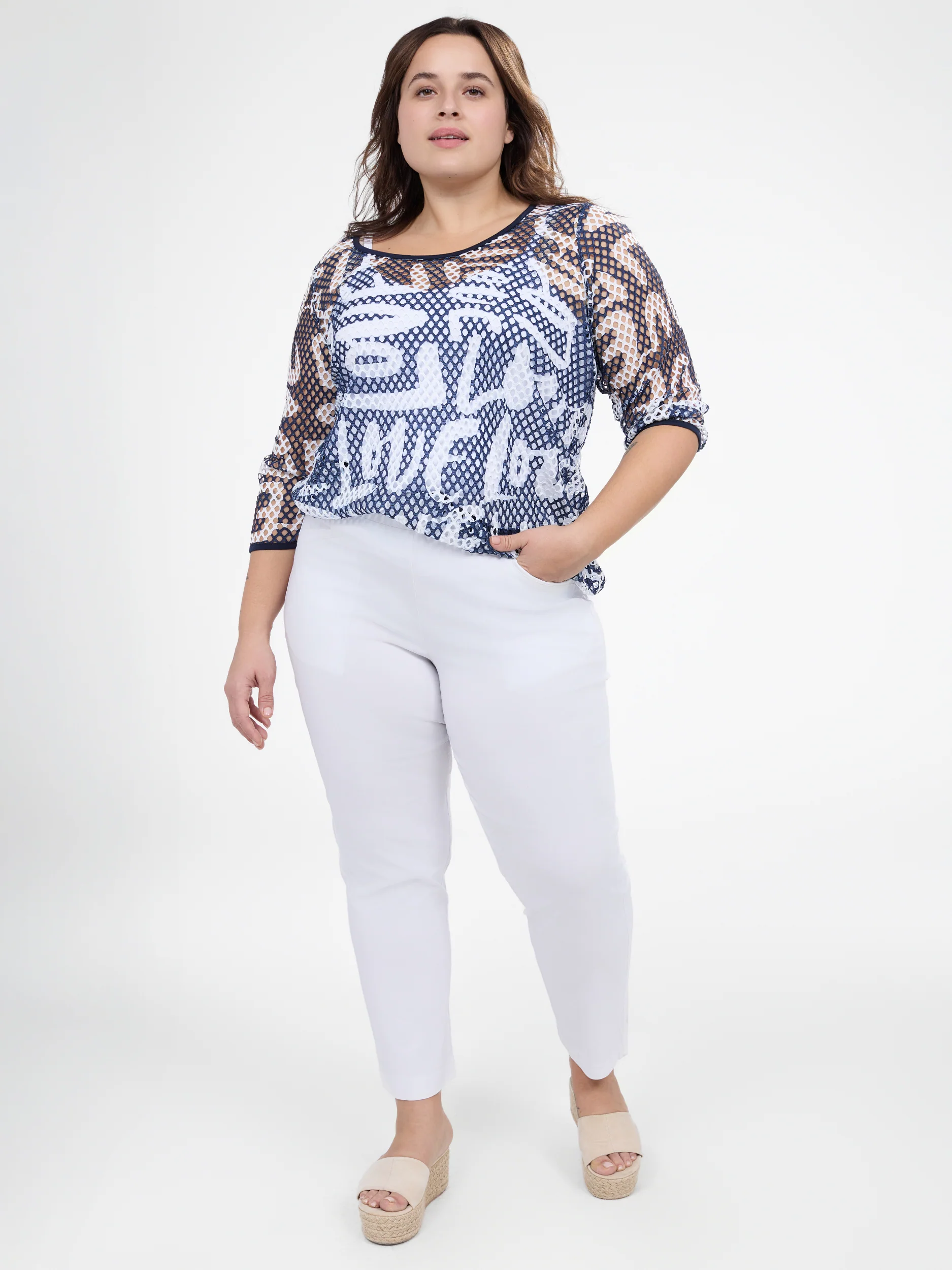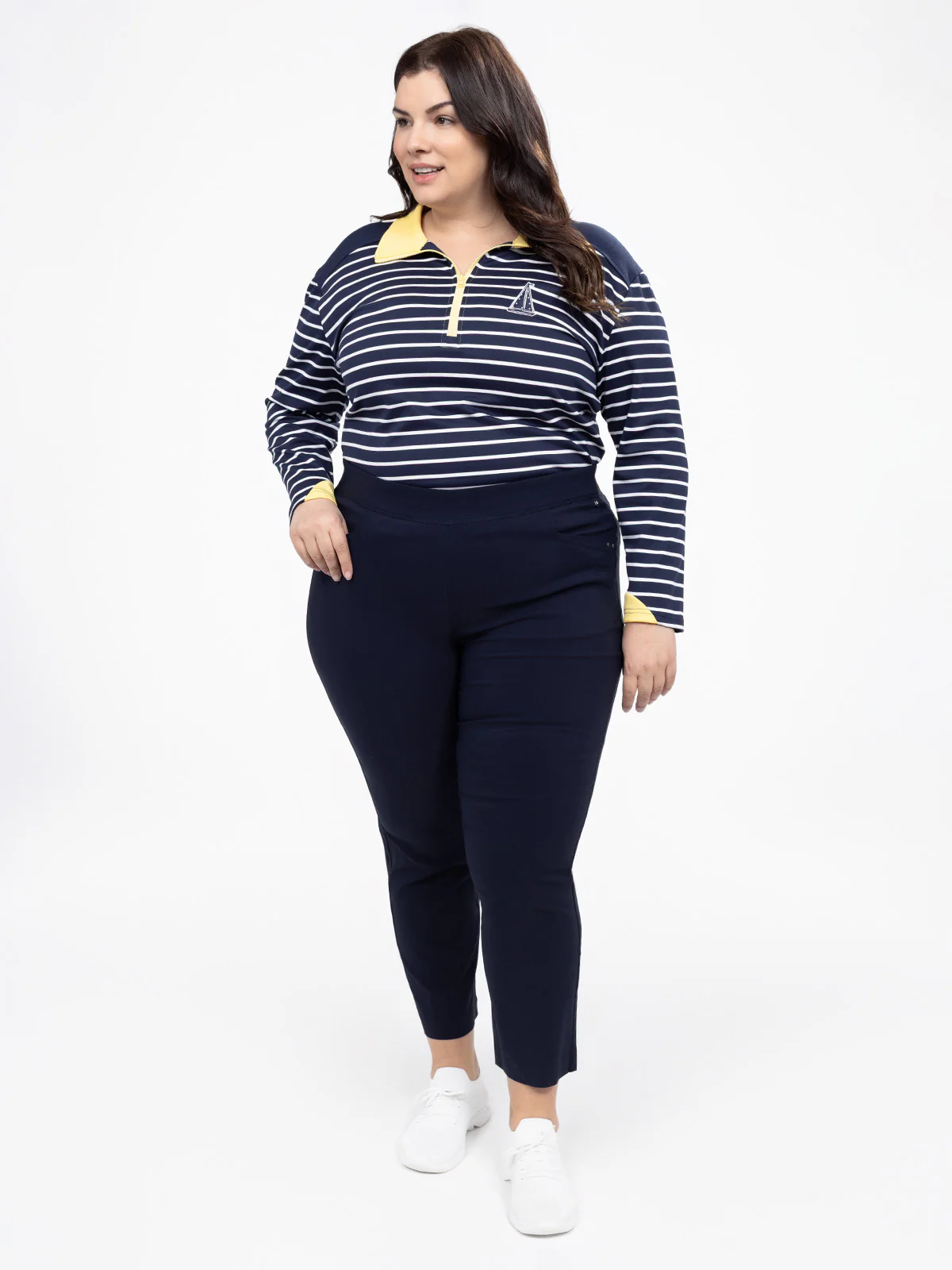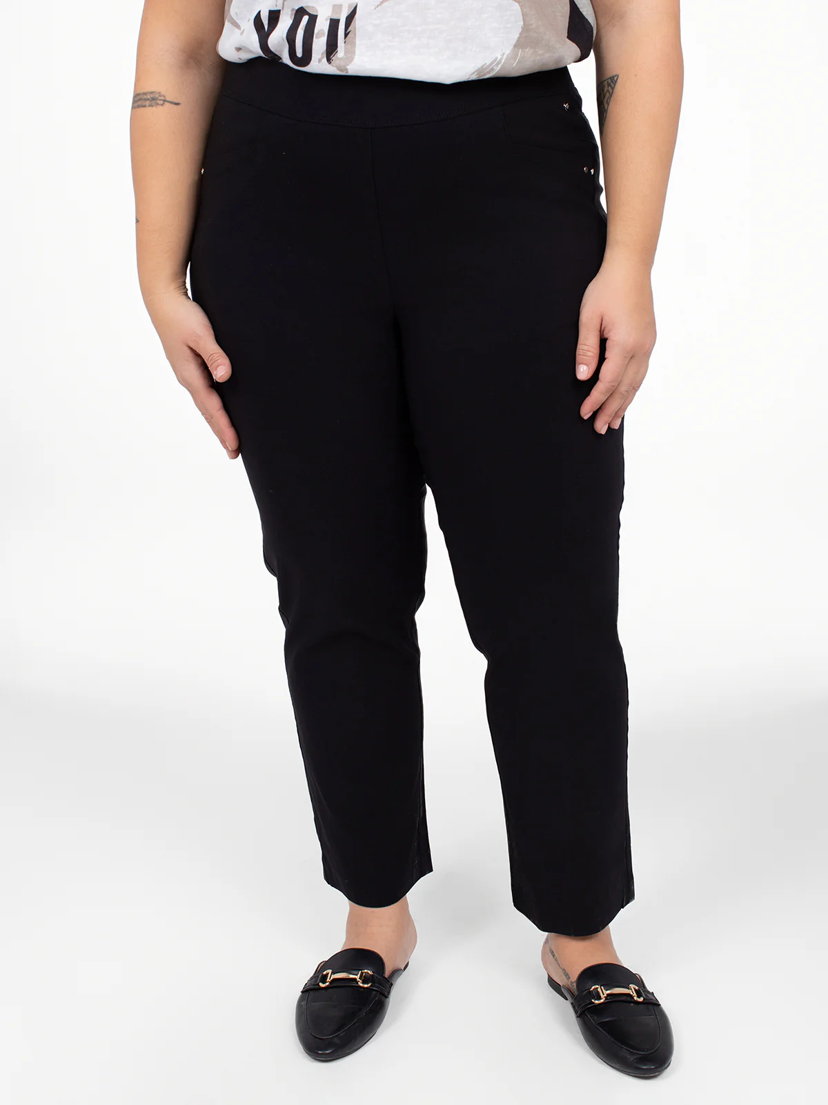 Avec sa coupe semi-ajustée et sa matière souple, ce pantalon taille plus offre un équilibre parfait entre élégance et aisance. Son style épuré et sa taille haute en font un essentiel polyvalent pour toutes les occasions.