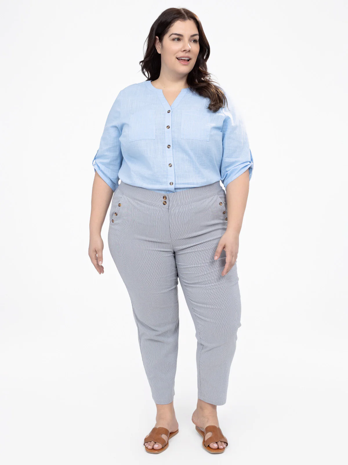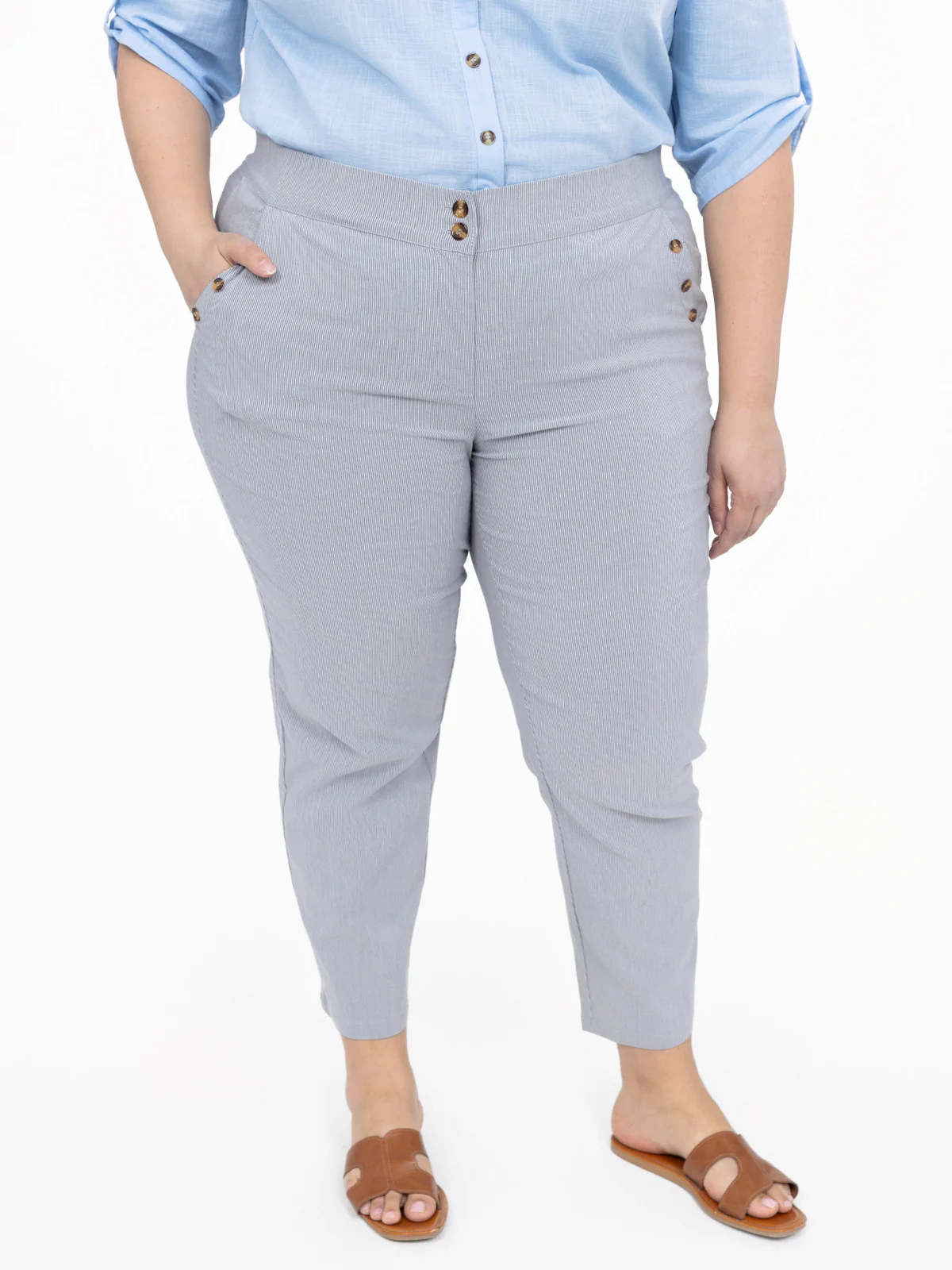 Avec sa taille haute et sa coupe droite légèrement fuselée, ce pantalon taille plus allonge la silhouette et structure la tenue. Son tissu légèrement texturé et ses boutons discrets offrent une finition soignée qui s’adapte aussi bien aux looks professionnels que décontractés.