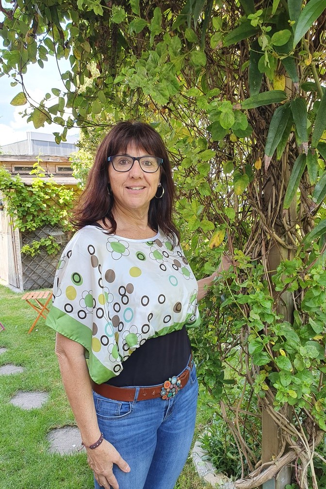 Ce modèle a été réalisé à partir d’un joli foulard en soie qui donne du peps. Il est donc en taille unique, allant des tailles 36 au 42-44 environ.