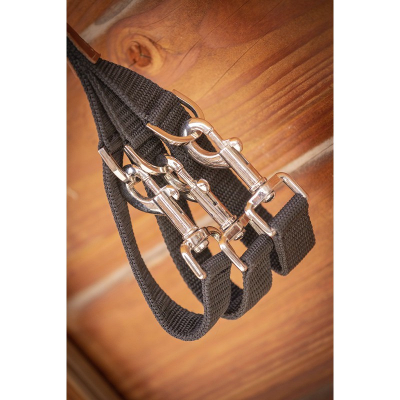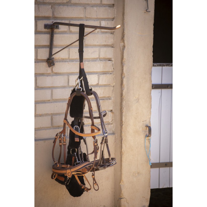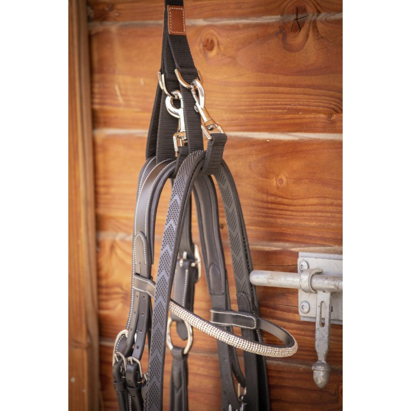 En concours comme aux écuries, accrochez vos bridons en un clic de mousquetons! Grâce à un système très simple de lanières de nylon et de mousquetons, vous suspendez facilement vos pièces de briderie sans effort et partout ou vous le souhaitez. Très résistant, c’est un accessoire d’écurie innovant, léger et ultra pratique.