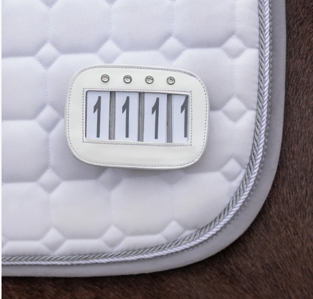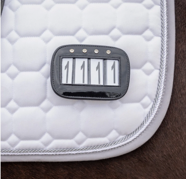 🎯 Porte-numéro Quatro (x2) – Élégance et conformité en concours Affichez votre numéro avec style grâce à ce porte-numéro verni orné de strass, fourni avec chiffres interchangeables. → Découvrez aussi nos tapis de selle adaptés à la compétition.