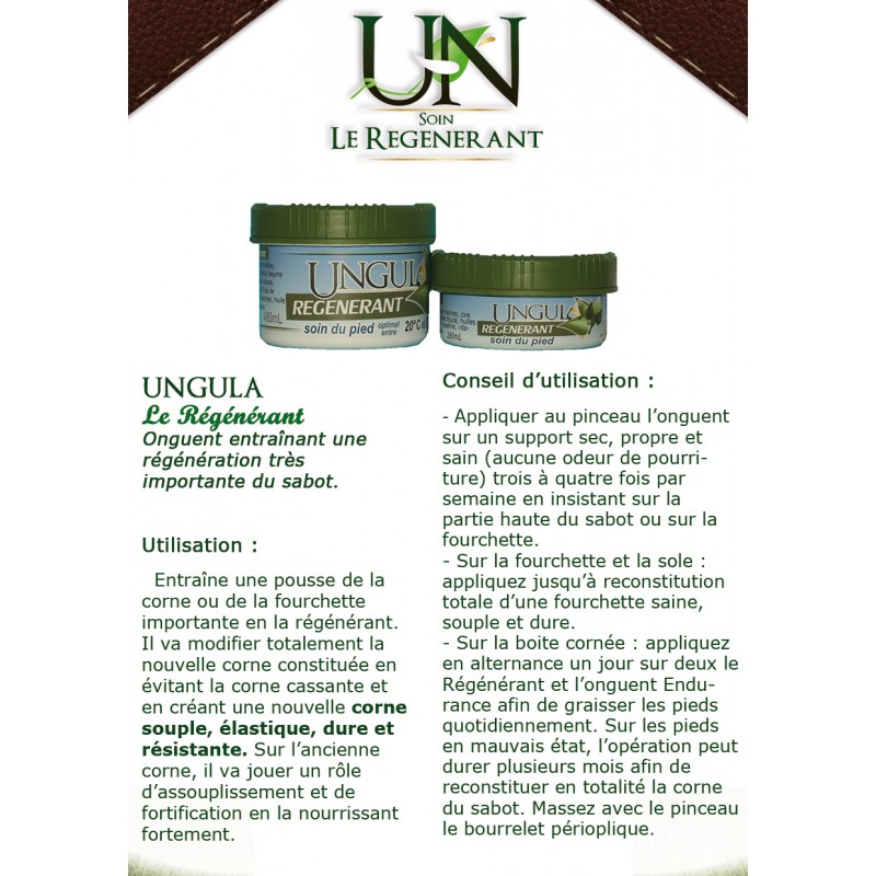 Onguent entraînant une régénération très importante du sabot. Entraîne une pousse de la corne ou de la fourchette importante en la régénérant. Il va modifier totalement la nouvelle corne constituée en évitant la corne cassante et en créant une nouvelle corne souple, élastique, dure et résistante. Sur l’ancienne corne, il va jouer un rôle d’assouplissement et de fortification en la nourrissant fortement. Existe en 280 mL et 480mL.