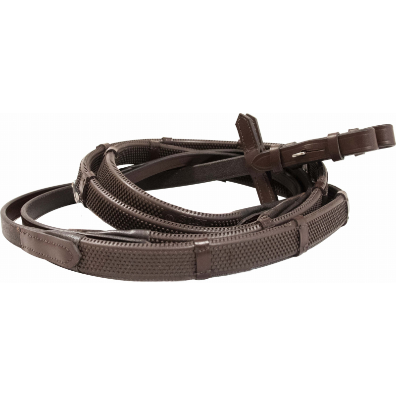 Les rênes TdeT en caoutchouc et cuir allient fonctionnalité et élégance. Conçues pour offrir un contact sûr, elles sont munies de picots antiglisse et d’arrêtoirs, assurant une tenue optimale en main, même par temps humide.