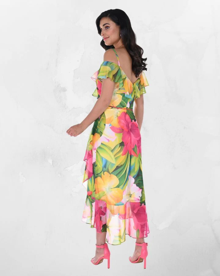 Si vous aimez les styles vibrants, vous craquerez sans doute pour cette robe Frank Lyman, un look qui a tout pour plaire. Dotée d’un motif d’hibiscus de rêve, cette robe en mousseline légère présente des détails de volants gracieux le long des épaules et sur son ourlet à plusieurs niveaux. Un lien doux cintre la taille pour créer l’apparence d’une silhouette plus définie tandis que de fines bretelles spaghetti maintiennent le look ensemble.