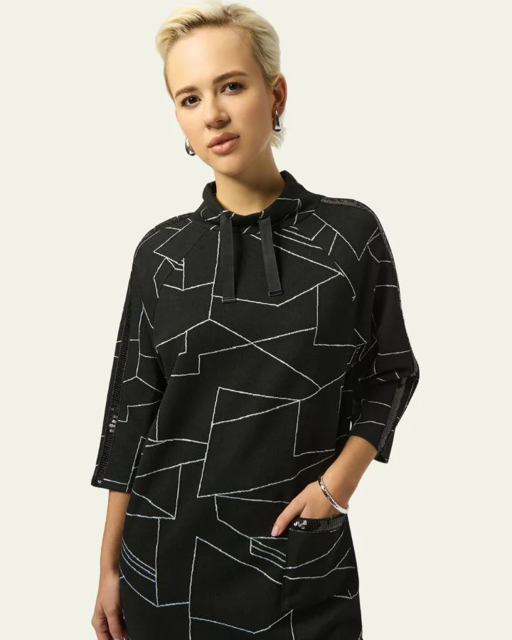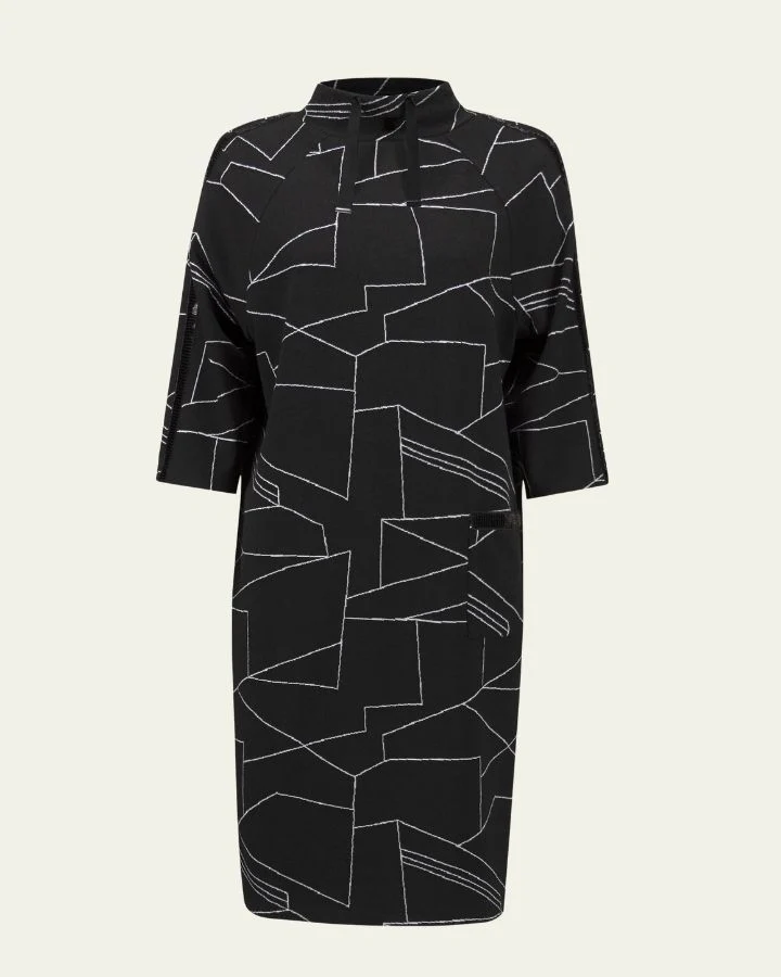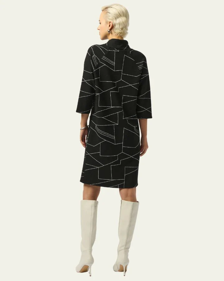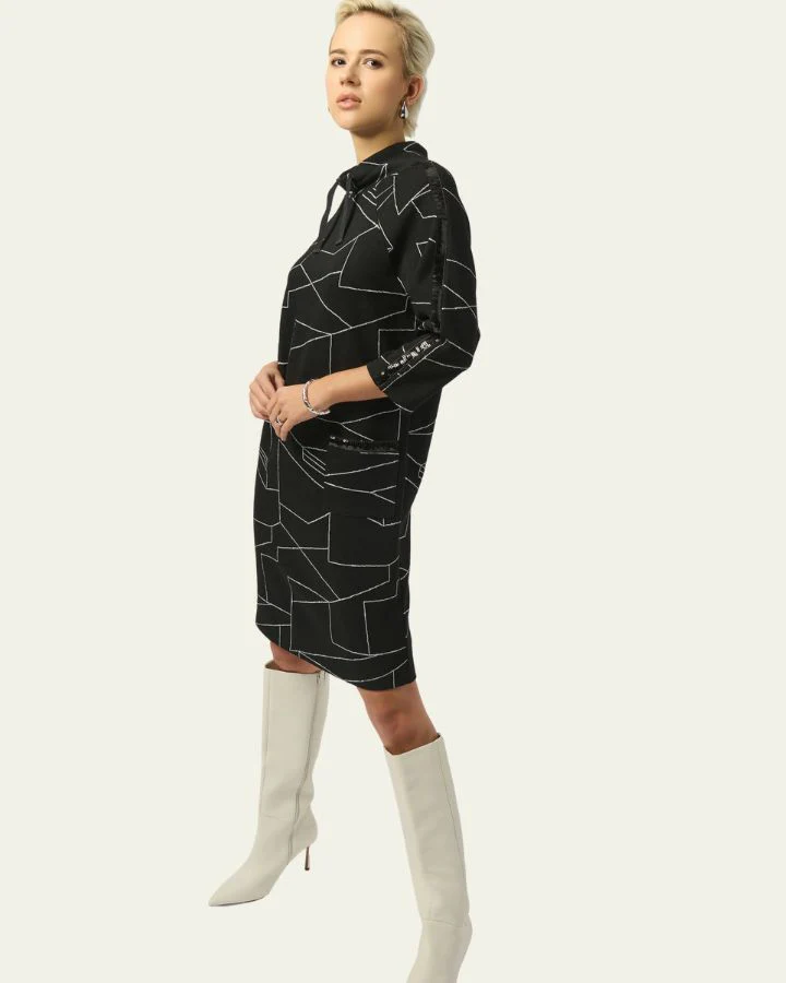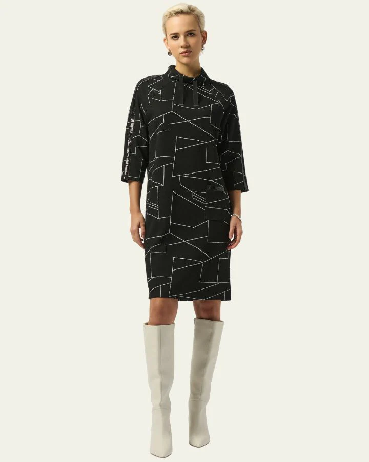 Fais sensation avec cette robe noire ornée de motifs blancs géométriques qui lui confèrent une allure artistique et contemporaine. Dotée de manches trois-quarts et d’un col montant terminé par un nœud délicat, elle allie style rétro et modernité. Sa coupe flatteuse, juste au-dessus du genou, convient aussi bien pour une réunion professionnelle que pour une sortie stylée. Porte-la avec des bottes hautes pour une touche audacieuse ou des talons pour un look plus raffiné.