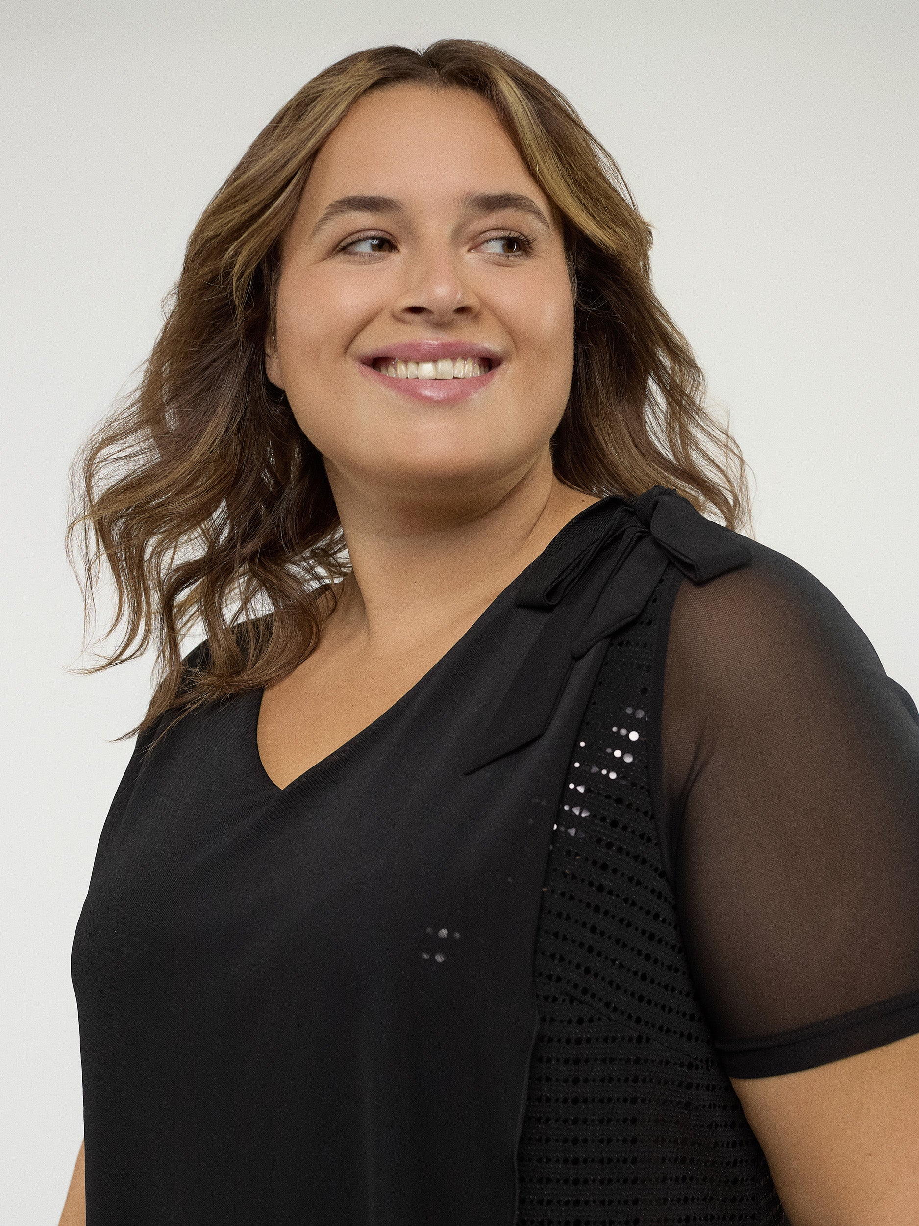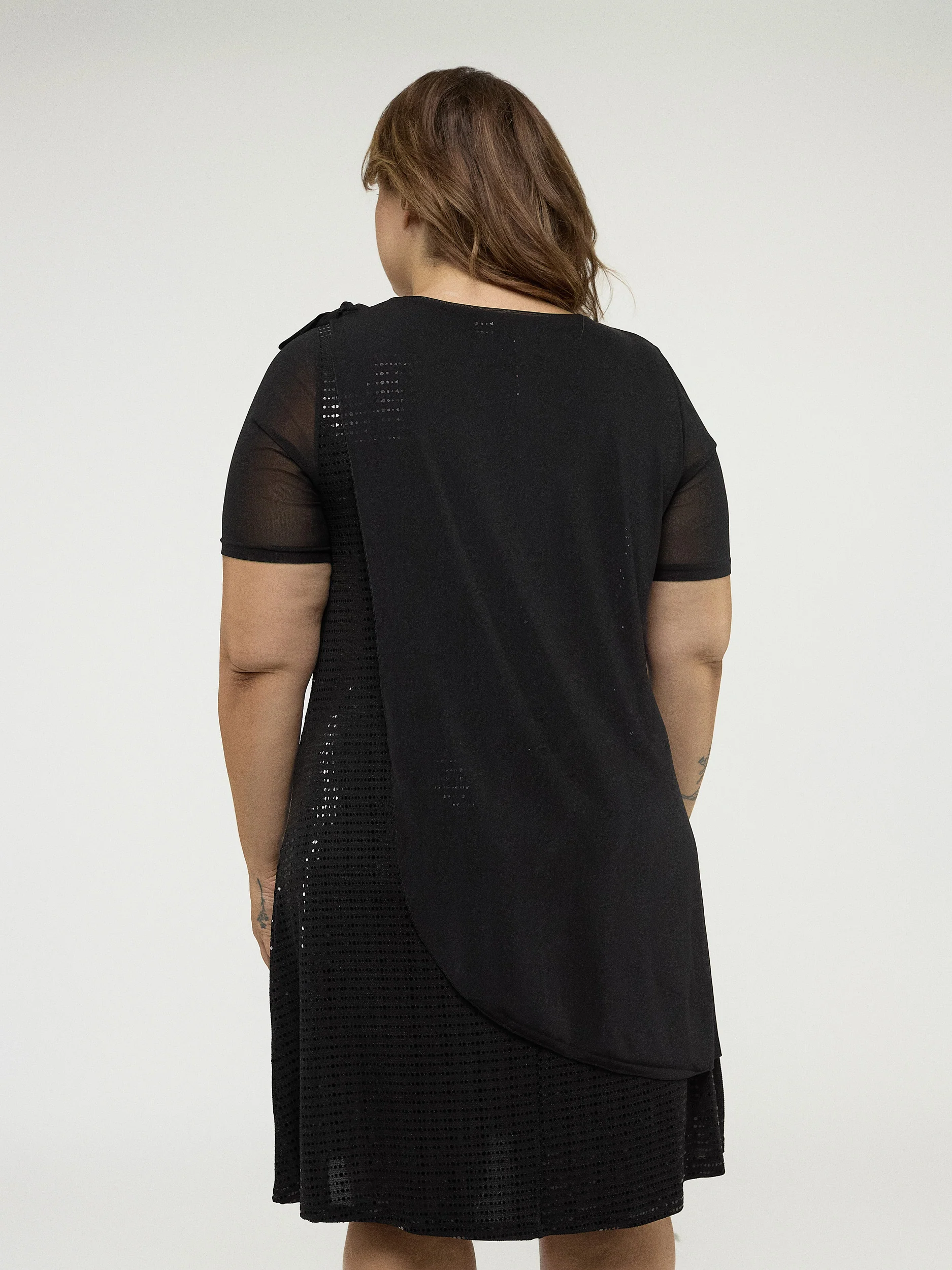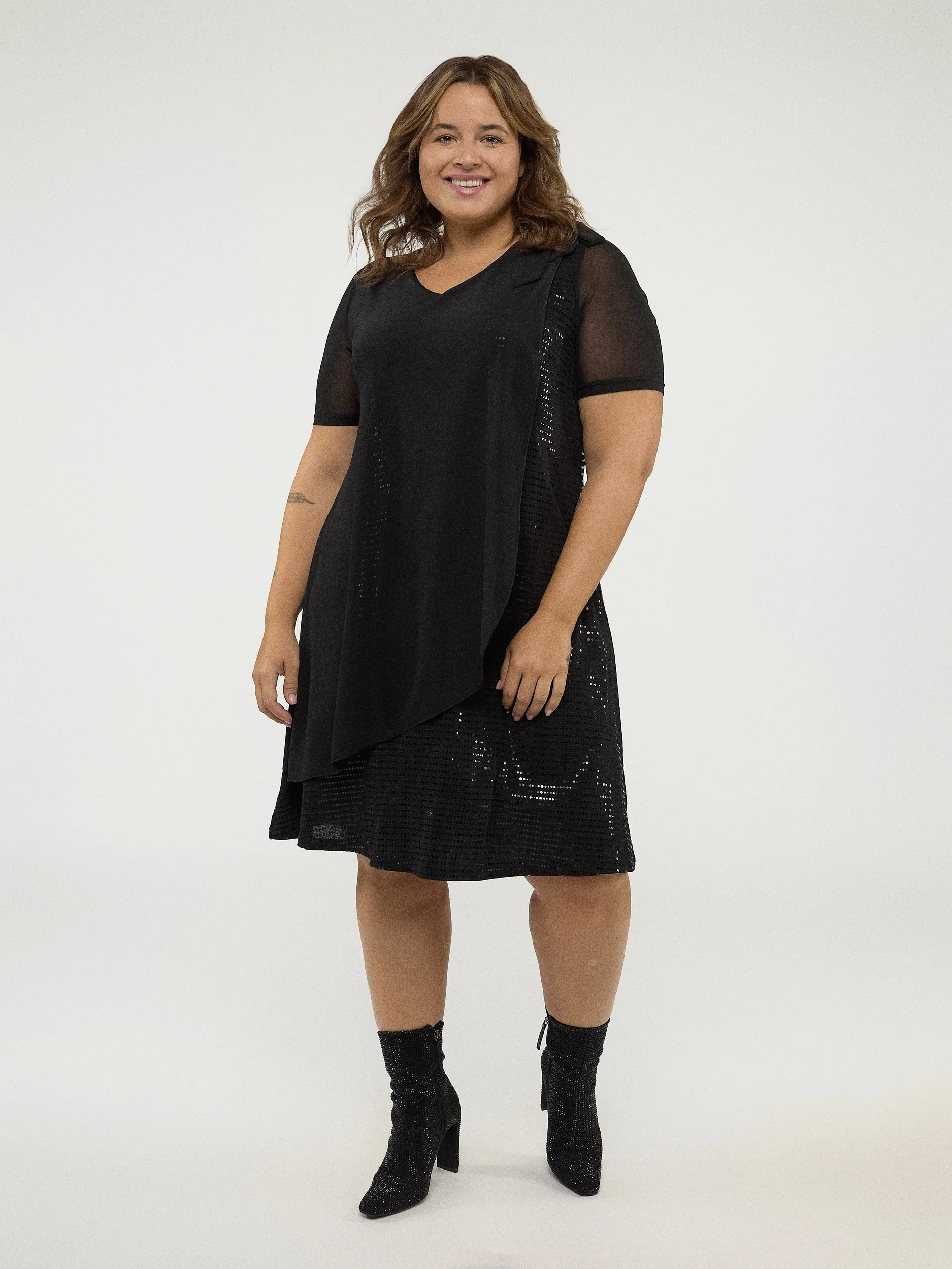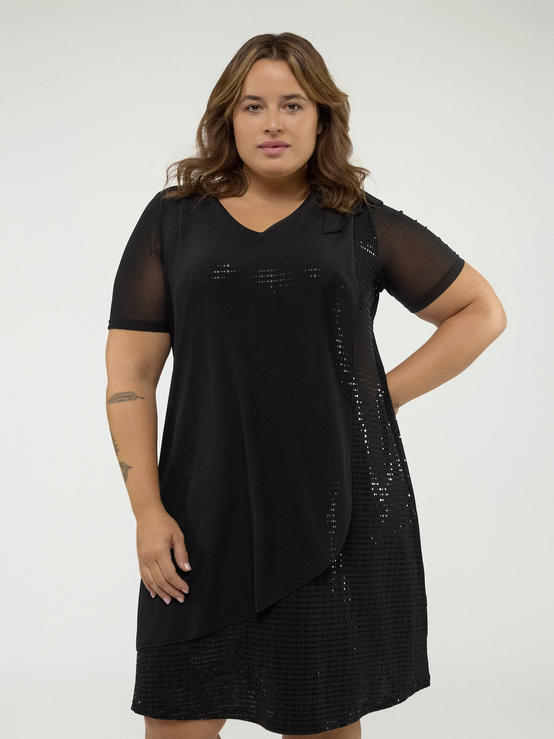 Conçue pour sublimer les courbes, cette robe noire taille plus associe délicatement transparence et opacité avec des manches en tulle et un drapé asymétrique. Les détails pailletés ajoutent une dimension lumineuse et chic.