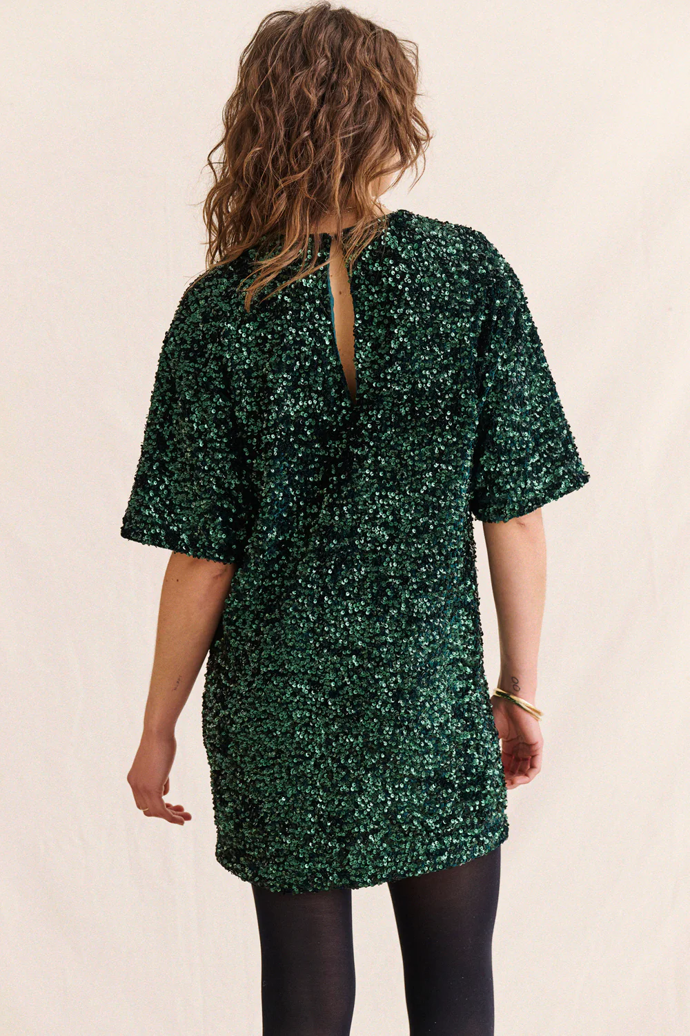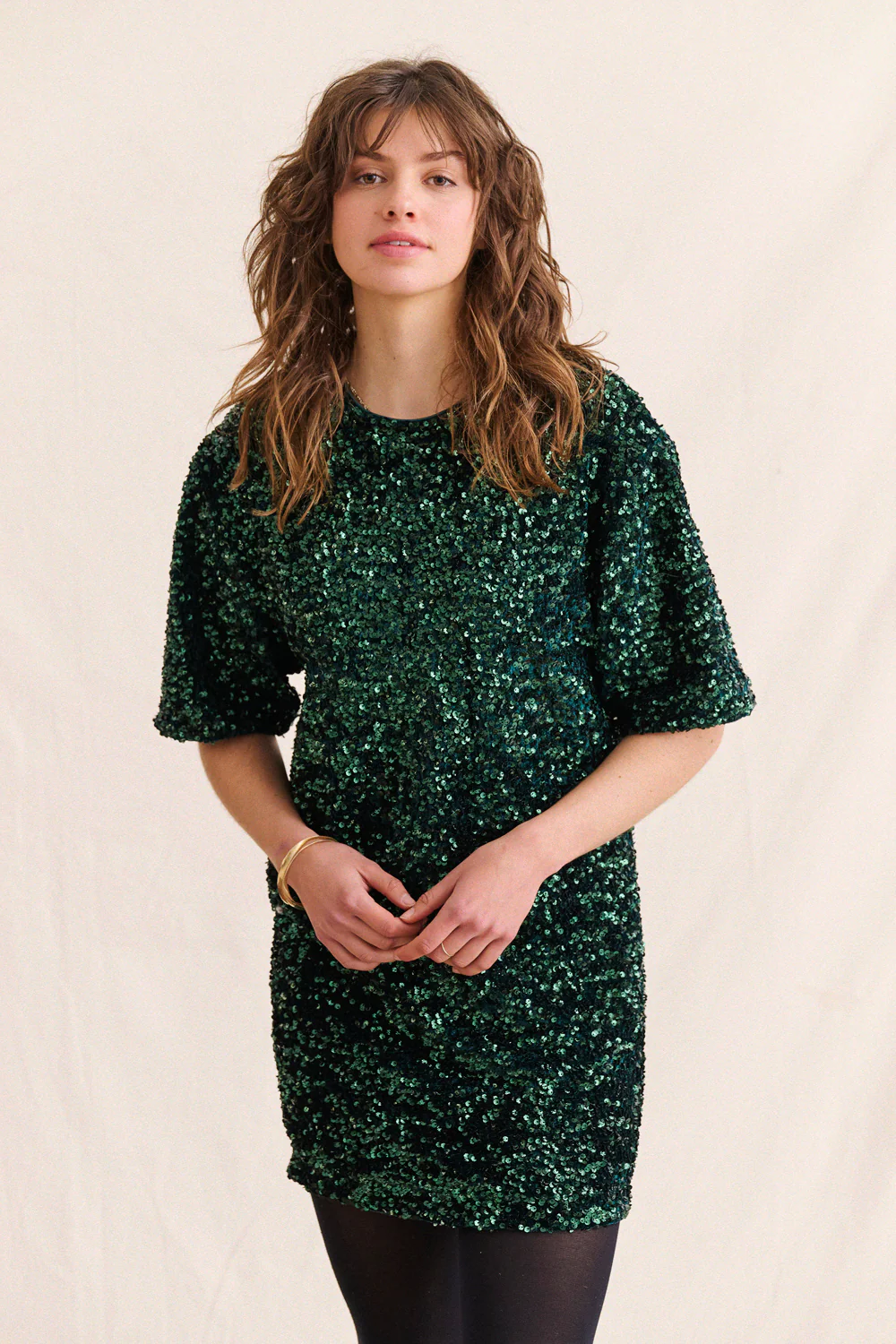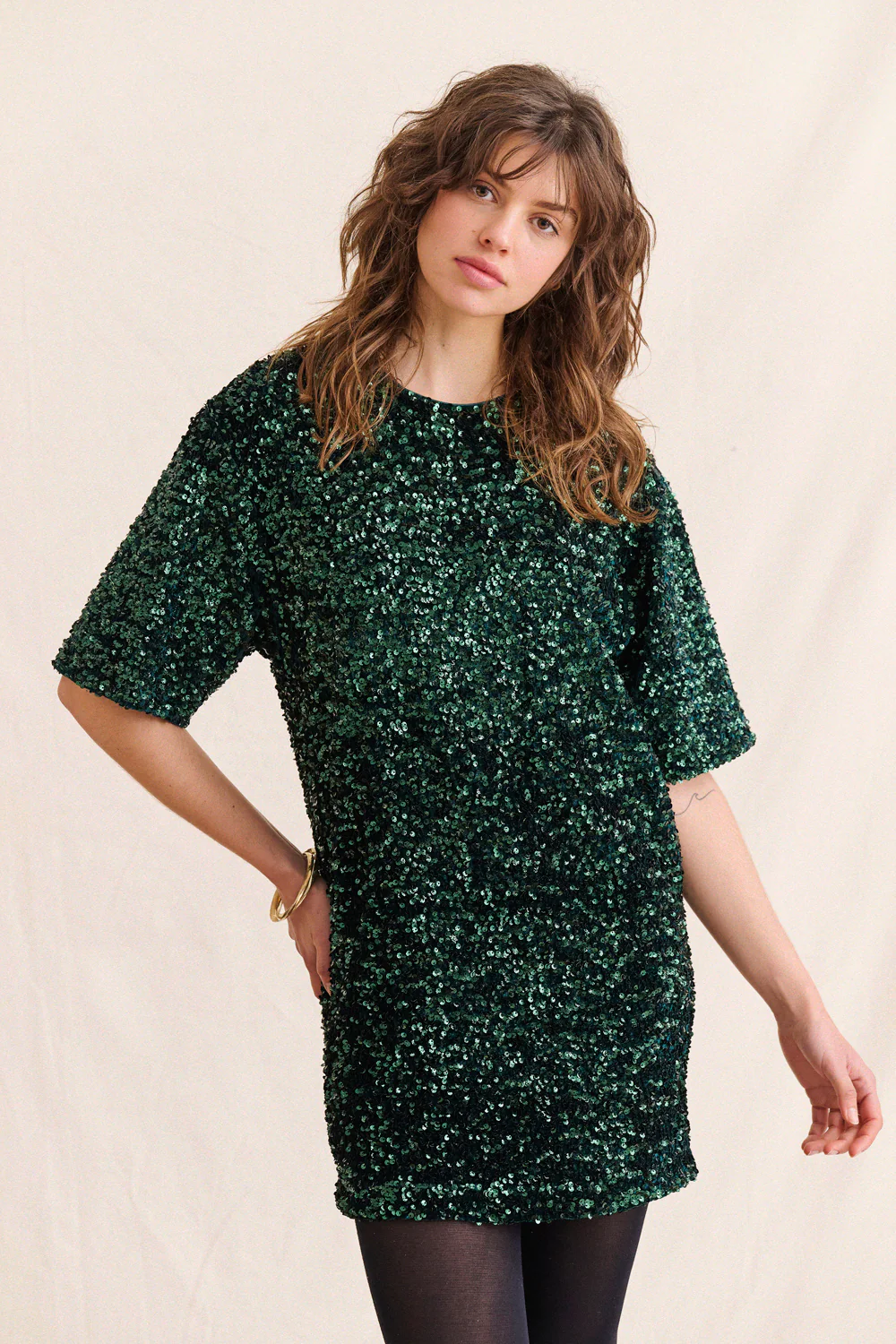 Sa coupe droite équilibre parfaitement l’éclat des sequins, et les manches légèrement amples lui donnent une allure moderne.