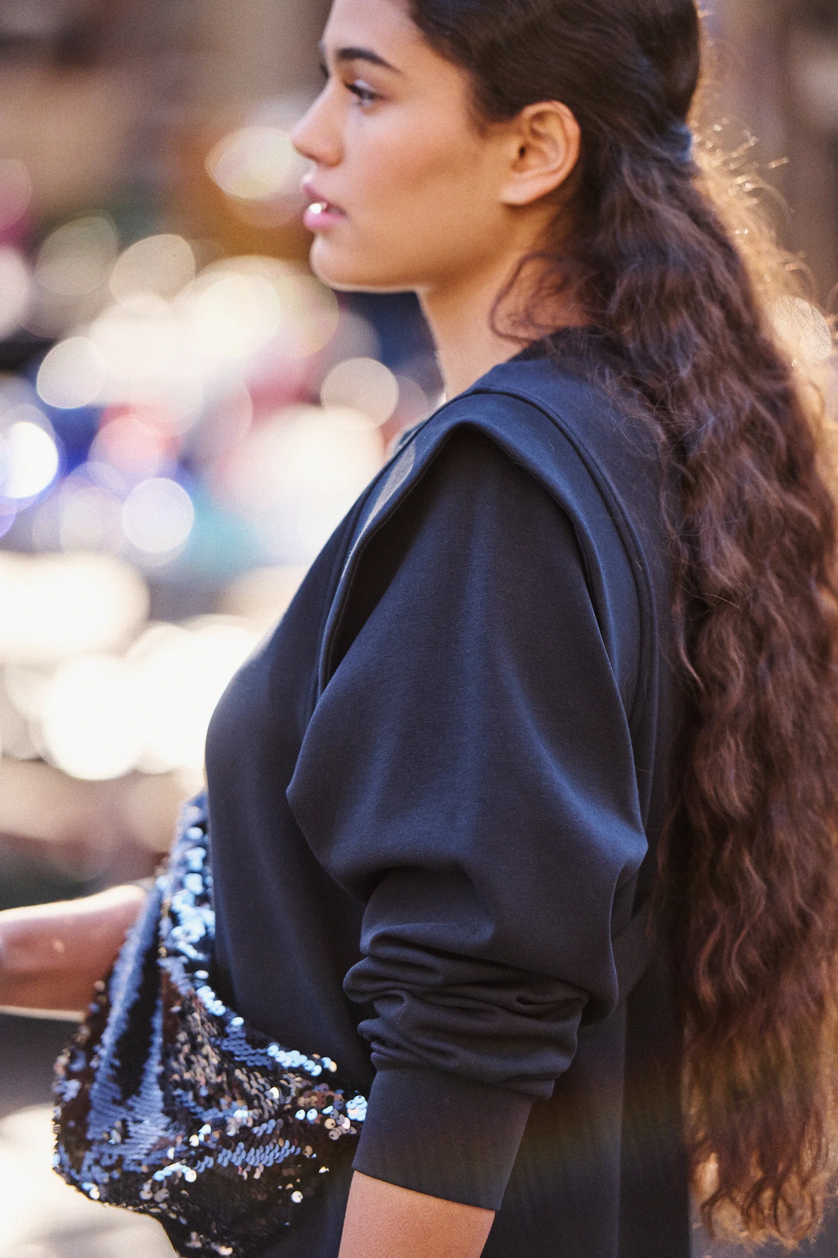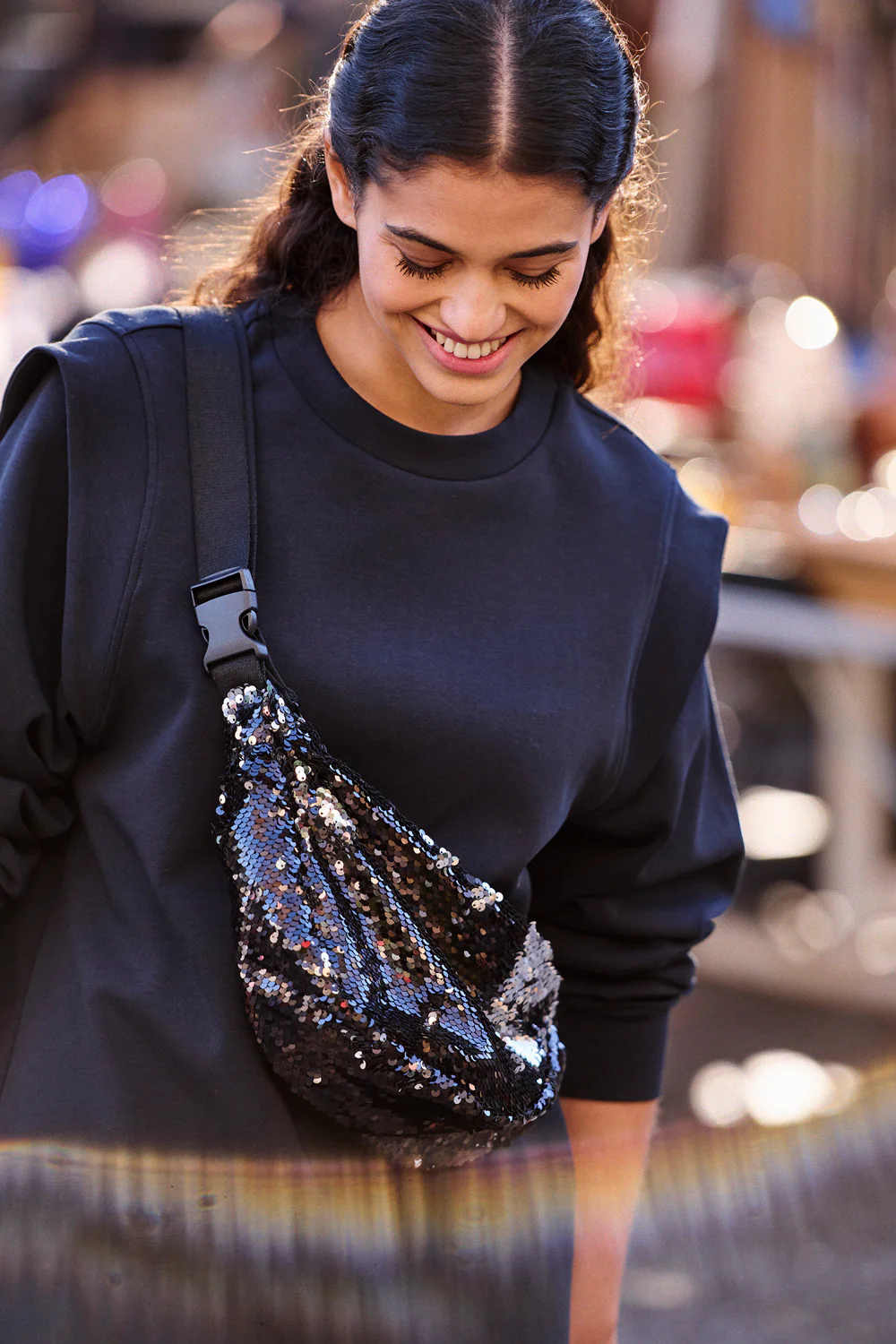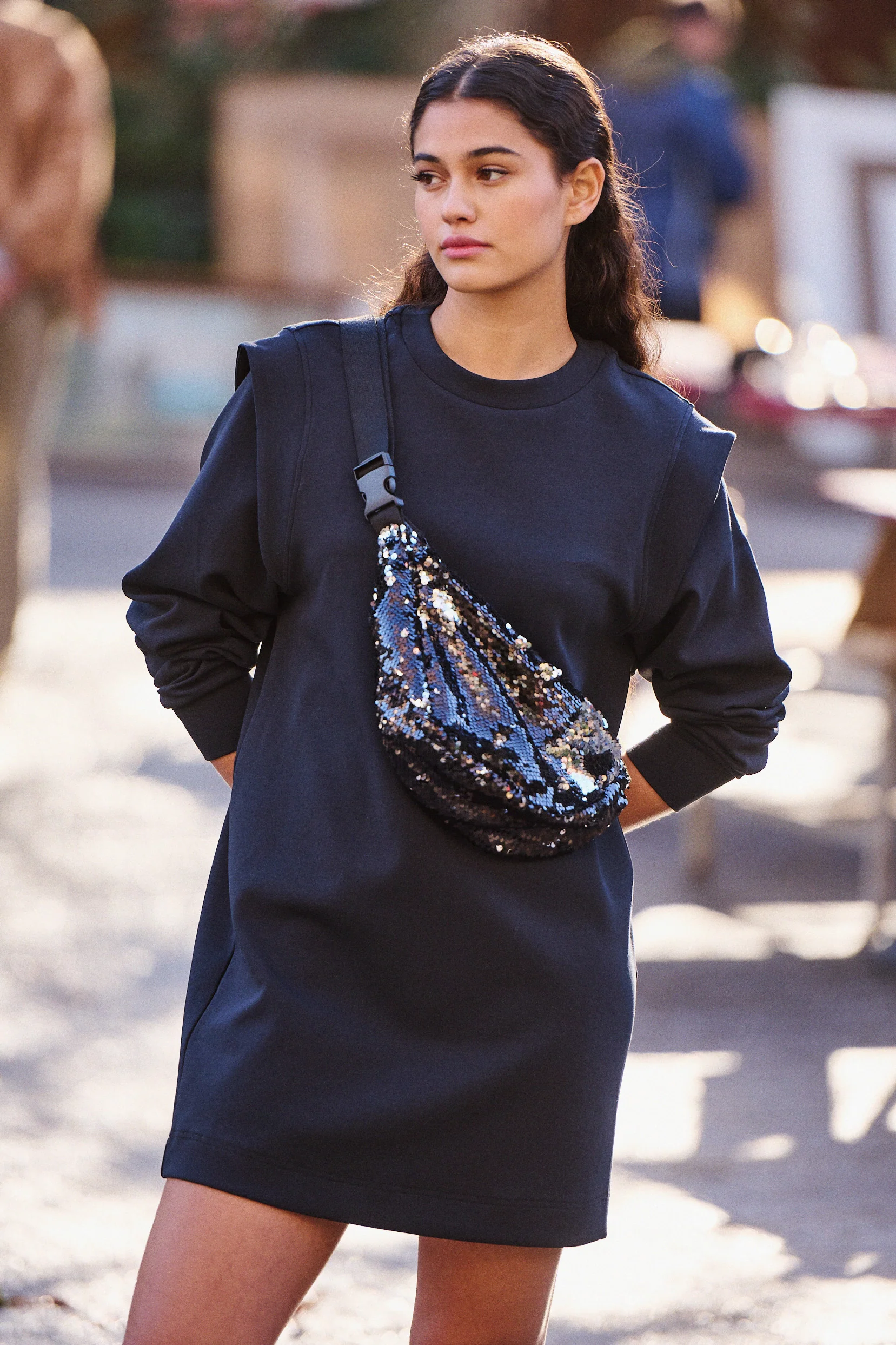 Elle porte la banane Alban à sequins noirs