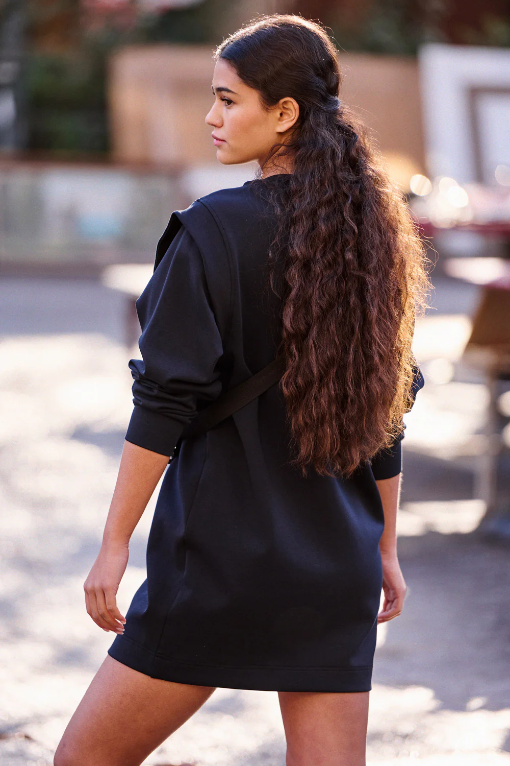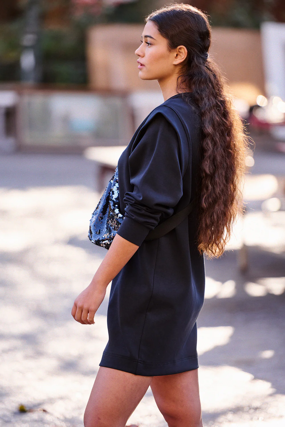 » On adore les robes sweat, hyper cool, à porter avec une paire de baskets ou de Vans. » Robe sweat courte en néoprène – Col rond – Manches longues – Ailerons aux épaules Daniela mesure 1m73 et porte du 36 Elle porte la banane Alban à sequins noirs