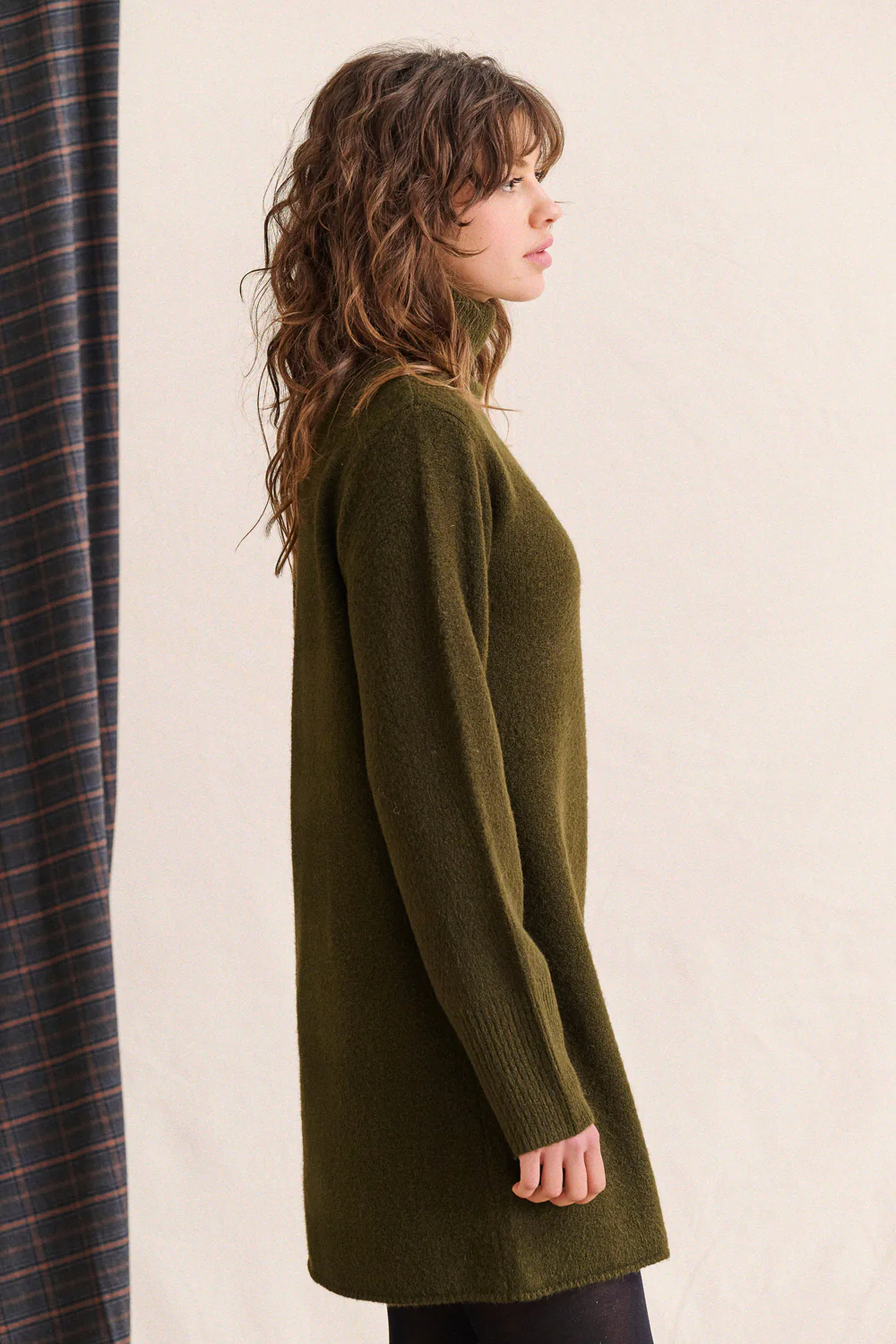 Sa coupe droite effleure le corps sans le marquer, son col roulé enveloppe joliment le port de tête. Avec des collants opaques ou des bottes hautes, elle crée ce look facile et affirmé, celui qui traverse la saison sans jamais lasser.