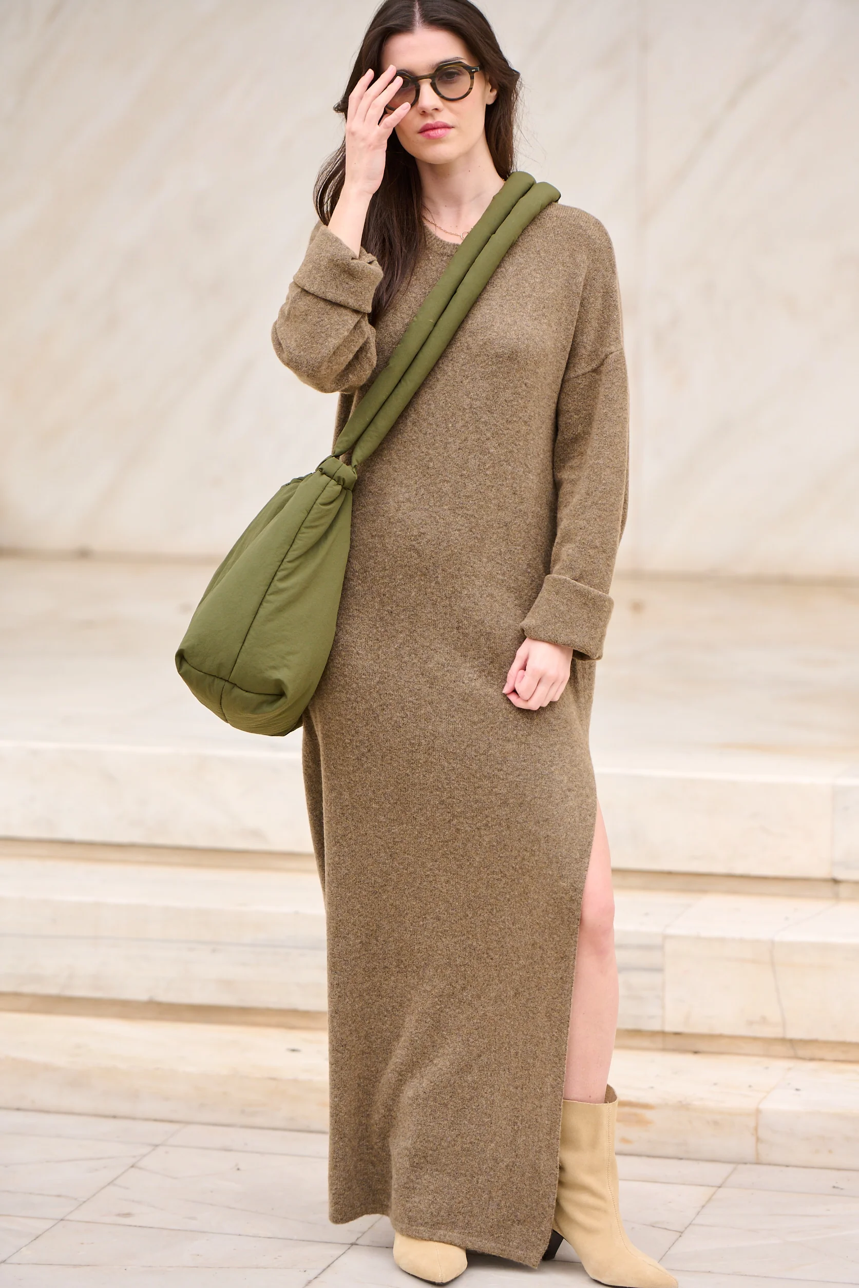 Elle porte le sac April kaki.