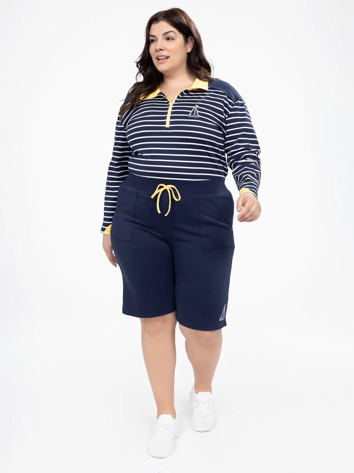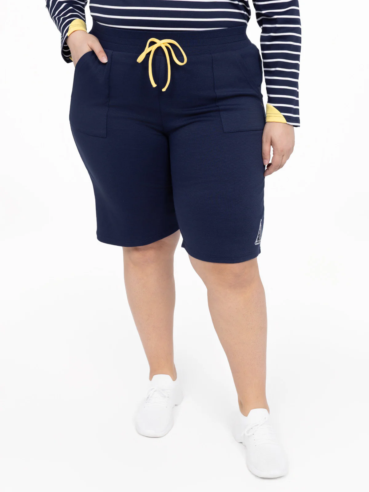 Idéal pour un look décontracté, ce bermuda en taille plus associe une coupe ample à une taille ajustable par cordon. Ses poches profondes et sa broderie sur le côté ajoutent une touche de style discret.