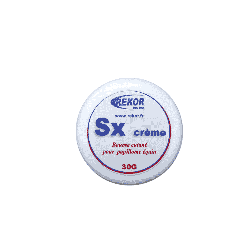 SX Crème Verrues et sarcoïdes Rekor E.P.C : Anciennement Sarc X, enfin une réponse au traitement des verrues et des sarcoïdes. SX Crème représente une vraie révolution dans le traitement des sarcoïdes. De composition entièrement naturelle, SX Crème est une pommade qui va permettre d’aider à éradiquer les sarcoïdes petites ou grosses. L’application de SX Crème sur la sarcoïde provoque une stimulation des réactions immunitaires de l’organisme jusqu’à provoquer un rejet des cellules “atypiques “. La réaction induite par l’application de SX Crème peut se traduire par l’apparition de pus et s’accompagner d’une réaction inflammatoire qui conduit à une destruction de la tumeur. A ce stade, le processus peut être temporairement douloureux. Ingrédients : Sanguinaire, Chlorure de Zinc, excipent. Ne contient aucune substance interdite Présentation : Pommade rougeâtre foncé Conditionnement : Pot de 30 gr ou pot de 60 gr. Précaution d’emploi : Ne contient pas de substances interdites. Les sarcoïdes sont une des tumeurs cutanées les plus fréquentes chez le cheval. Il s’agit de tumeurs bénignes de la peau d’origine virale généralement très localisées ( principalement membres, tête, encolure et fourreau). Outre le fait qu’elles soient peu esthétiques, elles sont souvent mal placées, peuvent interférer avec le harnachement ou subirent des traumatismes, et s’ulcérer et s’infecter. Mode d’emploi : Sur des sarcoïdes ne pouvant être recouvertes d’un pansement : Appliquer SX tous les jours pendant 5 jours et observer la réaction immunitaire. La sarcoïde se modifie progressivement, se dessèche et finit par tomber. Si la sarcoïde ne disparaît pas totalement à la première application, une nouvelle application de 5 jours peut être nécessaire.Sur des sarcoïdes pouvant être recouvertes d’un pansement : Appliquer SX en une couche de quelques mm d’épaisseur et recouvrir d’un pansement. Au bout de 5 jours, retirer le pansement. La sarcoïde apparaît enflammée et parfois douloureuse. Une croûte sèche et épaisse s’est formée qui doit être prête à tomber. Si la croûte ne semble pas vouloir tomber dans les 7 jours qui suivent, renouveler l’application de SX une nouvelle fois 5 jours. Nb : Il faut toujours attendre au moins une semaine entre chaque période de 5 jours d’application, délai pendant lequel la réaction immunitaire de l’organisme continue d’évoluer.